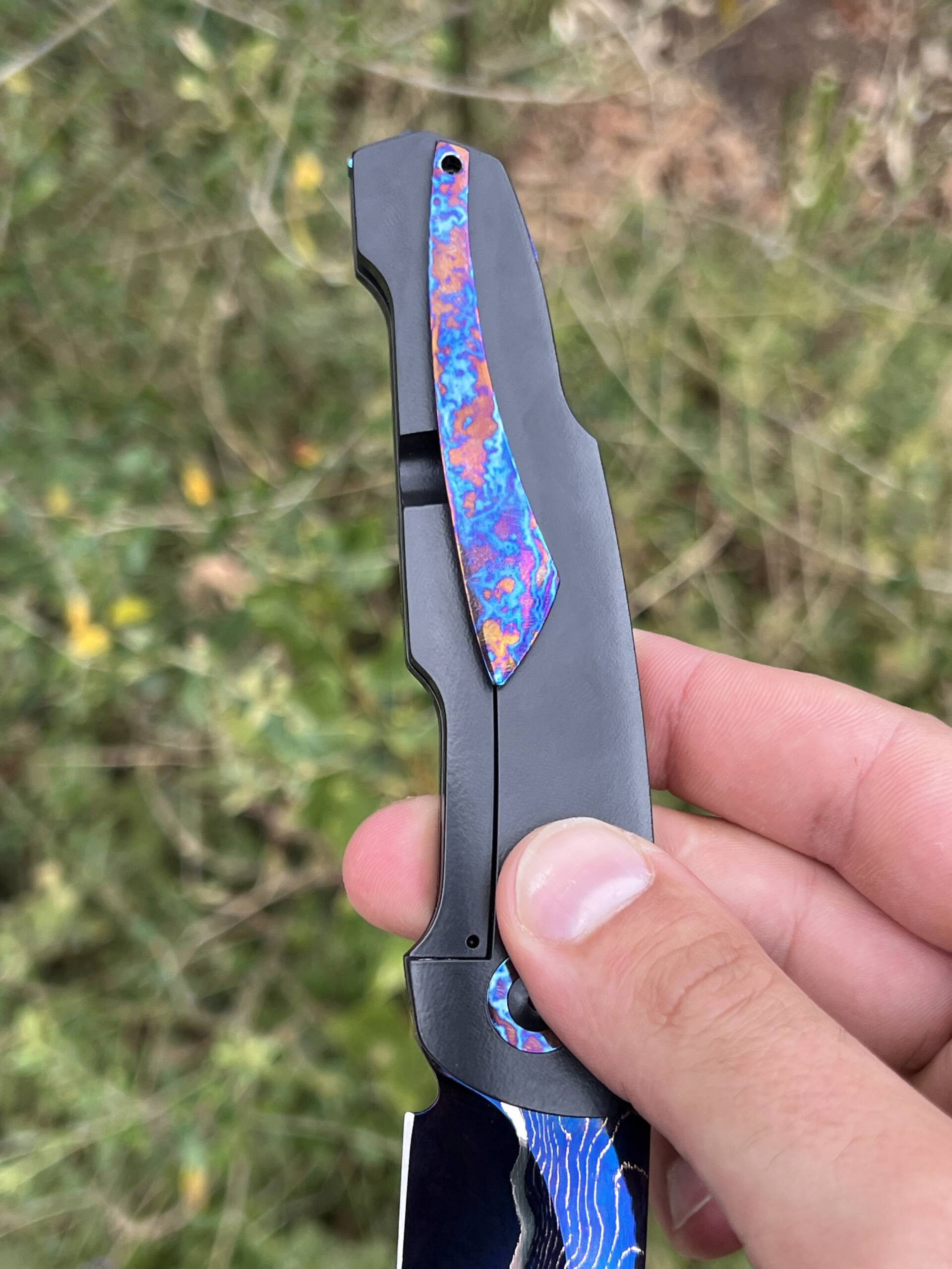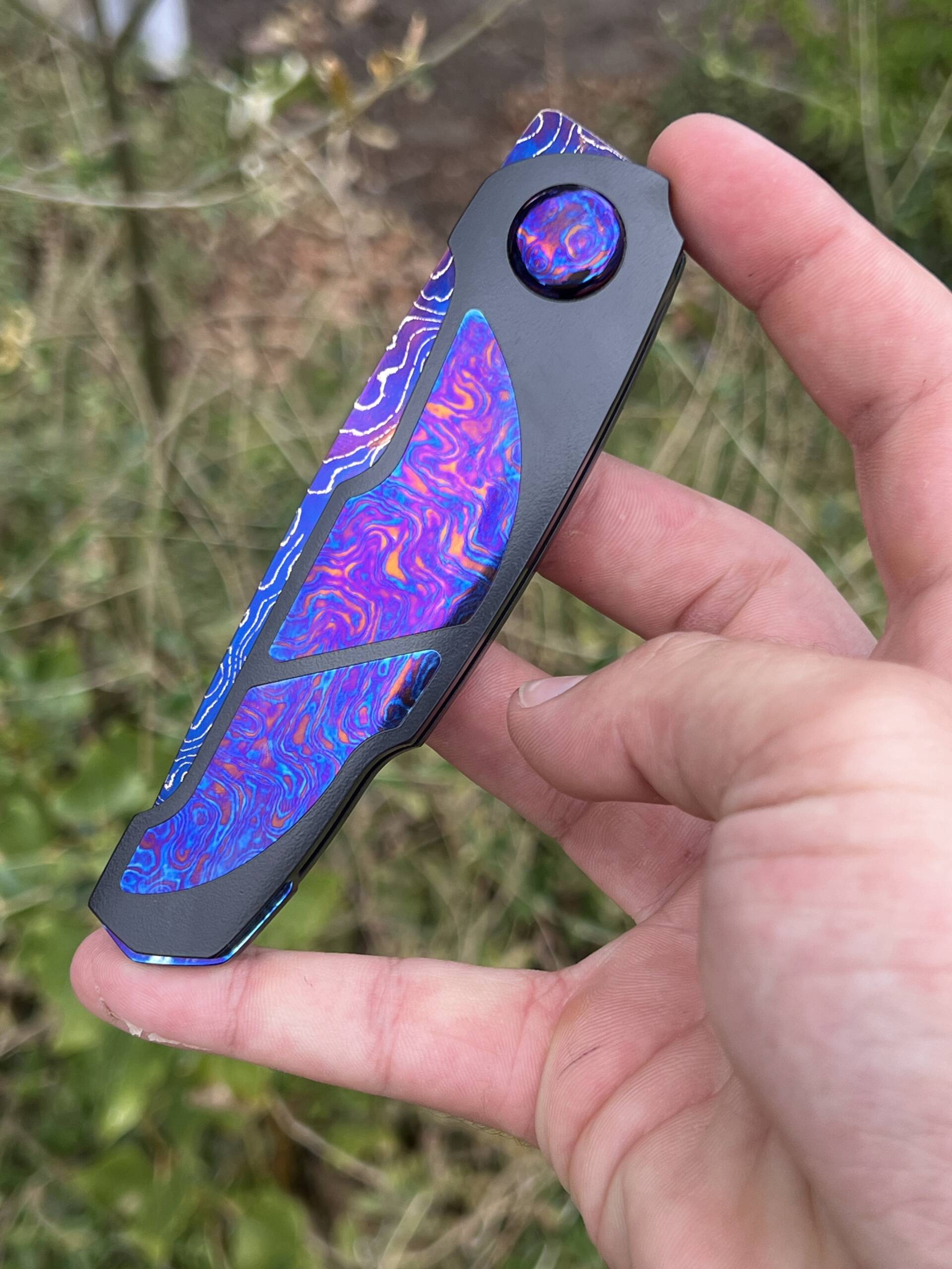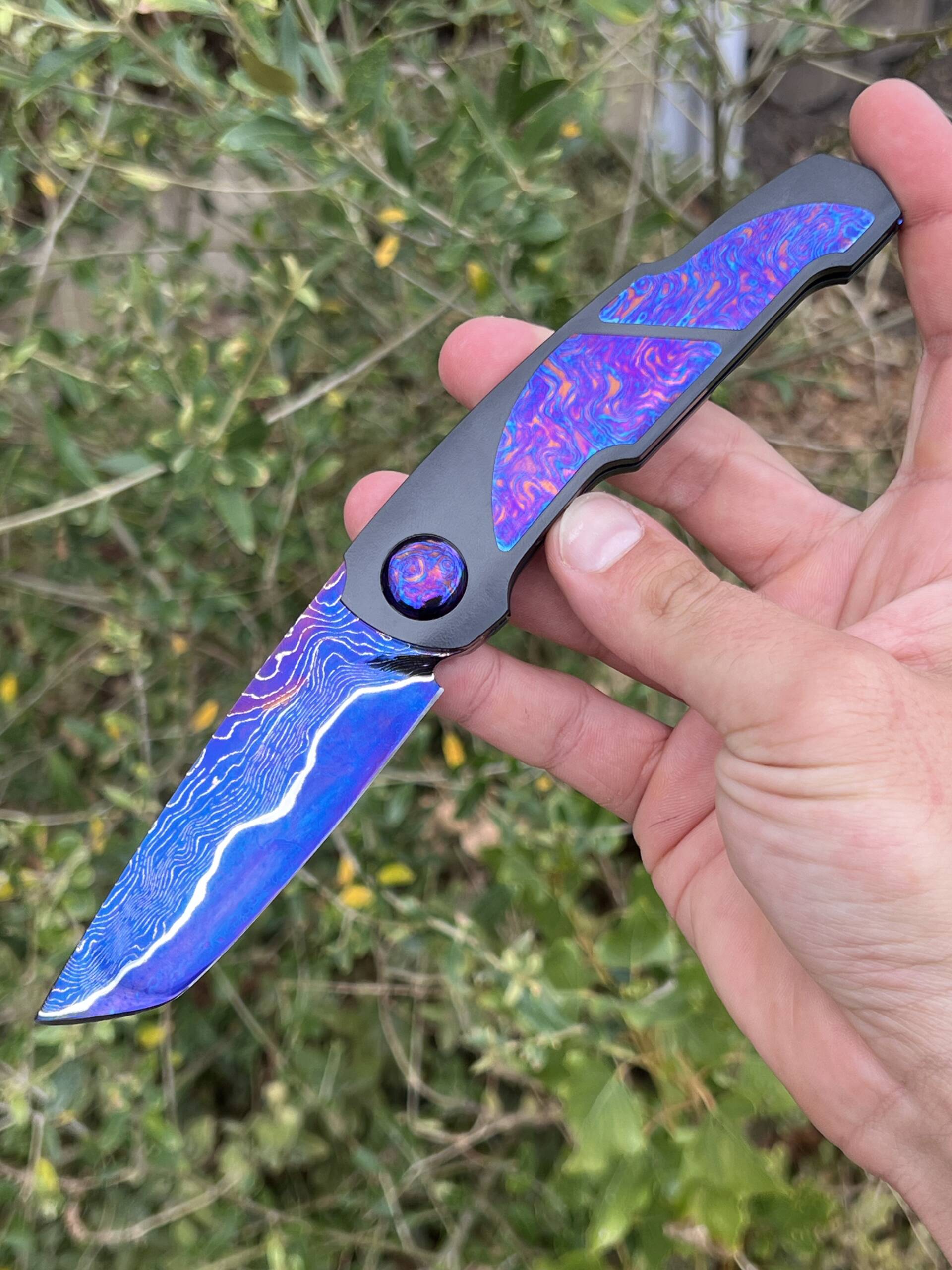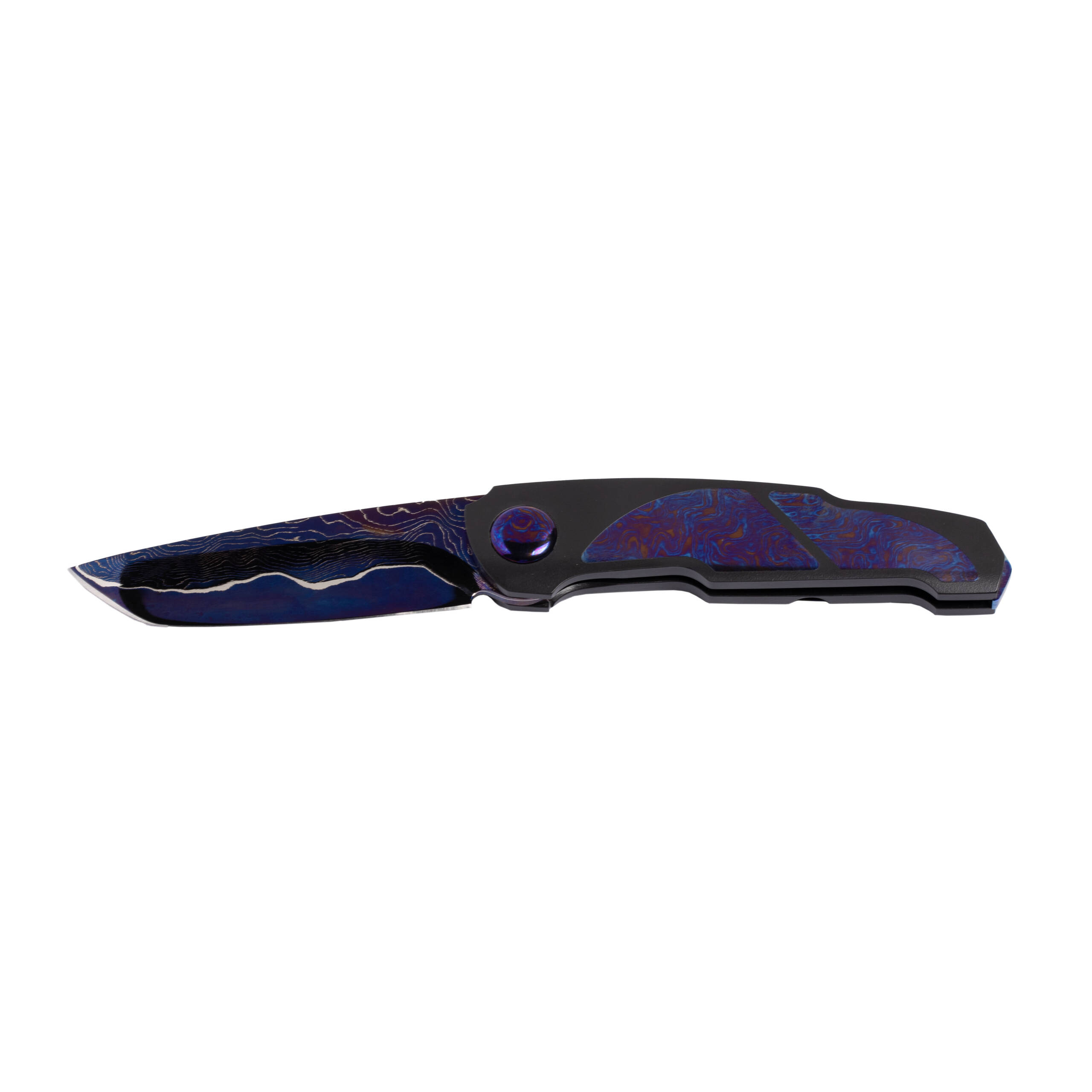 Constructed with 6AL4V titanium hardware finished in Cerakote, the knife maintains durability while preserving a refined, tactical aesthetic. Kraken Timascus details elevate this piece into true full dress territory — showcased in the collars, twin pocket inserts, backspacers, and pocket clip. Each Timascus component introduces depth, color variation, and individuality.