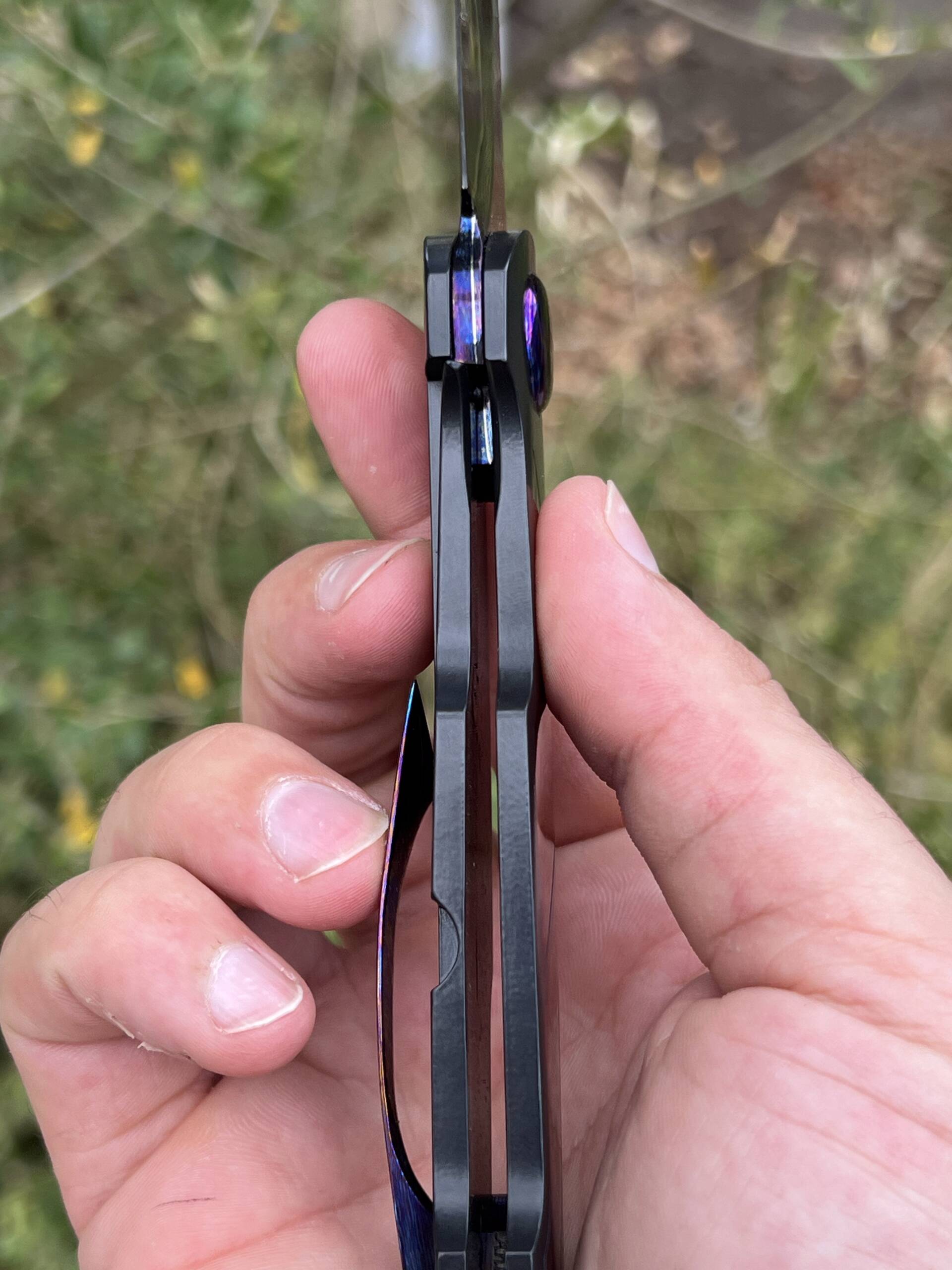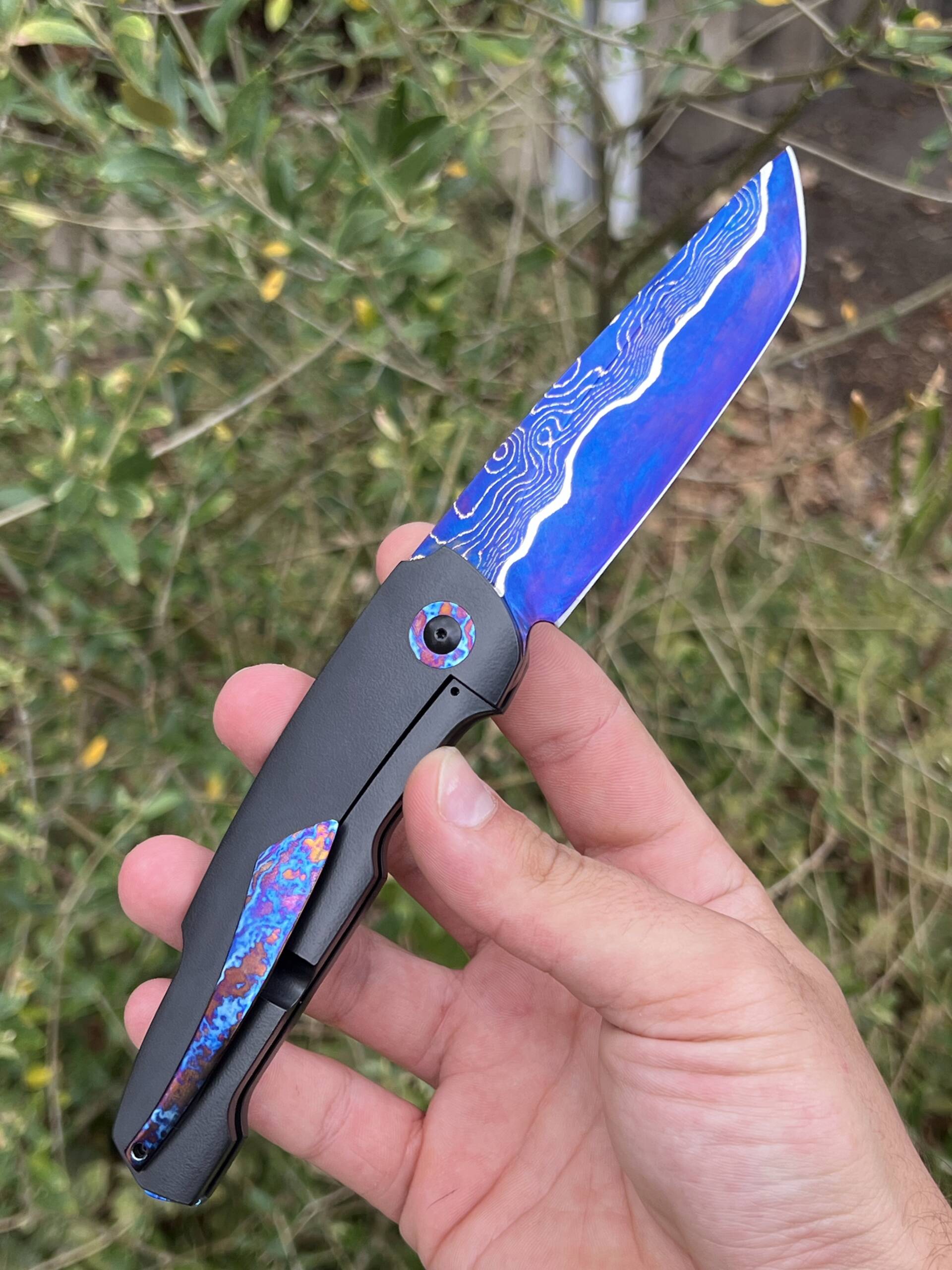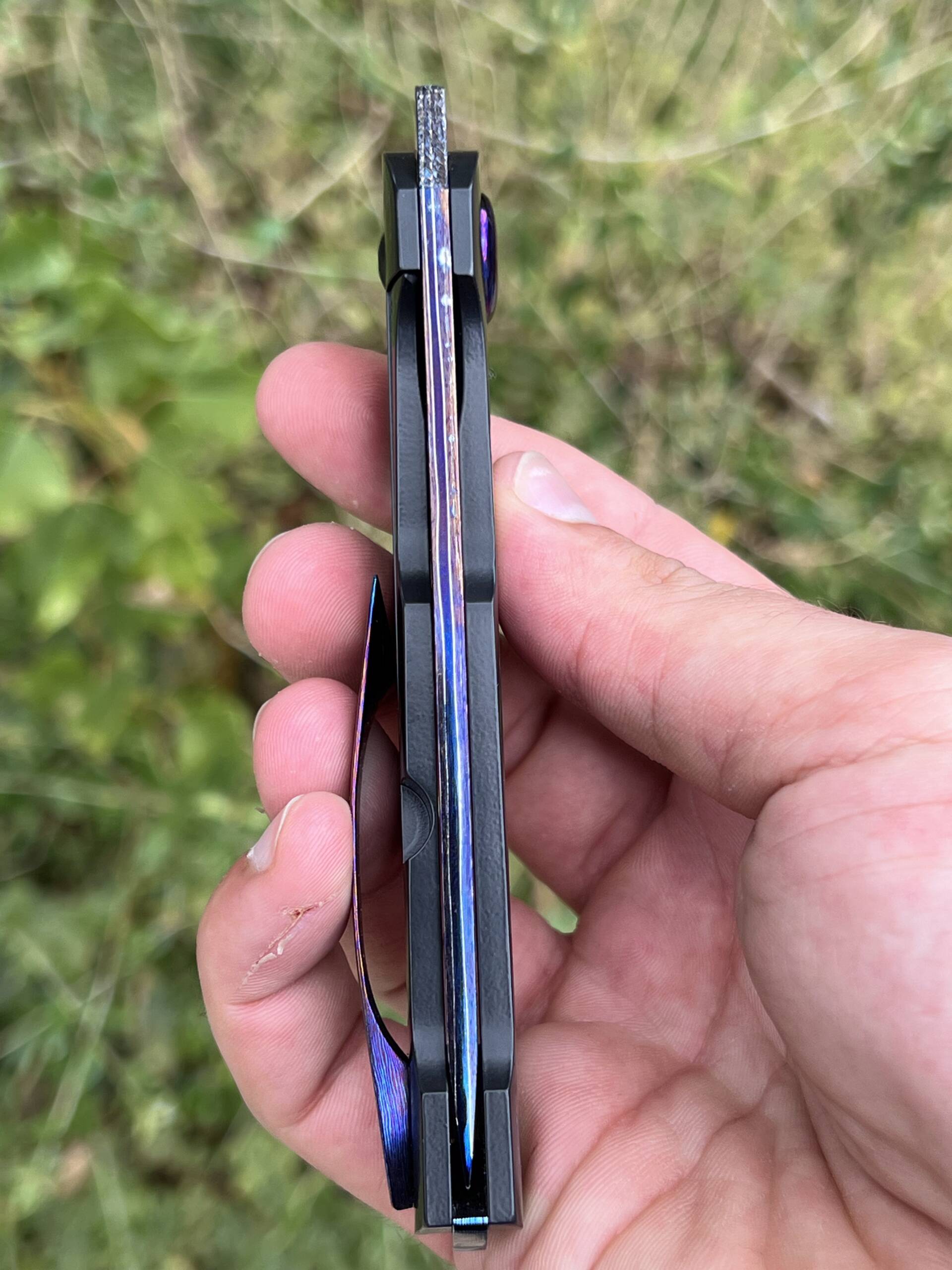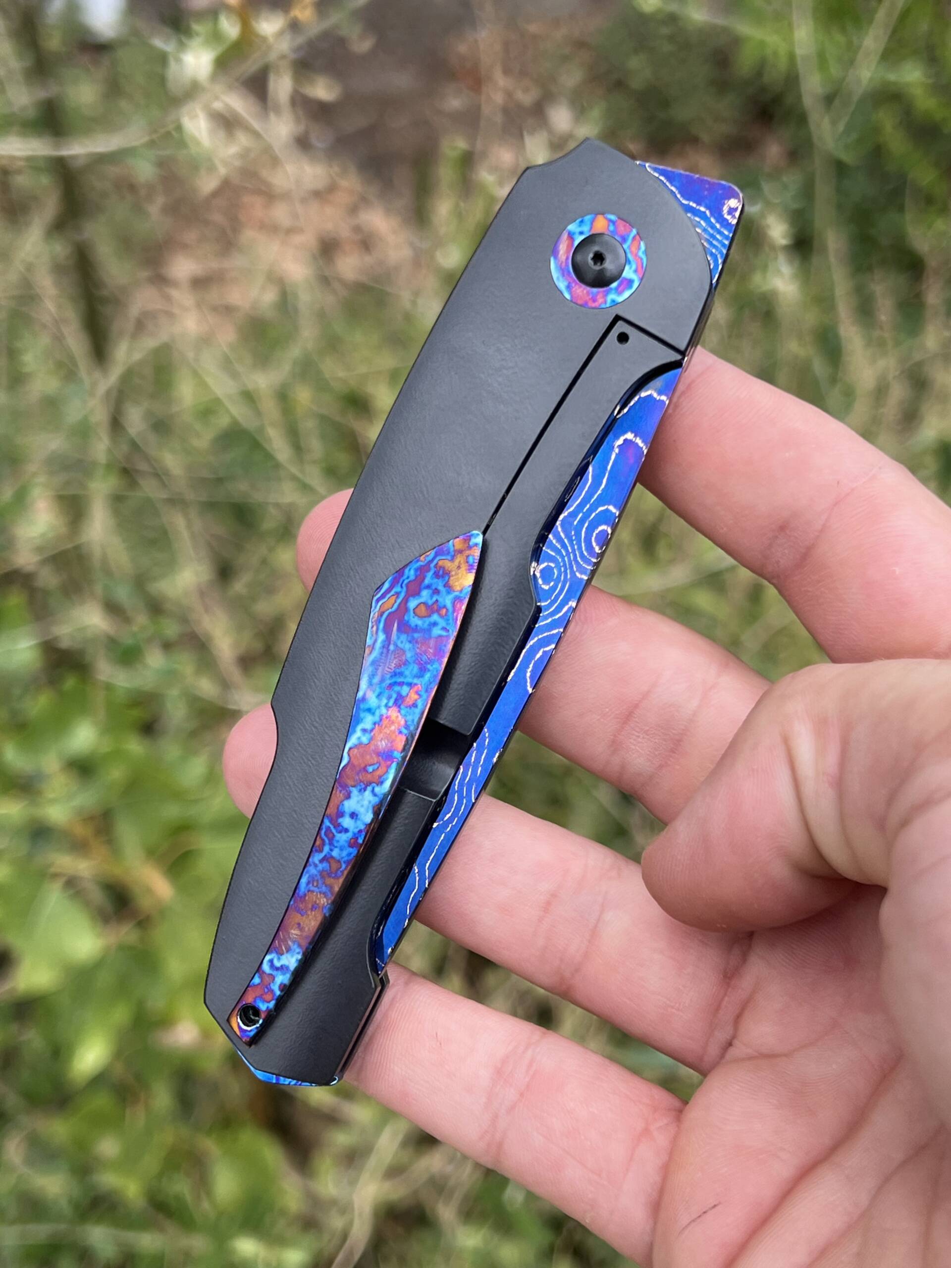 Constructed with 6AL4V titanium hardware finished in Cerakote, the knife maintains durability while preserving a refined, tactical aesthetic. Kraken Timascus details elevate this piece into true full dress territory — showcased in the collars, twin pocket inserts, backspacers, and pocket clip. Each Timascus component introduces depth, color variation, and individuality.