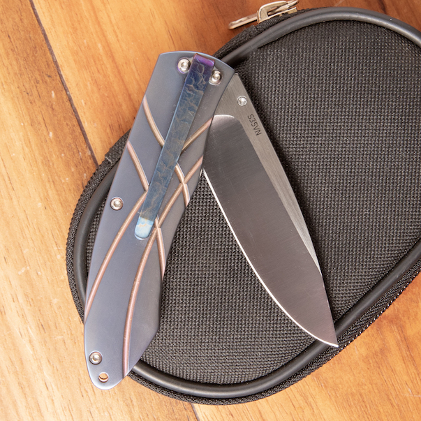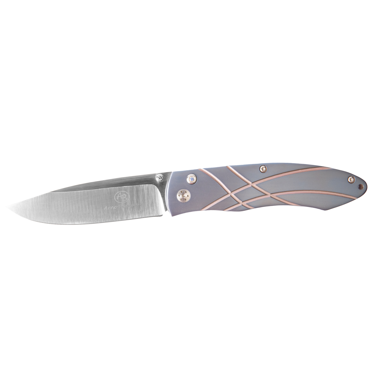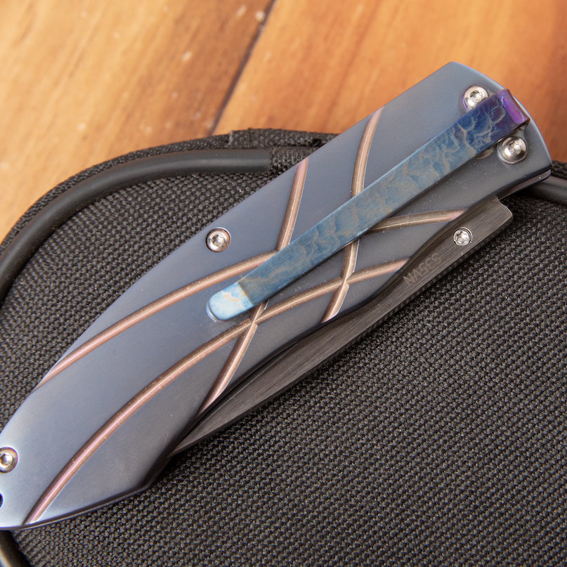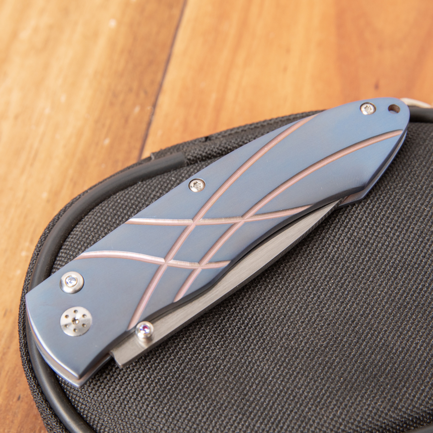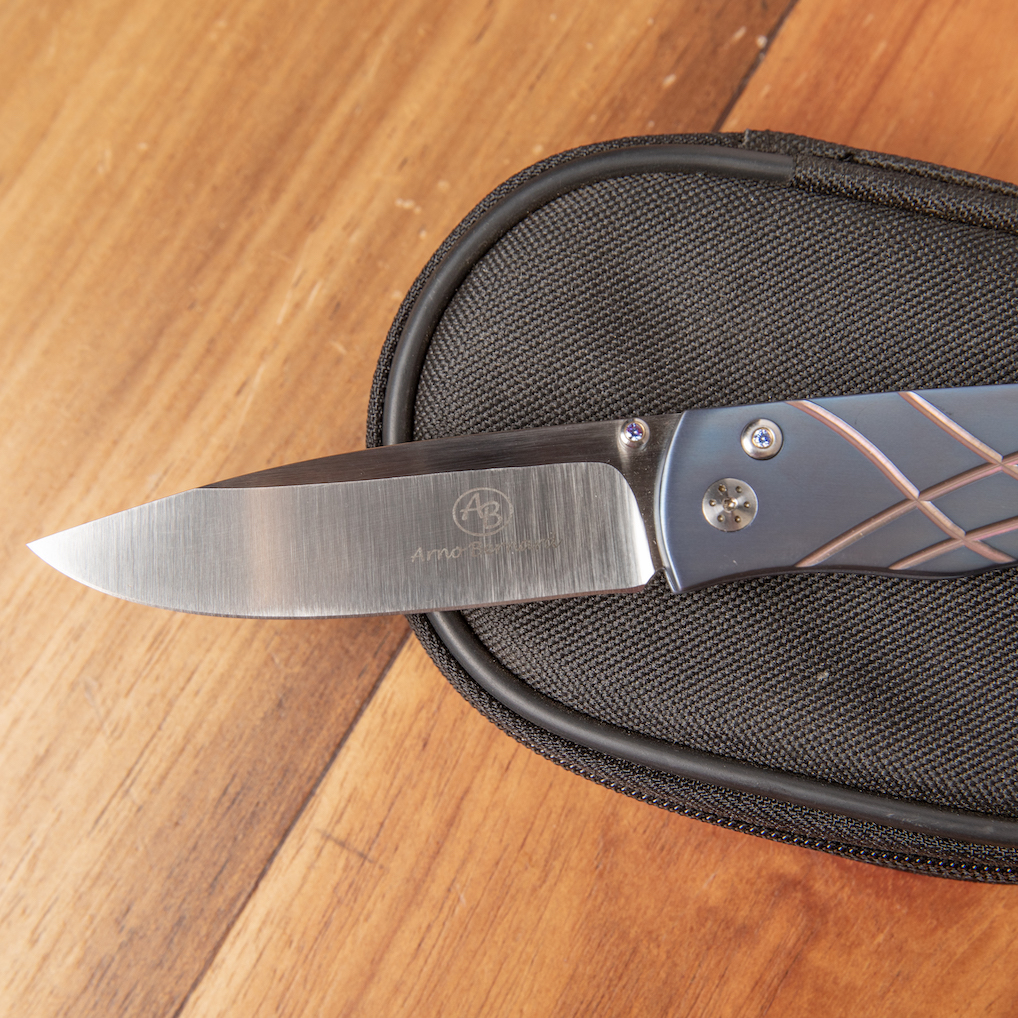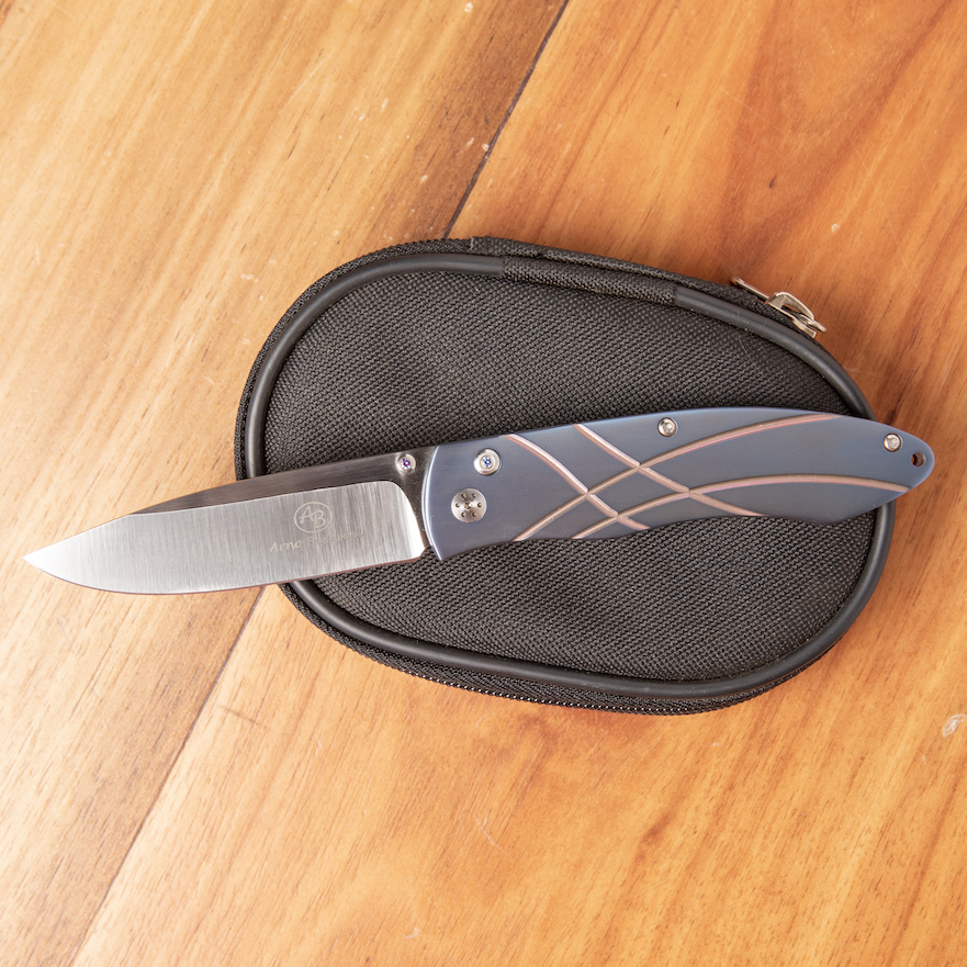 This Arno Bernard Folder combines refined design with high-performance materials. Featuring a blue anodized titanium handle and a blue flamed pocket clip, it balances style and functionality. The S35VN steel blade delivers exceptional sharpness and durability, perfect for everyday carry and precision tasks.