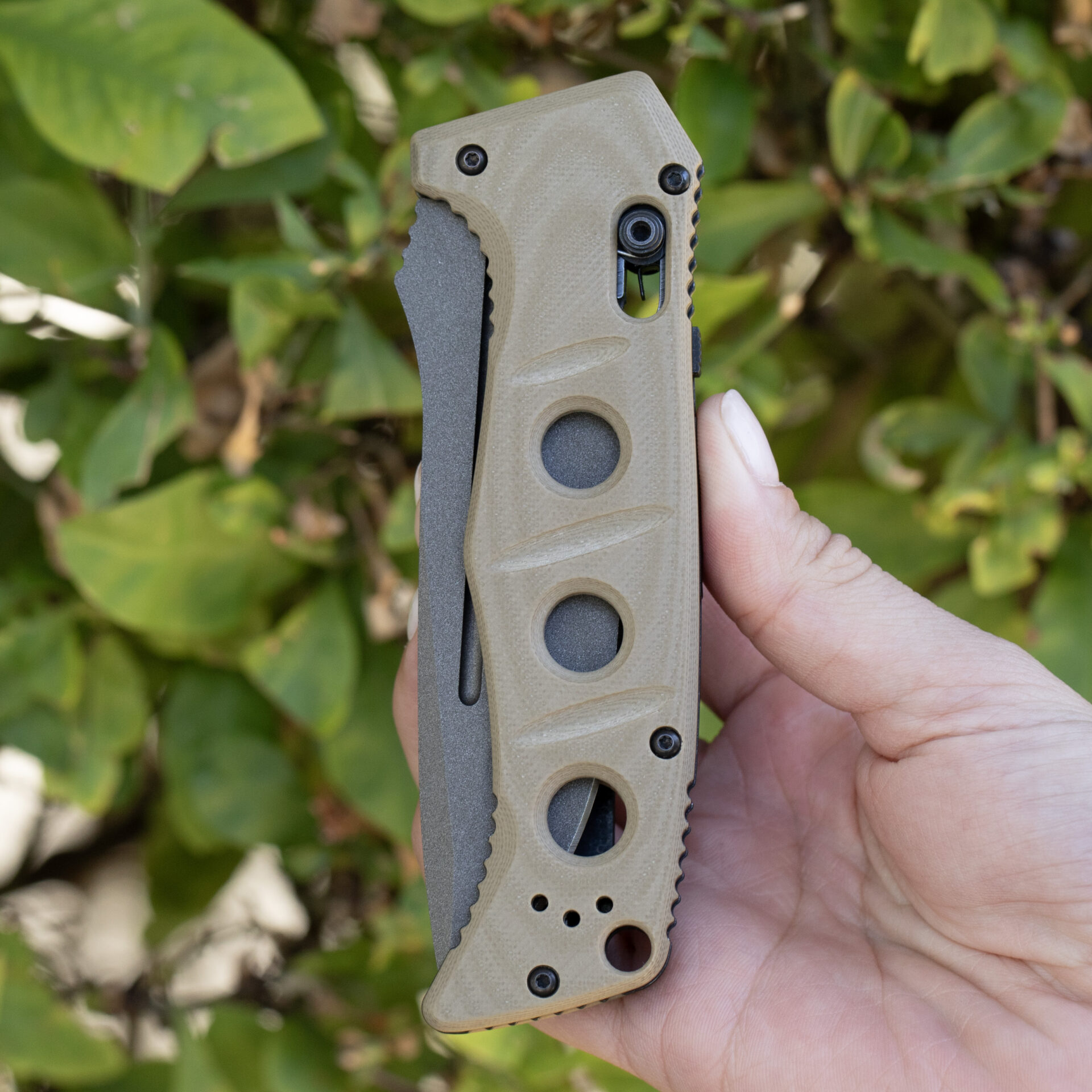 The G10 handle in Desert Tan not only complements the rugged aesthetic but also provides a secure grip, ensuring precise control in any situation. The handle is further reinforced with a thickness of 0.65 inches, offering a substantial feel without sacrificing comfort. The deep-carry pocket clip, finished in Black Oxide and positioned for tip-up carry, ensures discreet and secure transportation.