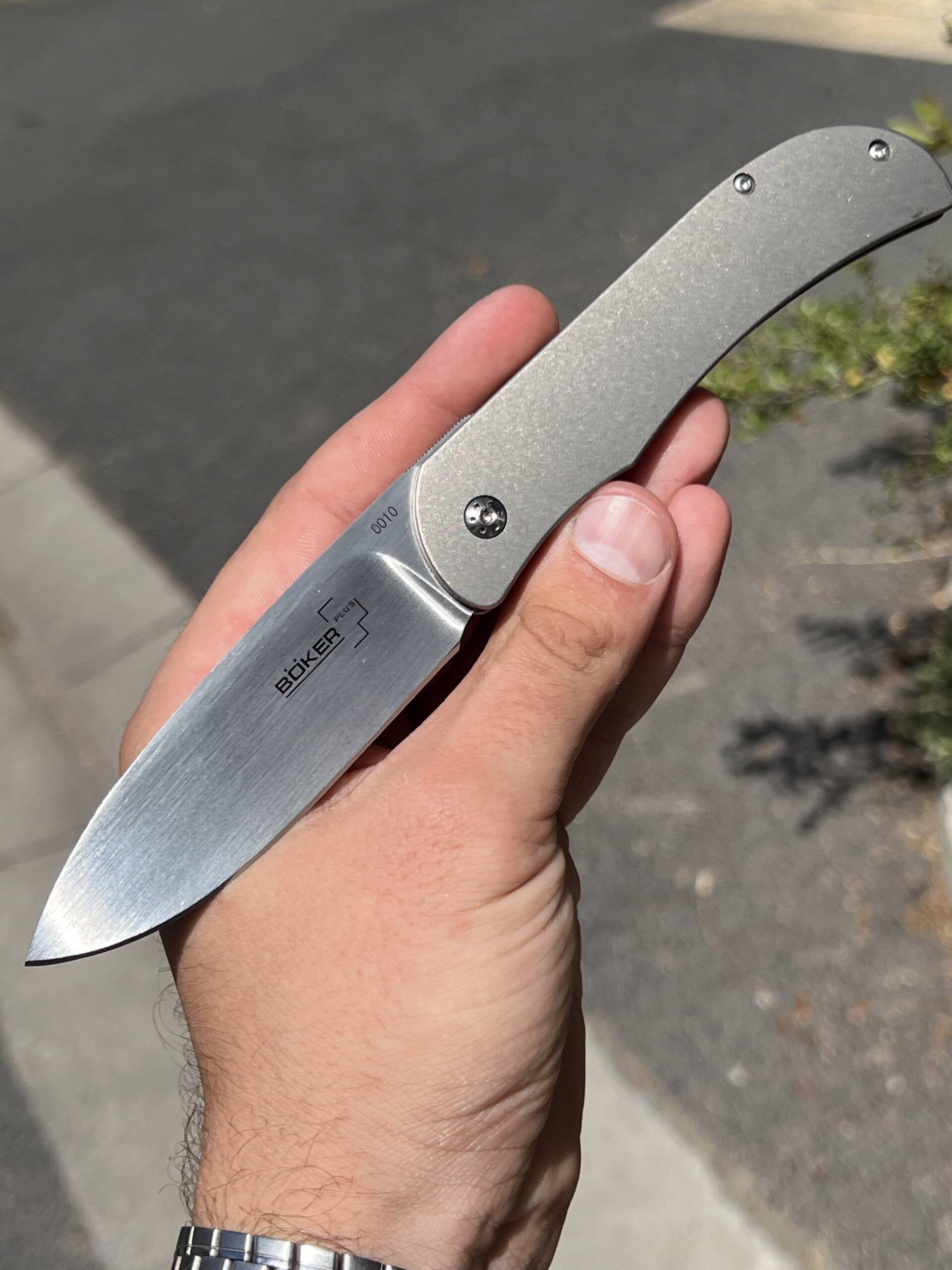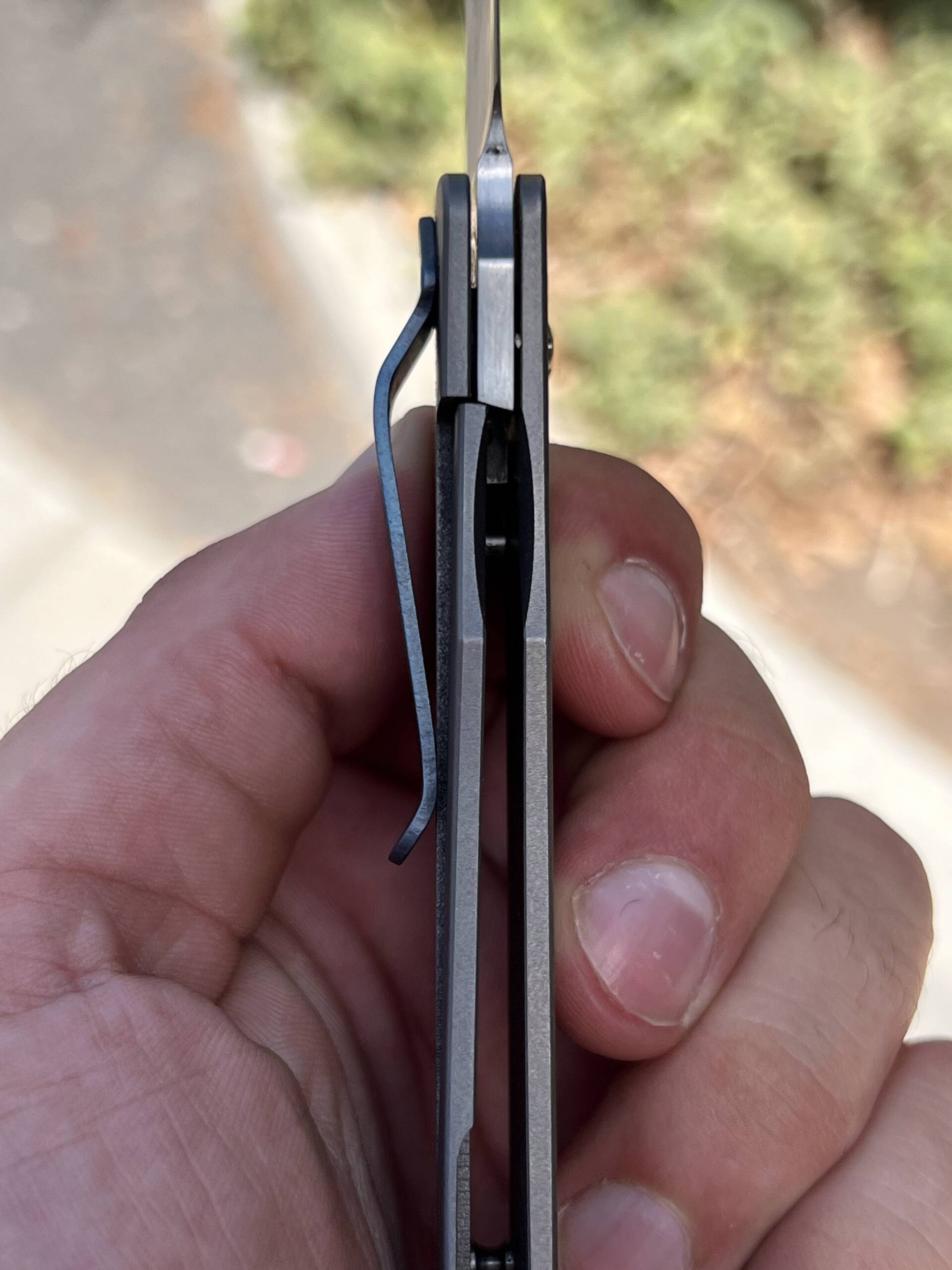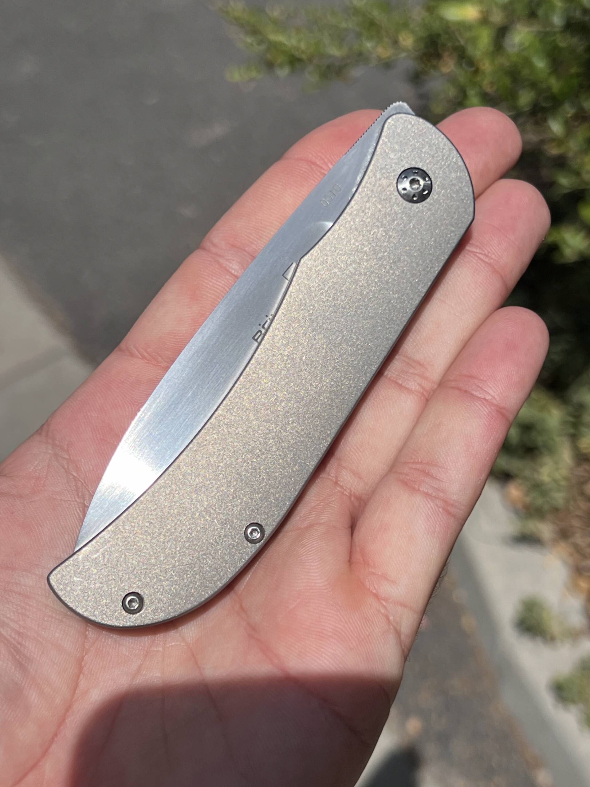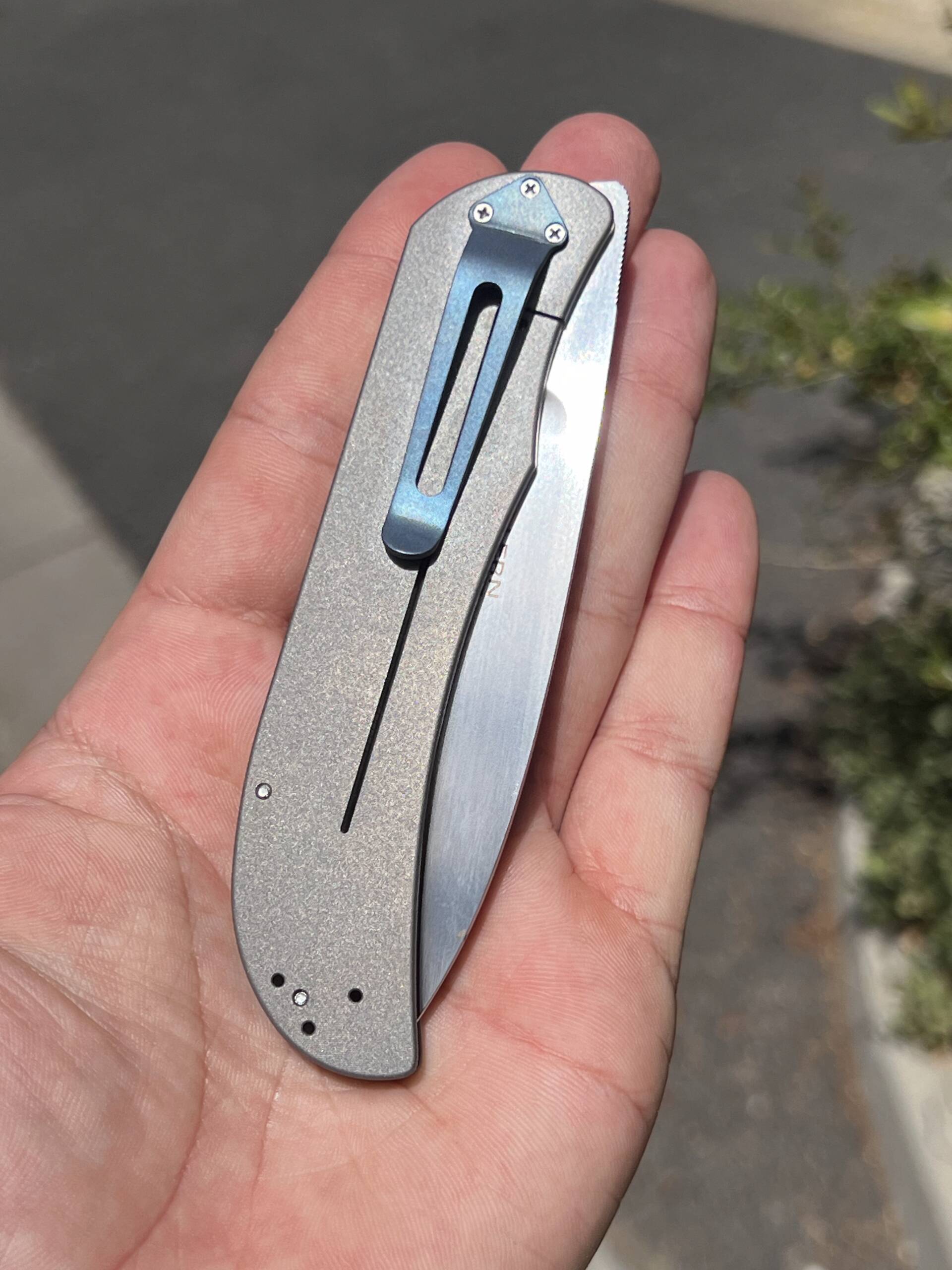 - Handle: Lightweight titanium scales with a matte bead blast finish and rock-solid frame lock mechanism. Closed length: 4 5/8″. Total weight remains impressively low for all-day comfort.
