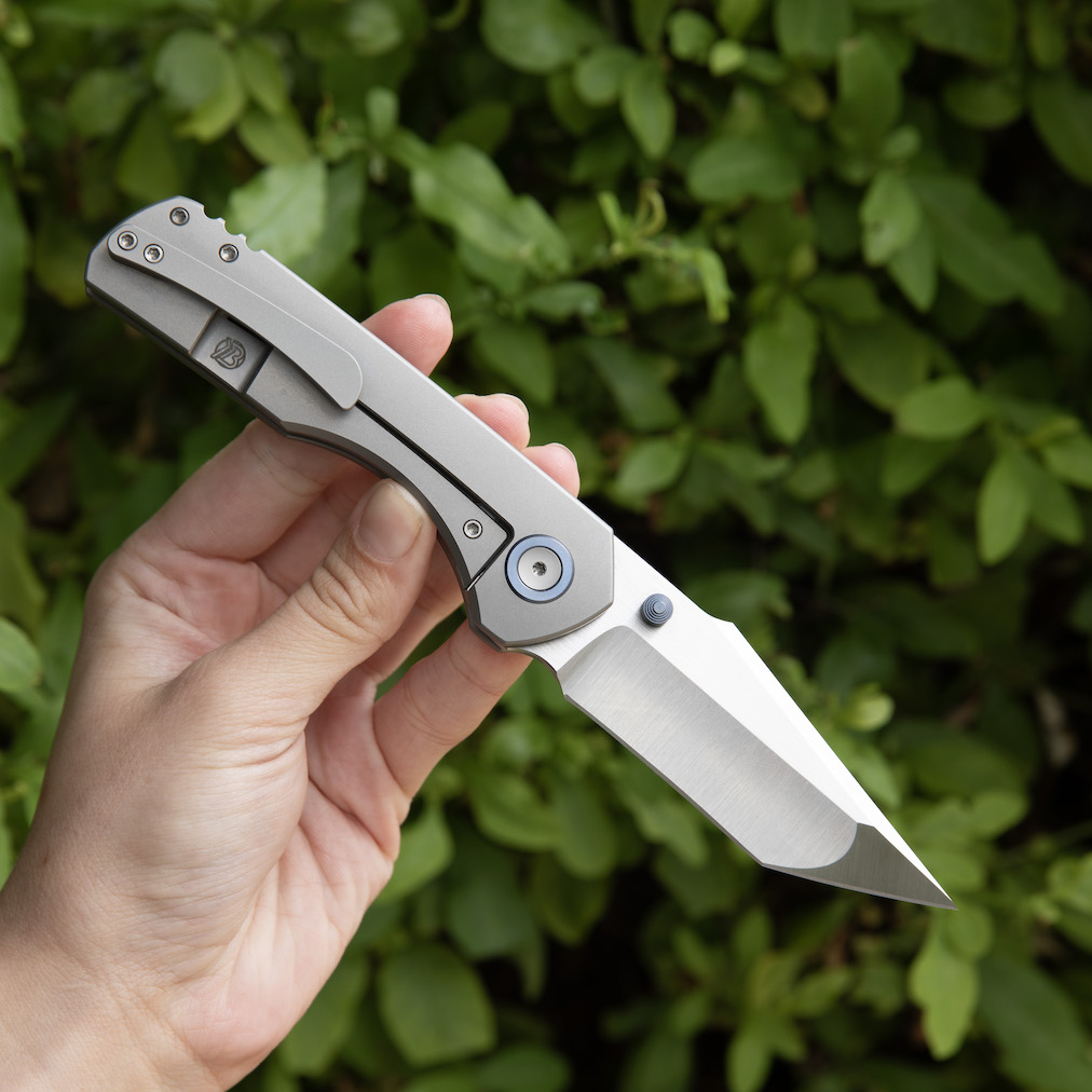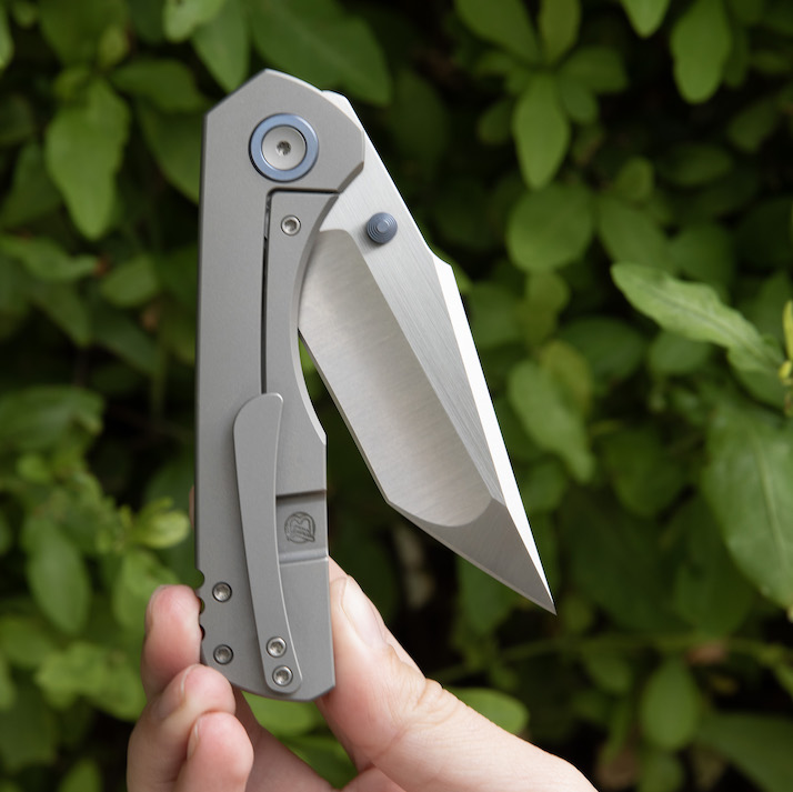 | Pivot: | Custom-designed "pivot island" two-tone finished titanium, blasted titanium torx screw on slip side with anodized titanium collar |