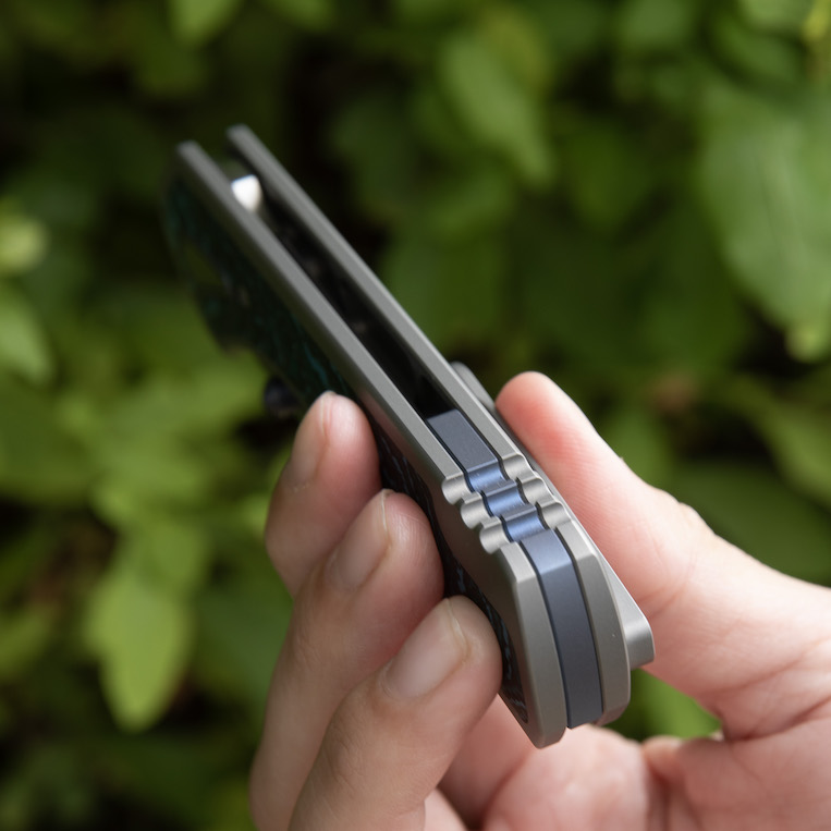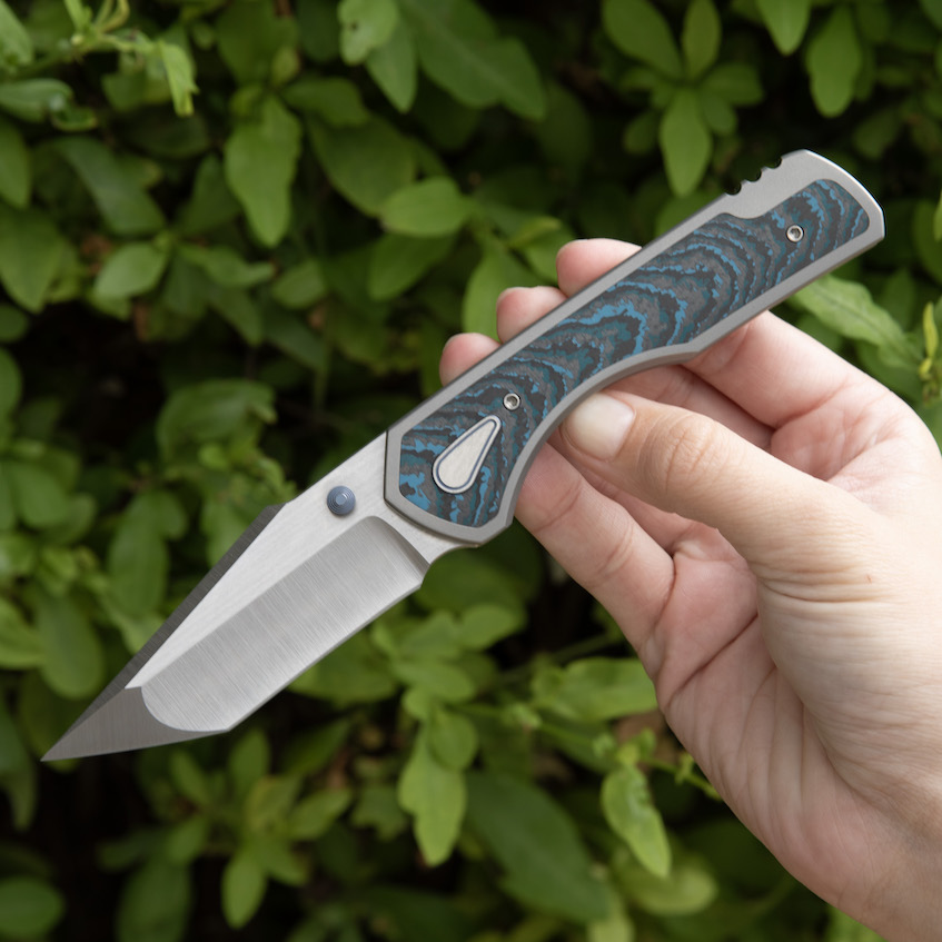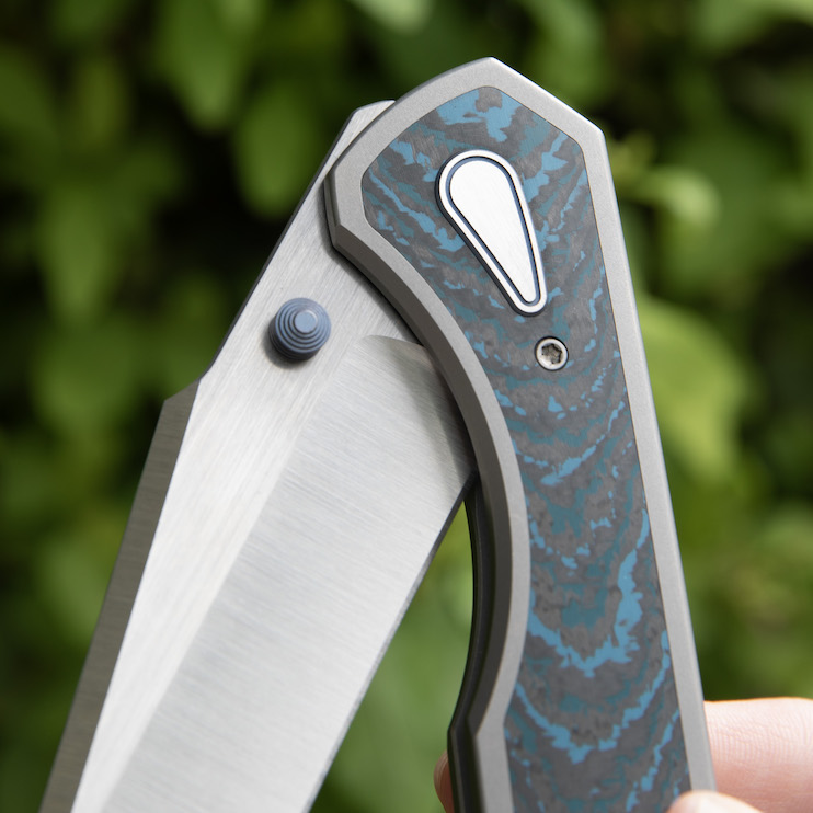 | Scales/Handle: | Blasted Titanium with Fat Carbon Crosscut Arctic Storm inlay |
