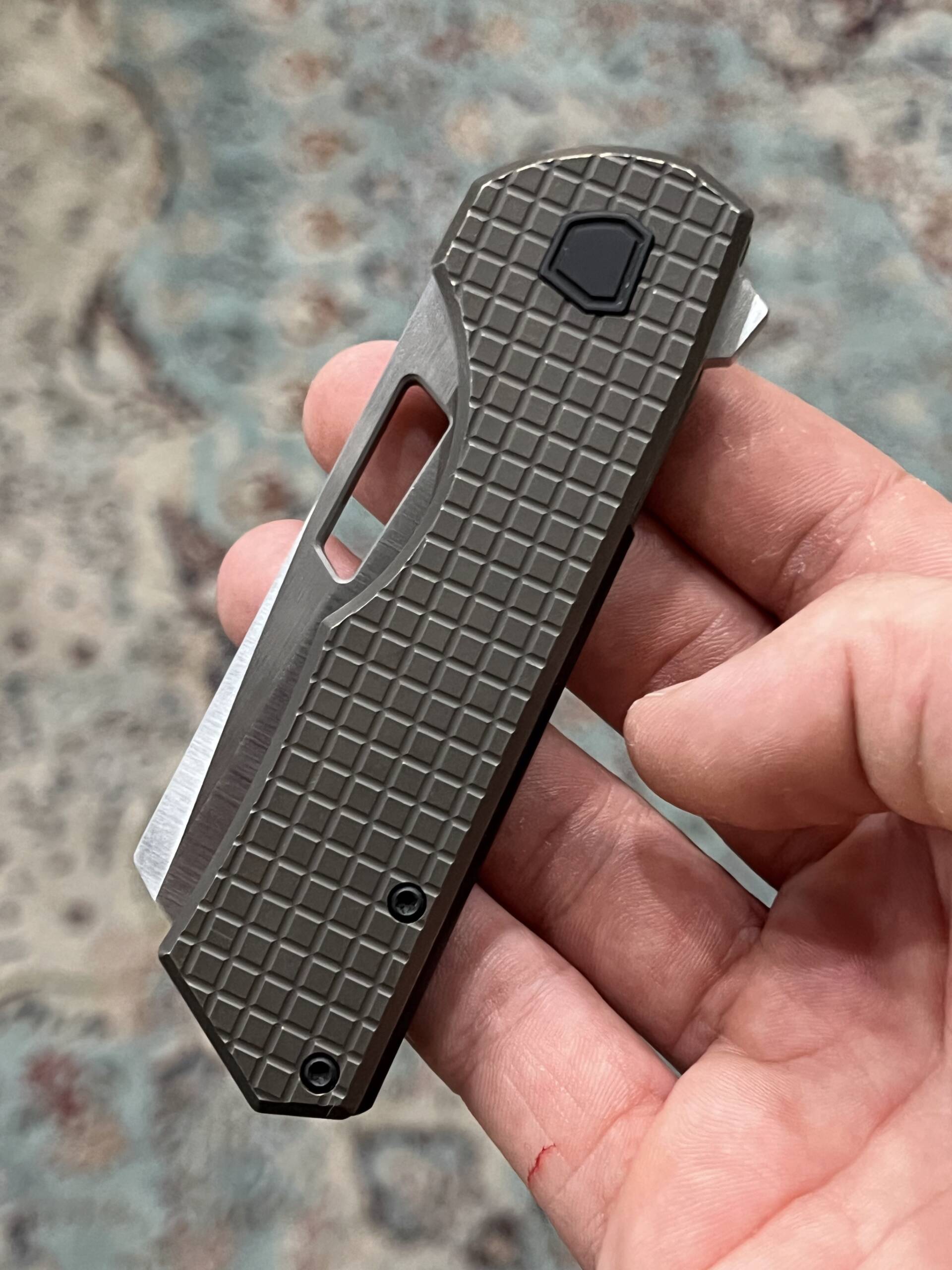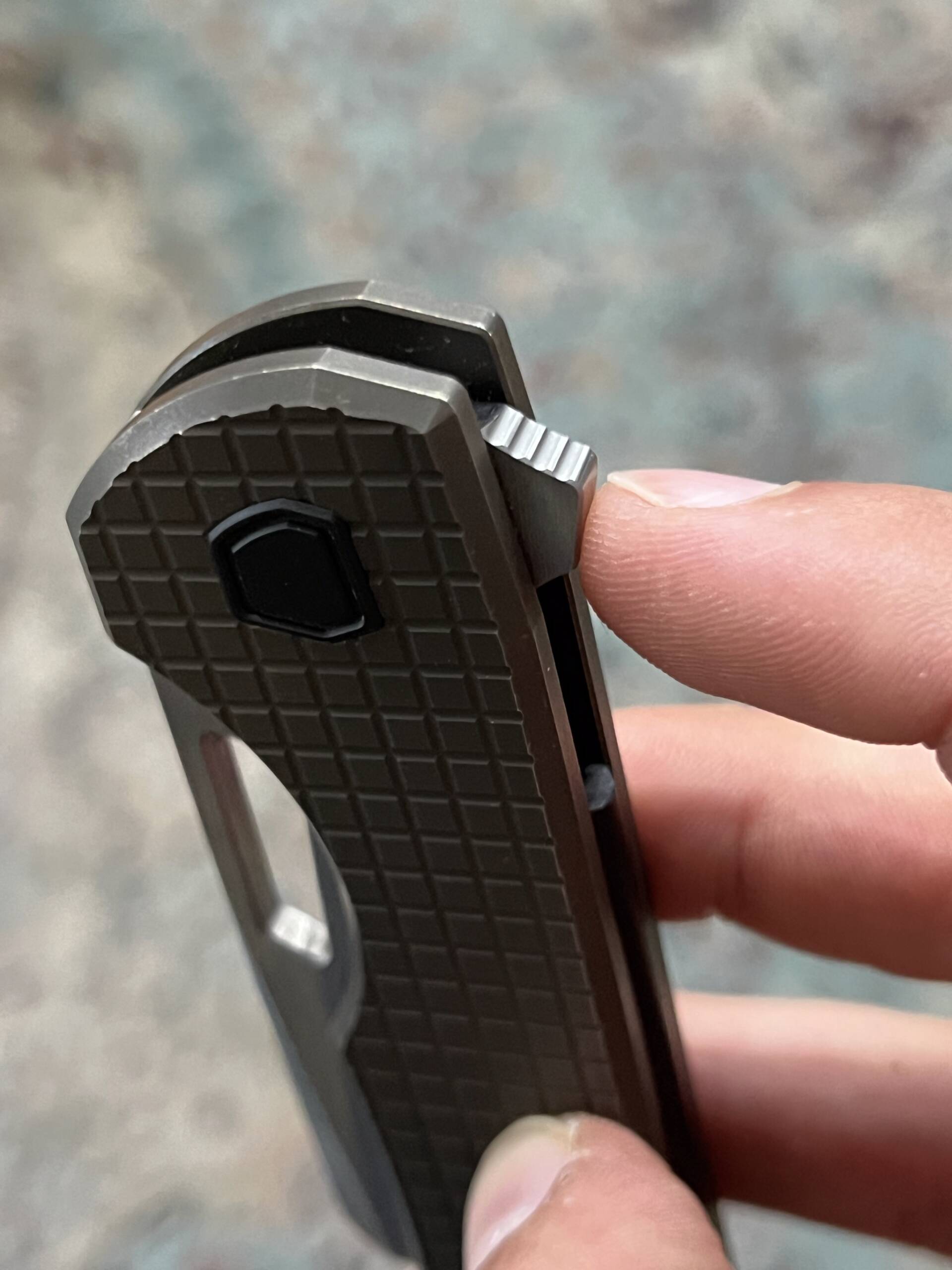 The titanium framelock handle is finished in a dark bronze anodized frag pattern, delivering excellent grip without adding bulk. Details like the black PVD titanium backspacer, PVD hardware, and matching titanium pocket clipcomplete the build with a stealthy, high-end aesthetic. Fast flipper deployment and solid lockup make the Yeager-M V3 a true everyday carry knife — and a standout piece in any collection.