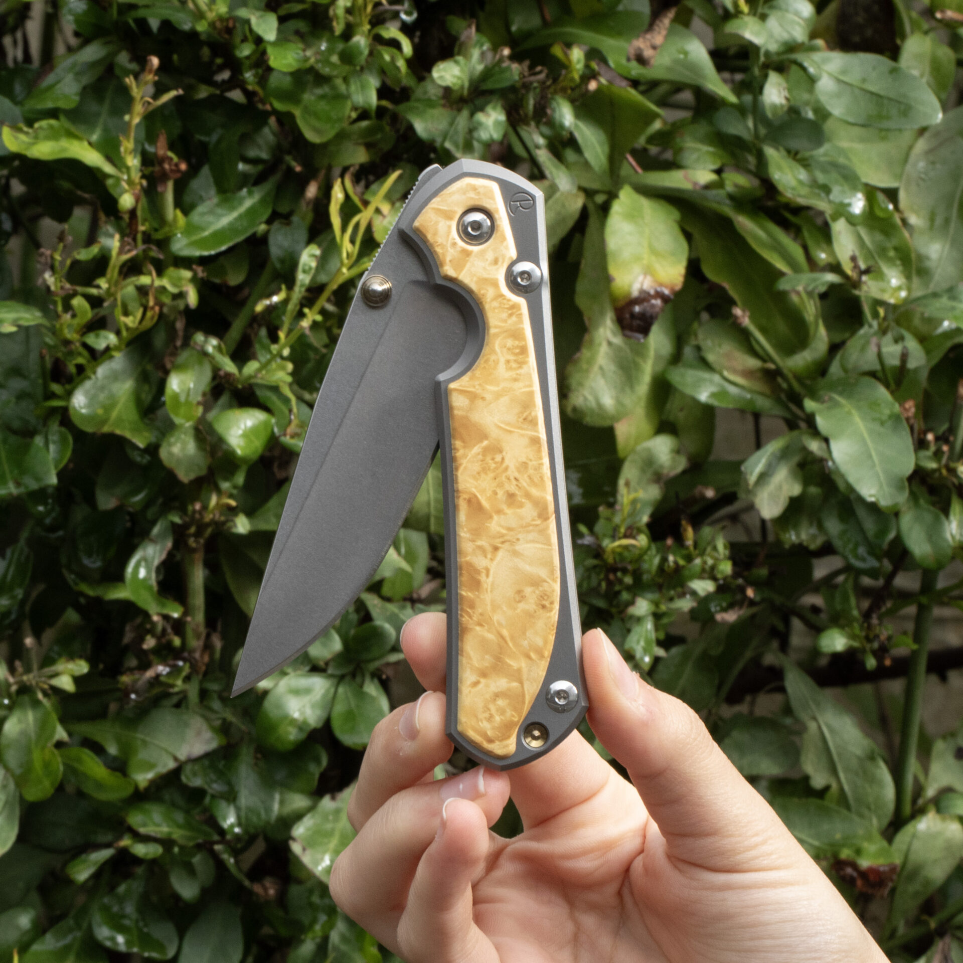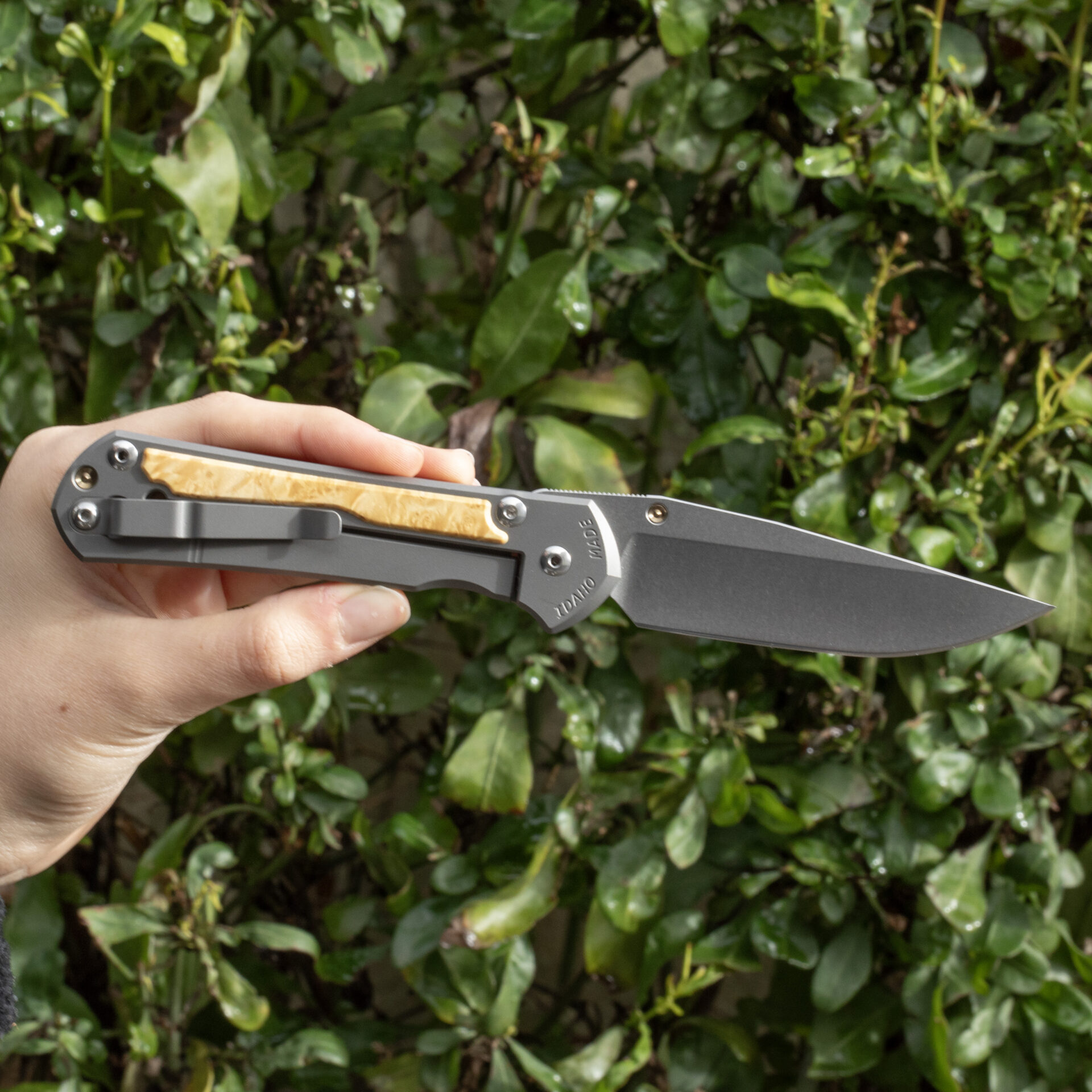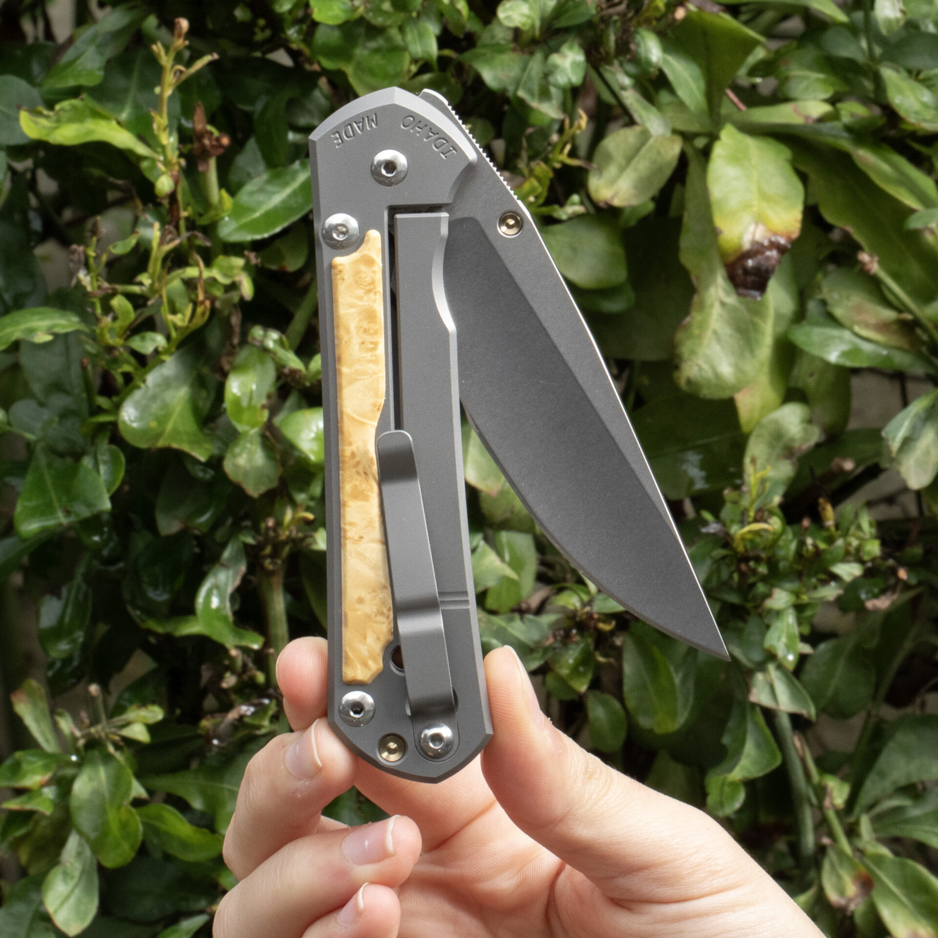 Ergonomically designed for comfort and control, the handle features sandblasted 6A|4V titanium scales, offering a robust yet lightweight grip. The Box Elder wood inlays add a touch of natural beauty and sophistication, making each knife unique with its distinct grain patterns.