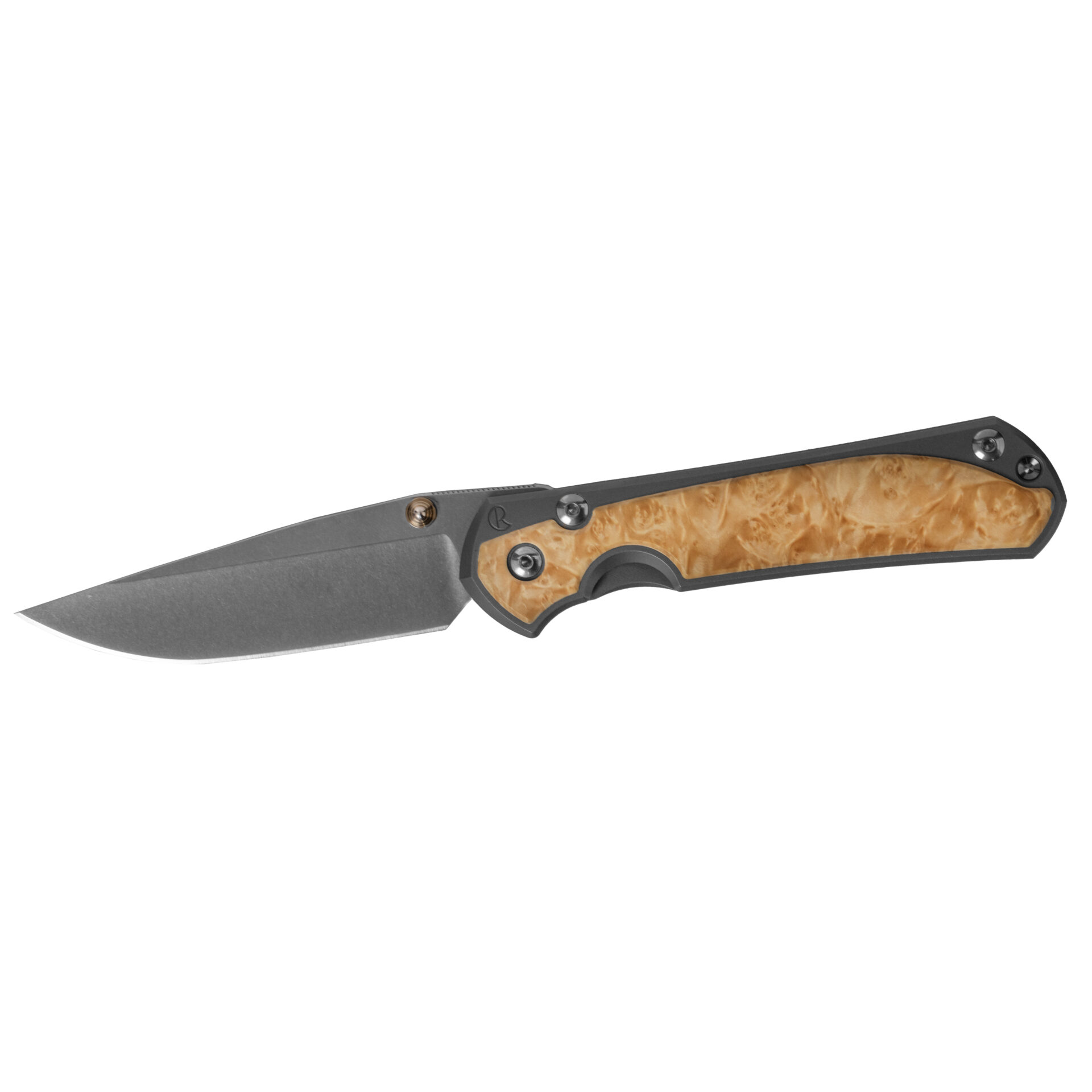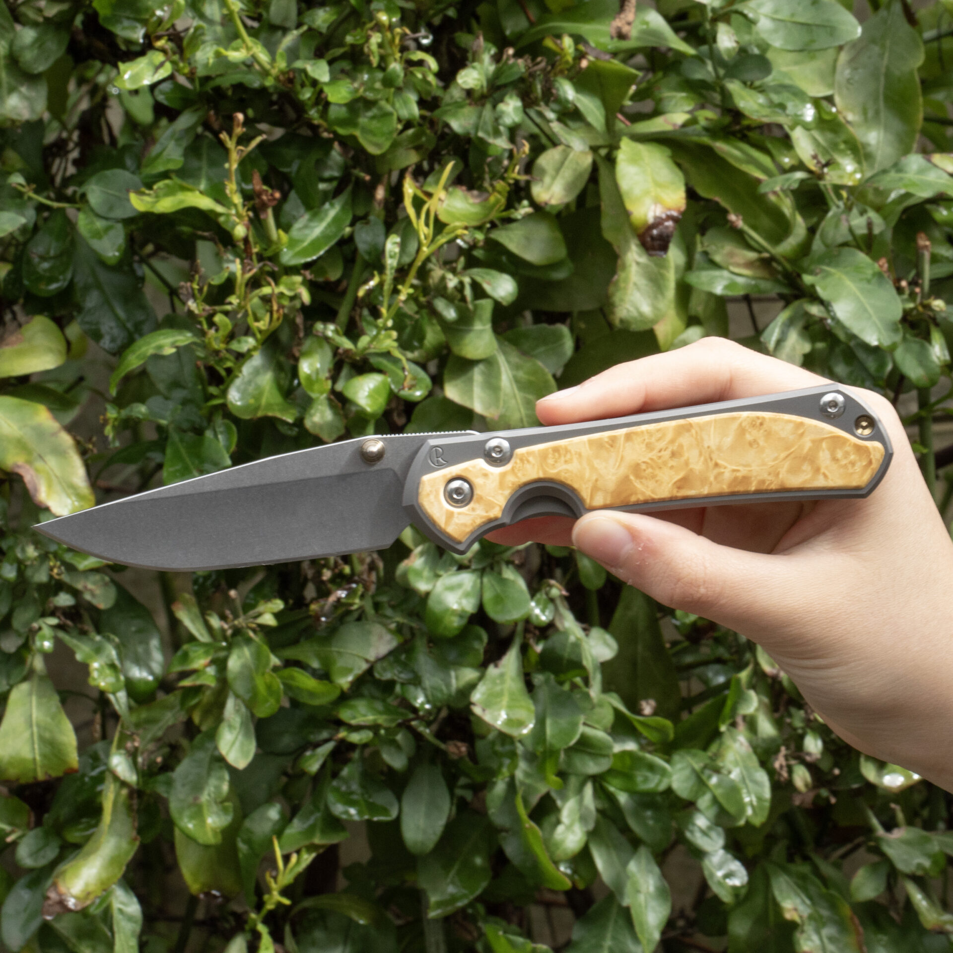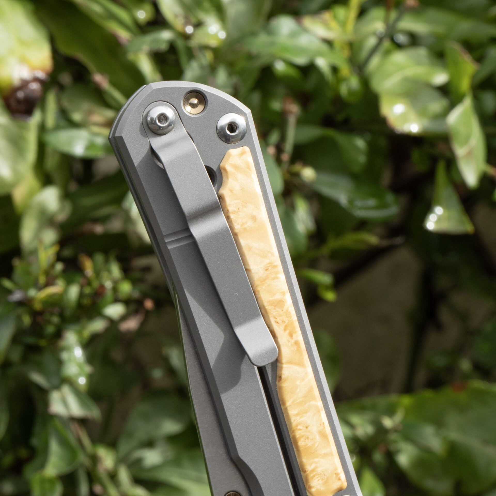 Ergonomically designed for comfort and control, the handle features sandblasted 6A|4V titanium scales, offering a robust yet lightweight grip. The Box Elder wood inlays add a touch of natural beauty and sophistication, making each knife unique with its distinct grain patterns.