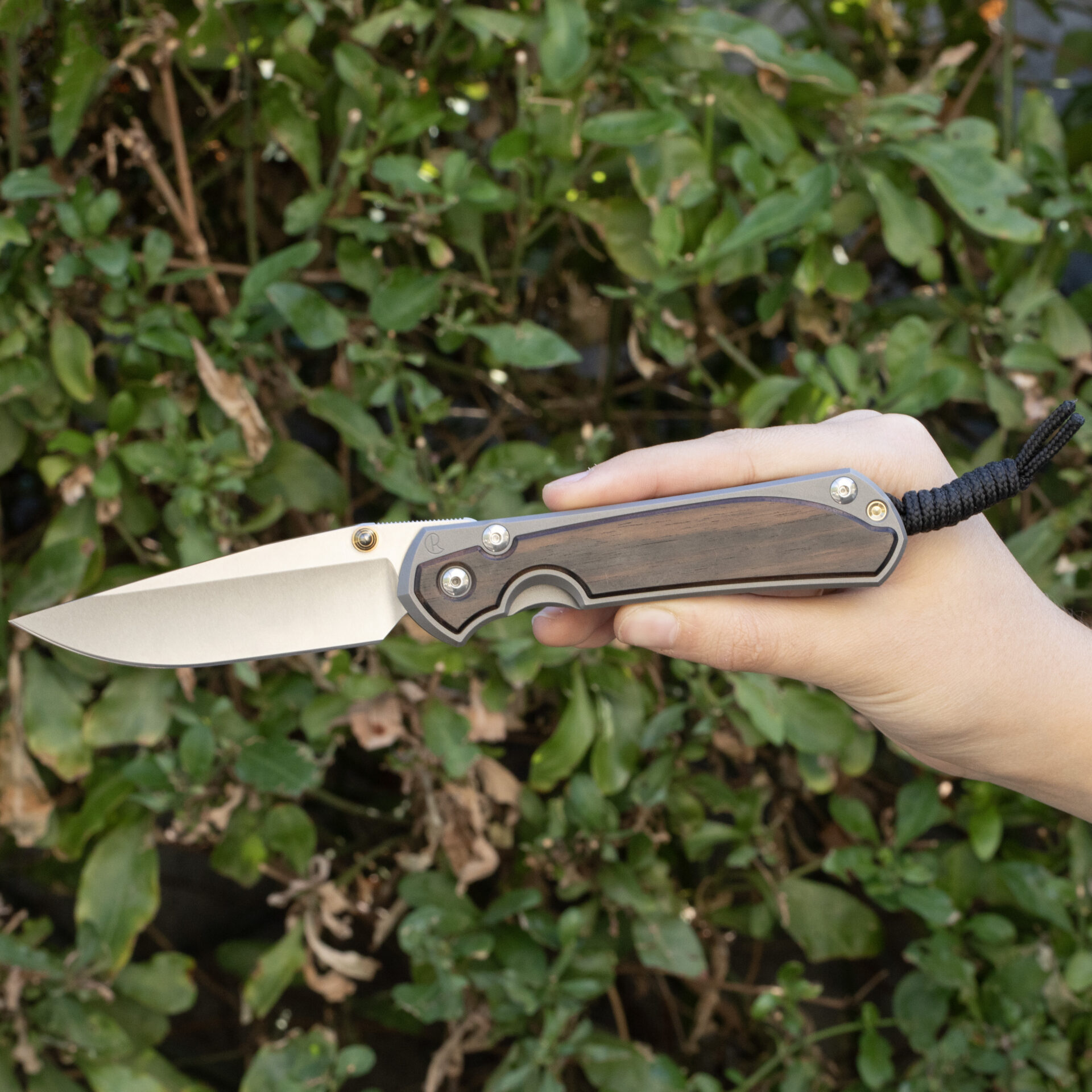 Its handle is a work of art unto itself, fashioned from bead-blasted titanium and adorned with elegant Ebony inlays, offering a secure and comfortable grip that’s as visually stunning as it is functional.