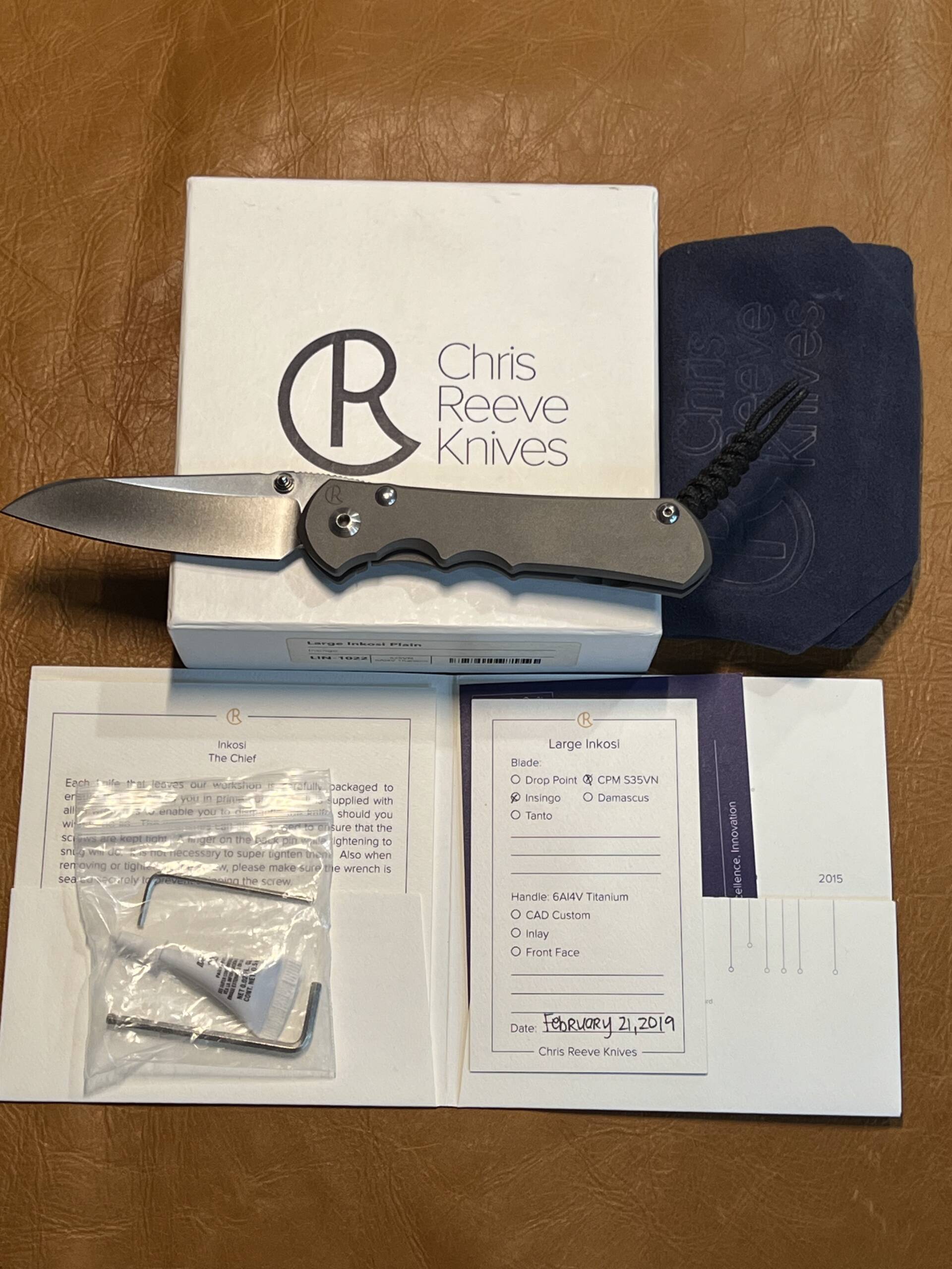 Or as low as R2,656.25 / month interest-free, using your existing credit card. For orders over R100.00.How it worksThe Large Inkosi Insingo (LIN-1022) is a premium folding knife from Chris Reeve Knives, featuring a 3.6″ CPM S35VN Insingo blade and 6Al4V titanium handles. Built with the innovative Reeve Integral Lock (RIL) with ceramic ball interface, this knife delivers exceptional strength, smooth action, and lifetime reliability. Made in the USA and dated February 21, 2019. Includes original box, pouch, certificate, and tools.