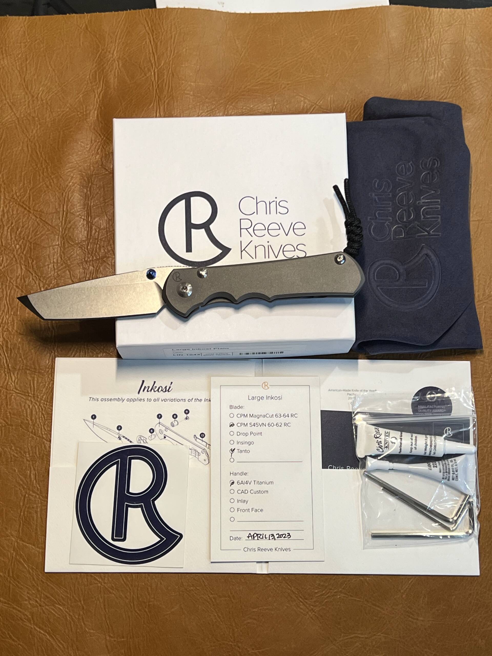 Or as low as R3,125.00 / month interest-free, using your existing credit card. For orders over R100.00.How it worksThe Chris Reeve Large Inkosi Tanto (LIN-1042) is a premium American-made folding knife featuring a robust 3.6″ CPM S45VN Tanto blade and sandblasted 6Al4V titanium handles. Equipped with the renowned Reeve Integral Lock (RIL) with ceramic ball interface, it offers exceptional strength, smooth deployment, and lifetime durability. Manufactured on 13 April 2023. Complete with original box, pouch, certificate, and tools.