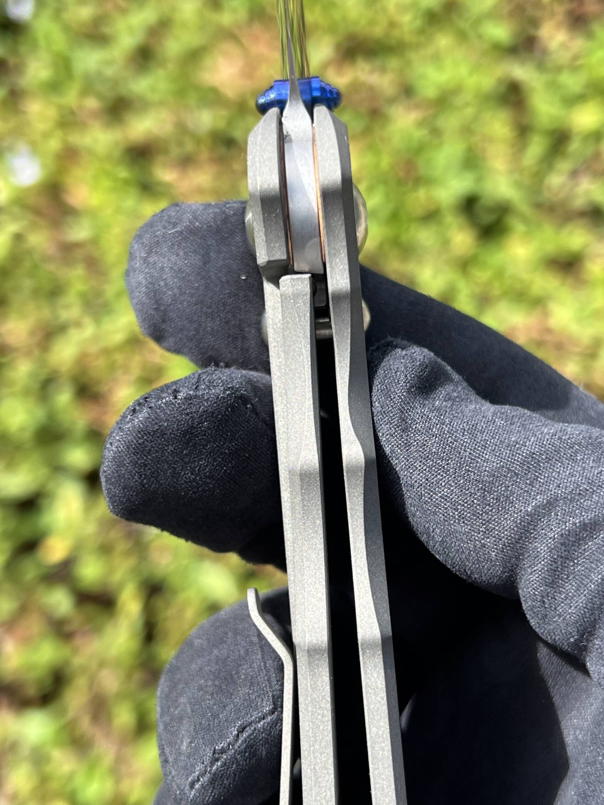- Deployment: Dual thumb studs (with blue anodised accents visible in photos) for fast, ambidextrous opening. Large phosphor bronze washers ensure silky-smooth action.