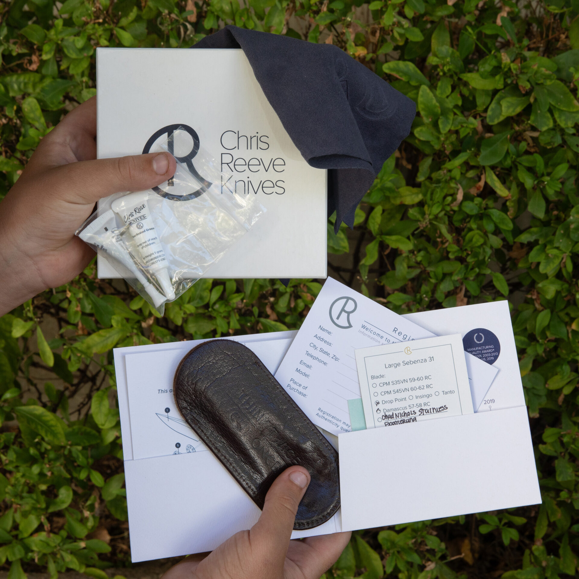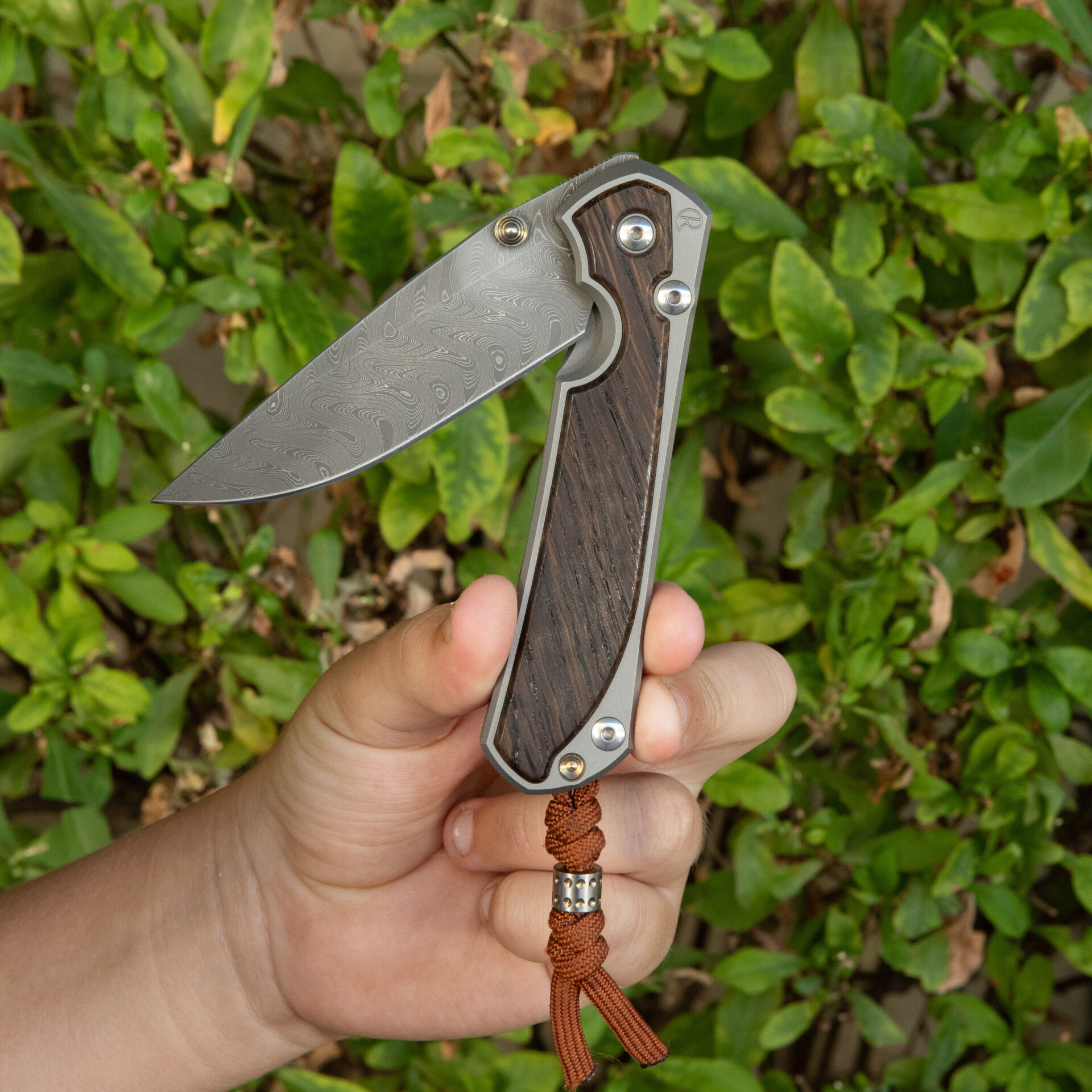 Chris Reeve Large Sebenza 31 Bog Oak – Drop Point / Chad Nichols Boomerang Damascus | L31-1102