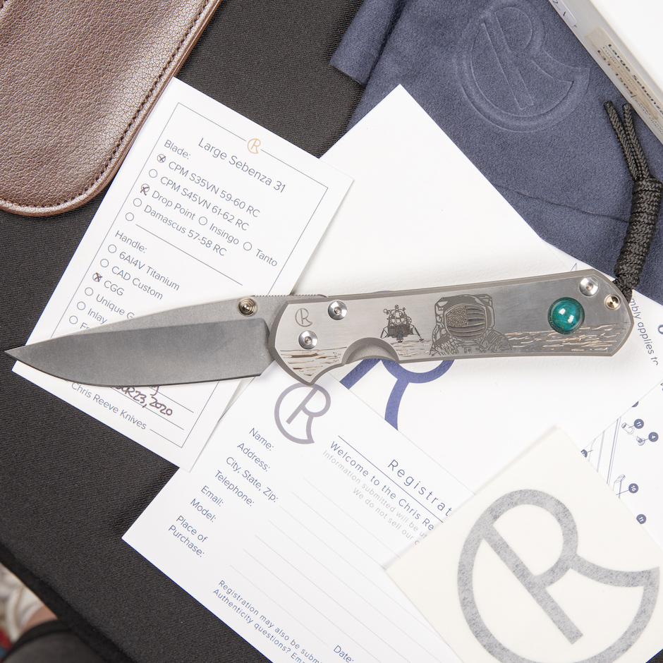 This limited Sebenza 31 features a CPM S35VN drop point blade and a titanium handle engraved with the iconic Lunar Landing design. Precision, history, and craftsmanship in one exceptional knife.