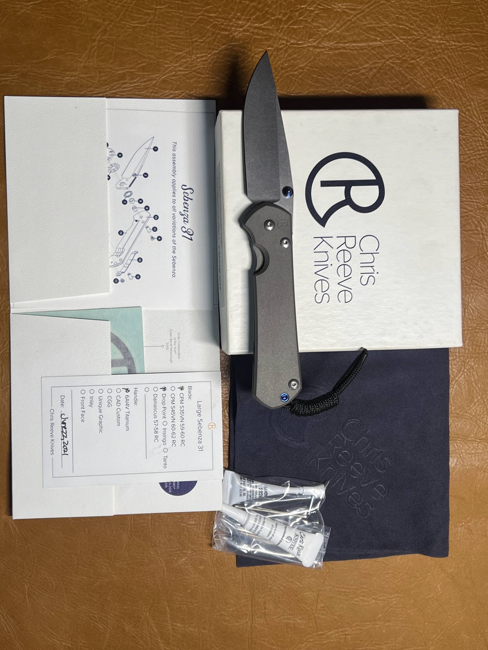 This Sebenza 31 dates to June 22, 2021 – an appealing birthdate for collectors seeking earlier S35VN specimens from the Sebenza 31 production run (prior to the later adoption of MagnaCut steel). It arrives complete with the original Chris Reeve Knives presentation box, assembly diagram card, embroidered cloth pouch, lanyard, and factory maintenance lubricants – everything as it left the Boise facility.