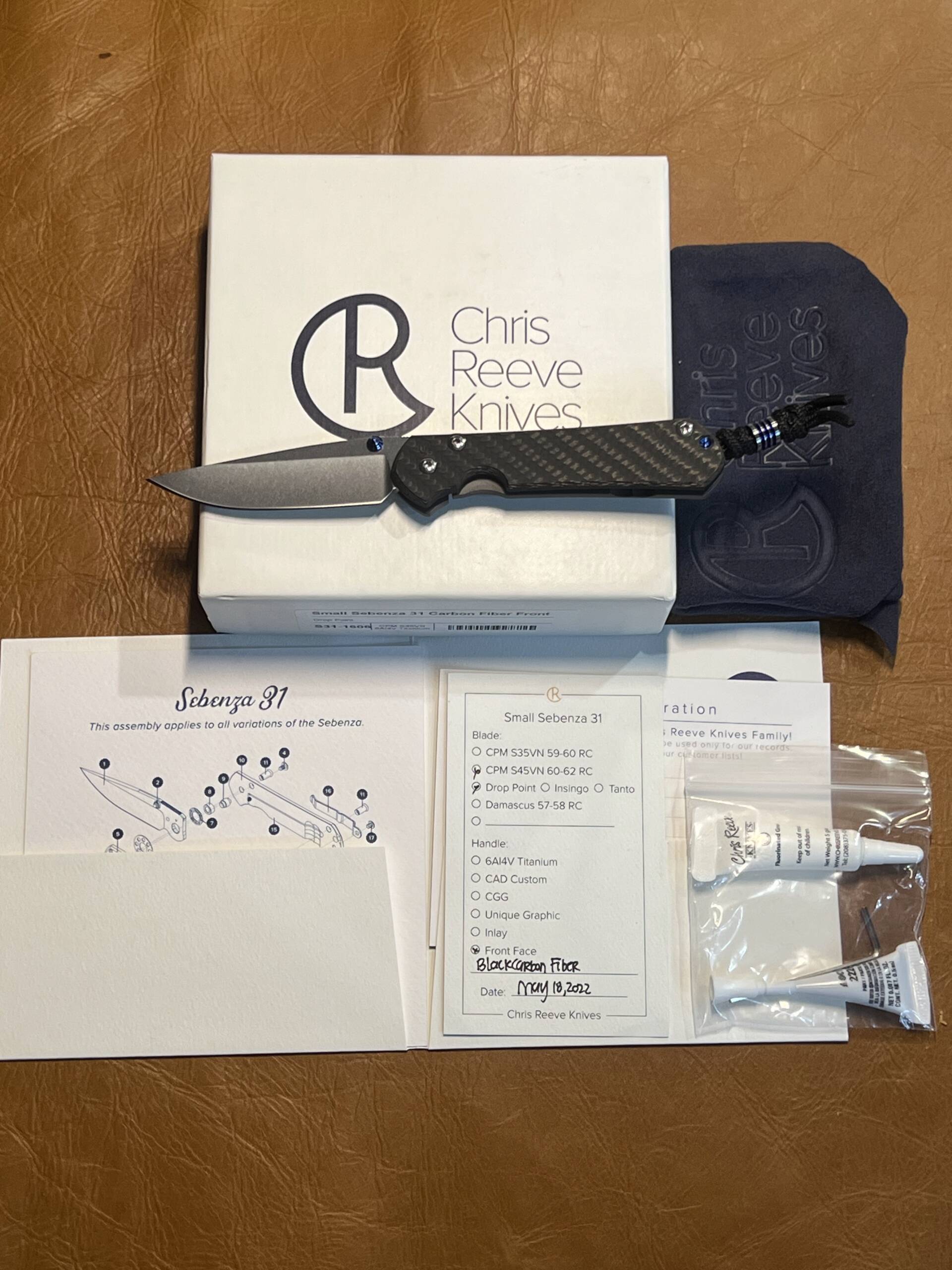 This mint-conditioned Small Sebenza 31 arrives complete with the original white Chris Reeve box, blue protective pouch, Certificate of Authenticity, assembly diagram, hex wrenches, thread locker, and care instructions — exactly as shown in the photos.
