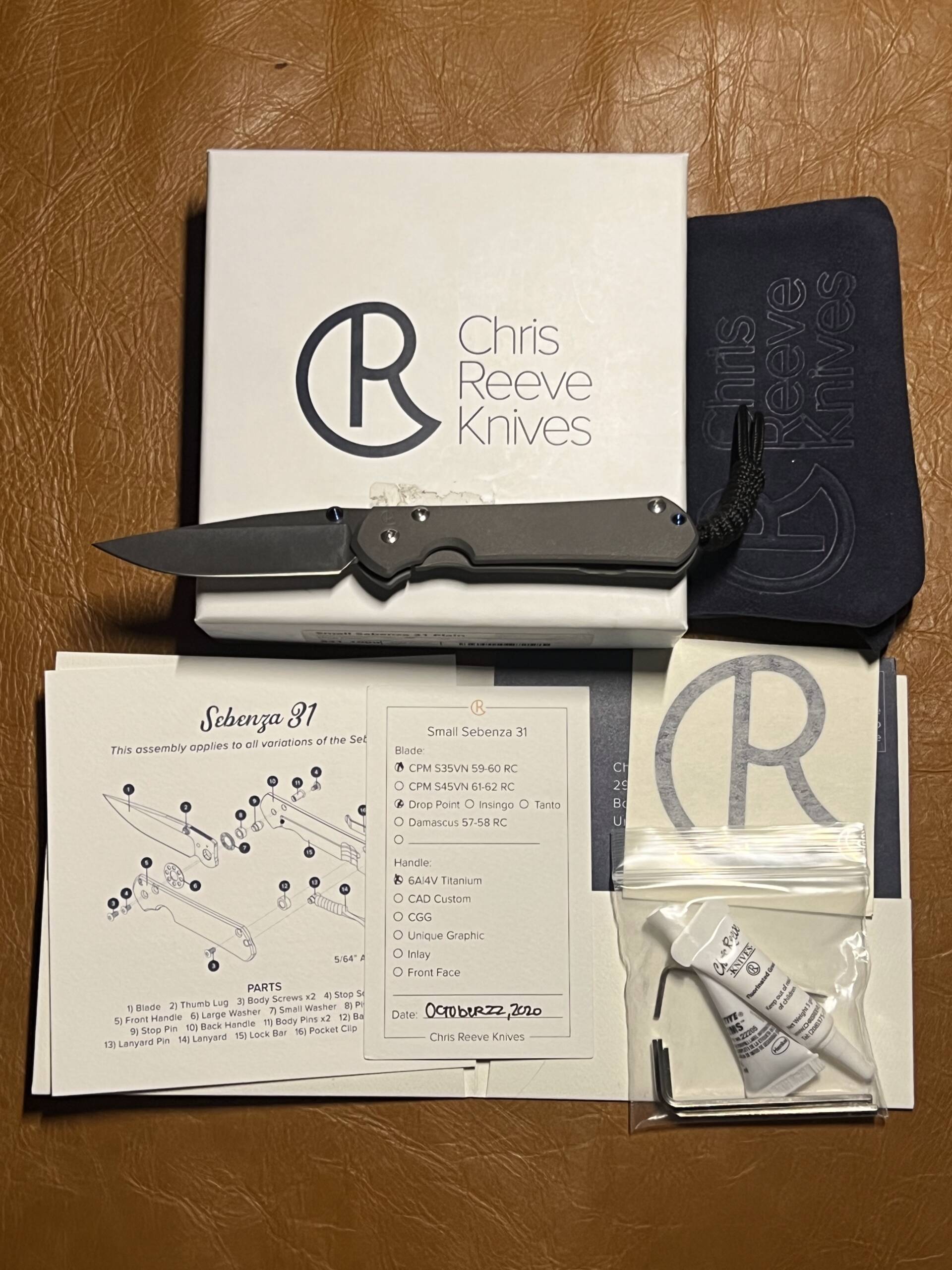 This mint-conditioned Small Sebenza 31 arrives complete with the original white Chris Reeve box, blue protective pouch, Certificate of Authenticity, assembly diagram, hex wrenches, thread locker, and care instructions — exactly as shown in the photos.
