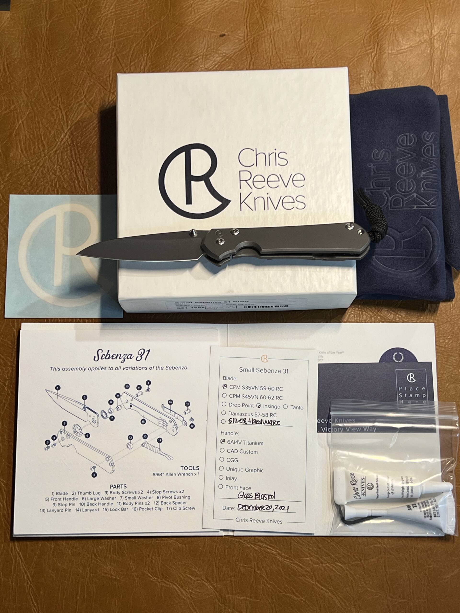This mint-conditioned Small Sebenza 31 arrives complete with the original white Chris Reeve box, blue protective pouch, Certificate of Authenticity, assembly diagram, hex wrenches, thread locker, and care instructions — exactly as shown in the photos.