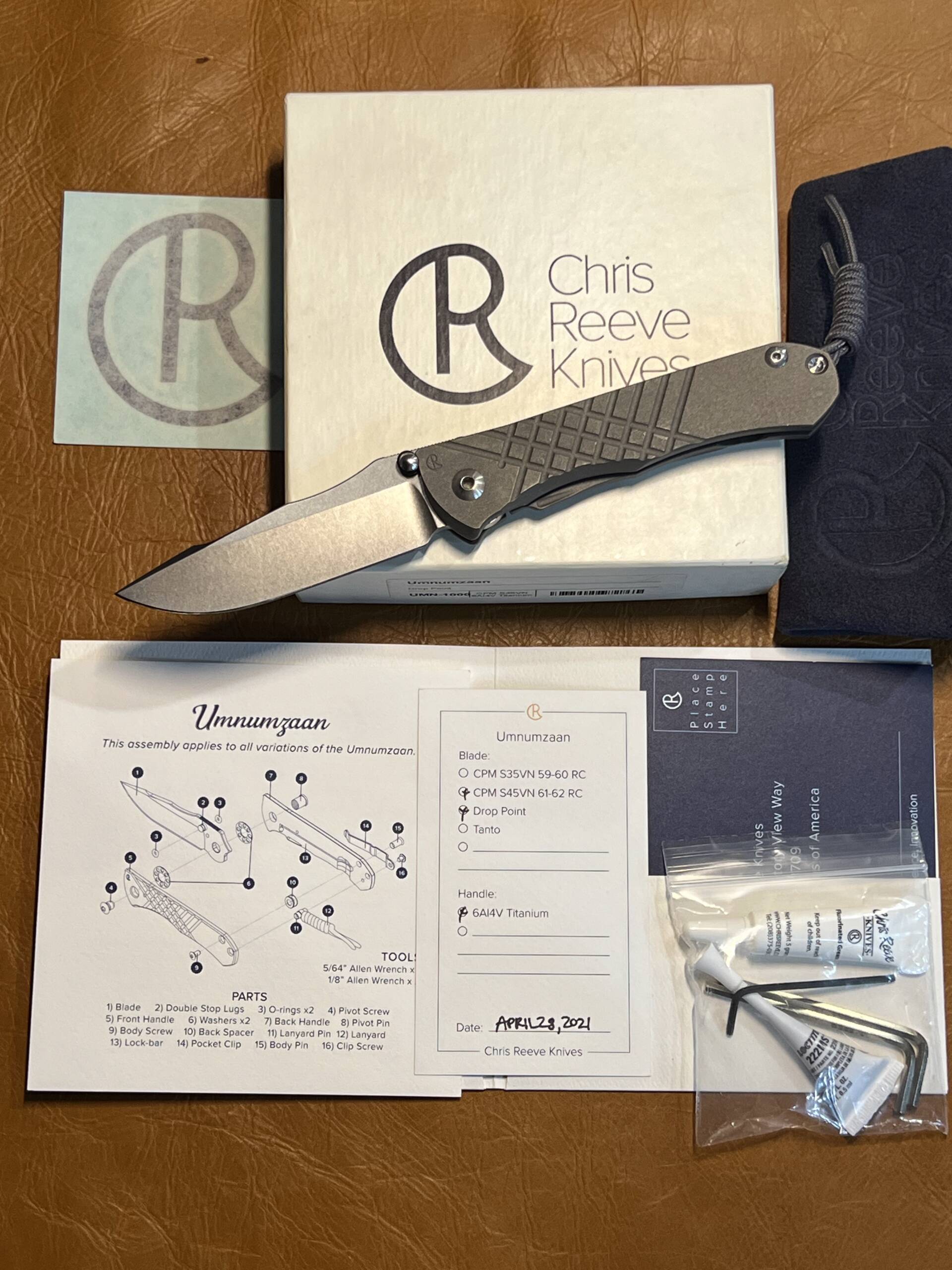This mint-conditioned Umnumzaan arrives complete with the original white Chris Reeve box, blue protective pouch, Certificate of Authenticity, assembly diagram, hex wrenches, thread locker, and care instructions — exactly as shown in the photos.