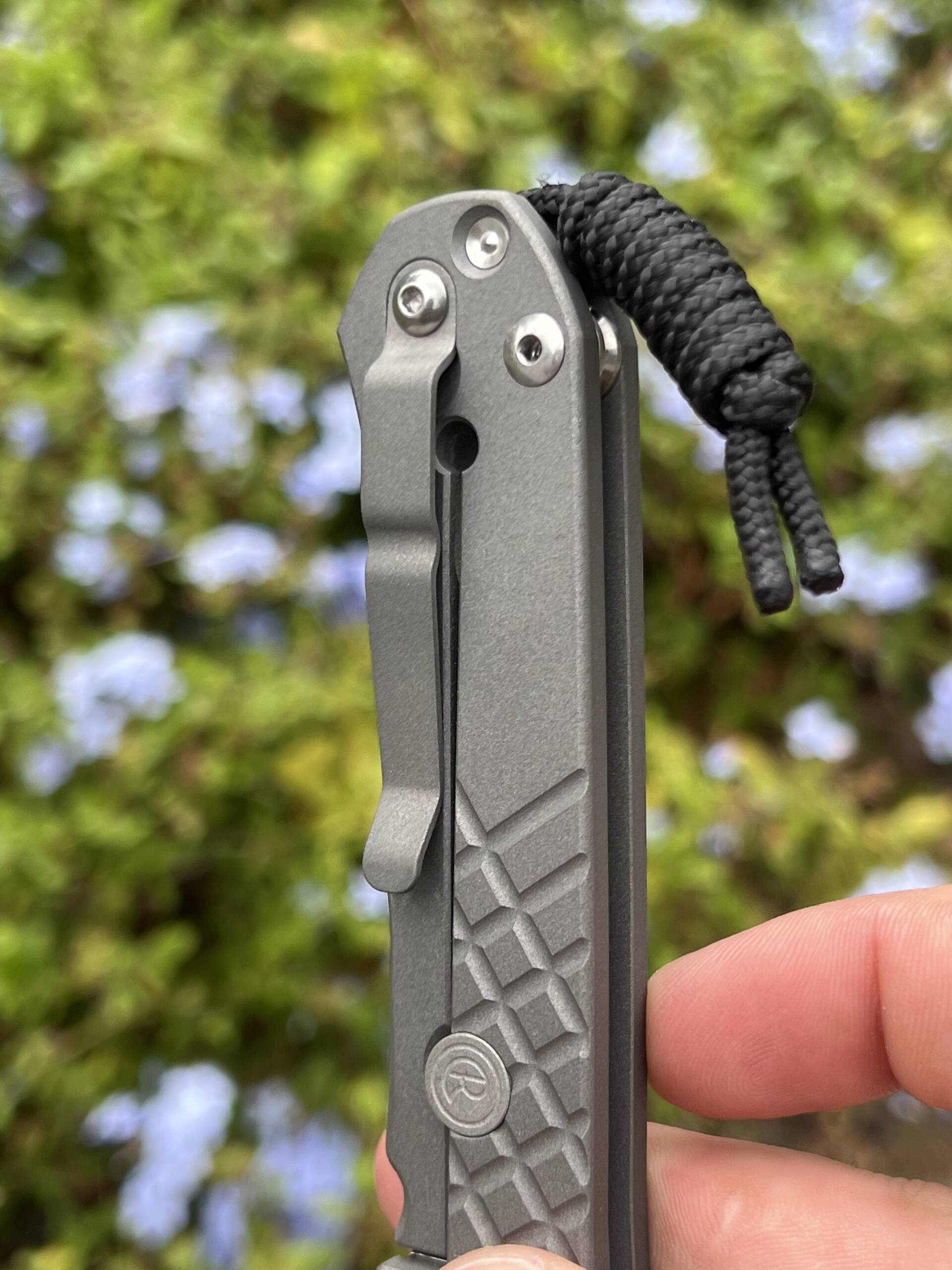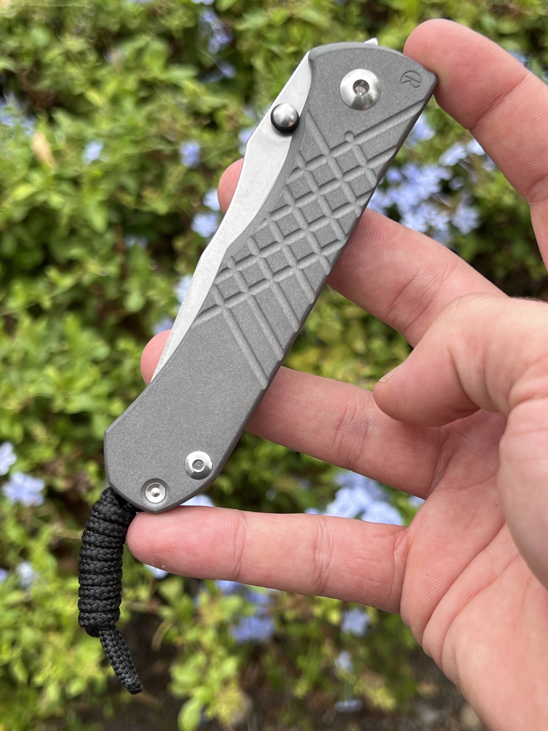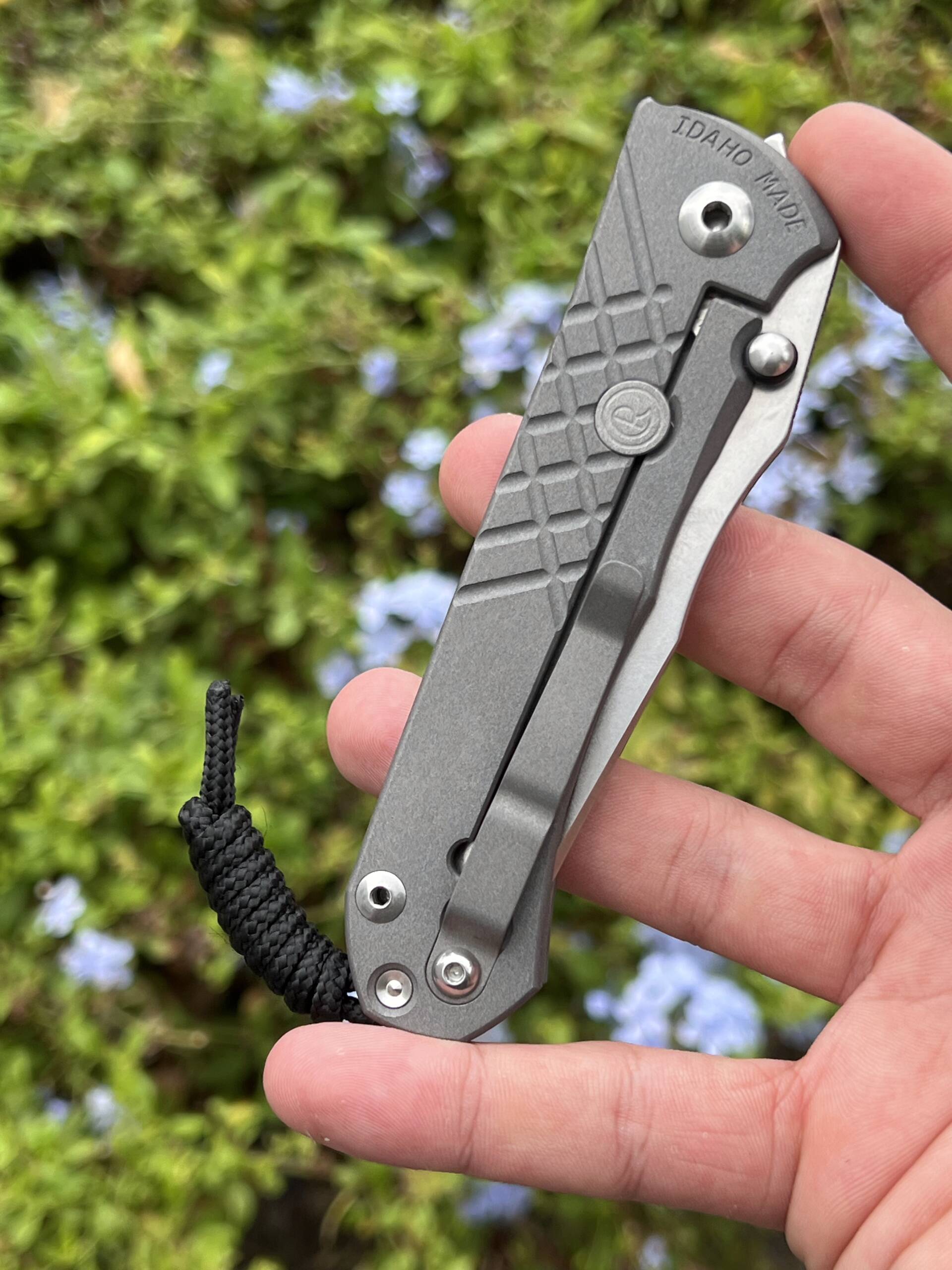 Ergonomic 6Al4V titanium handles (closed length ~121 mm / 4.77″) showcase a distinctive crosshatch texture for confident grip in any condition, sandblasted for subtle sophistication, at a balanced 142 g (5 oz) overall weight. The full kit includes the original box, Chris Reeve microfiber pouch, paracord lanyard with bead, hex wrench set, maintenance ointment, and detailed notes card—everything as delivered from the factory.
