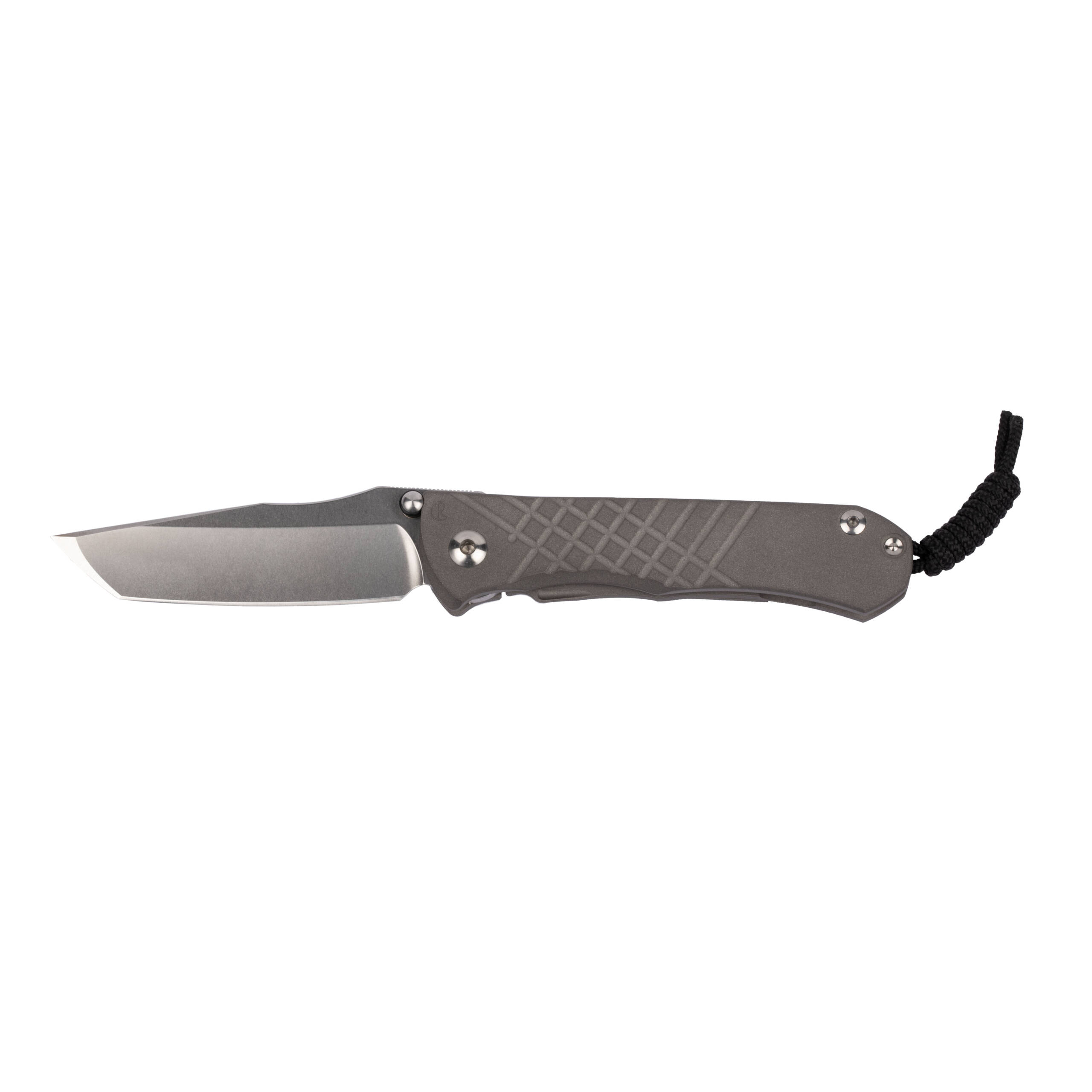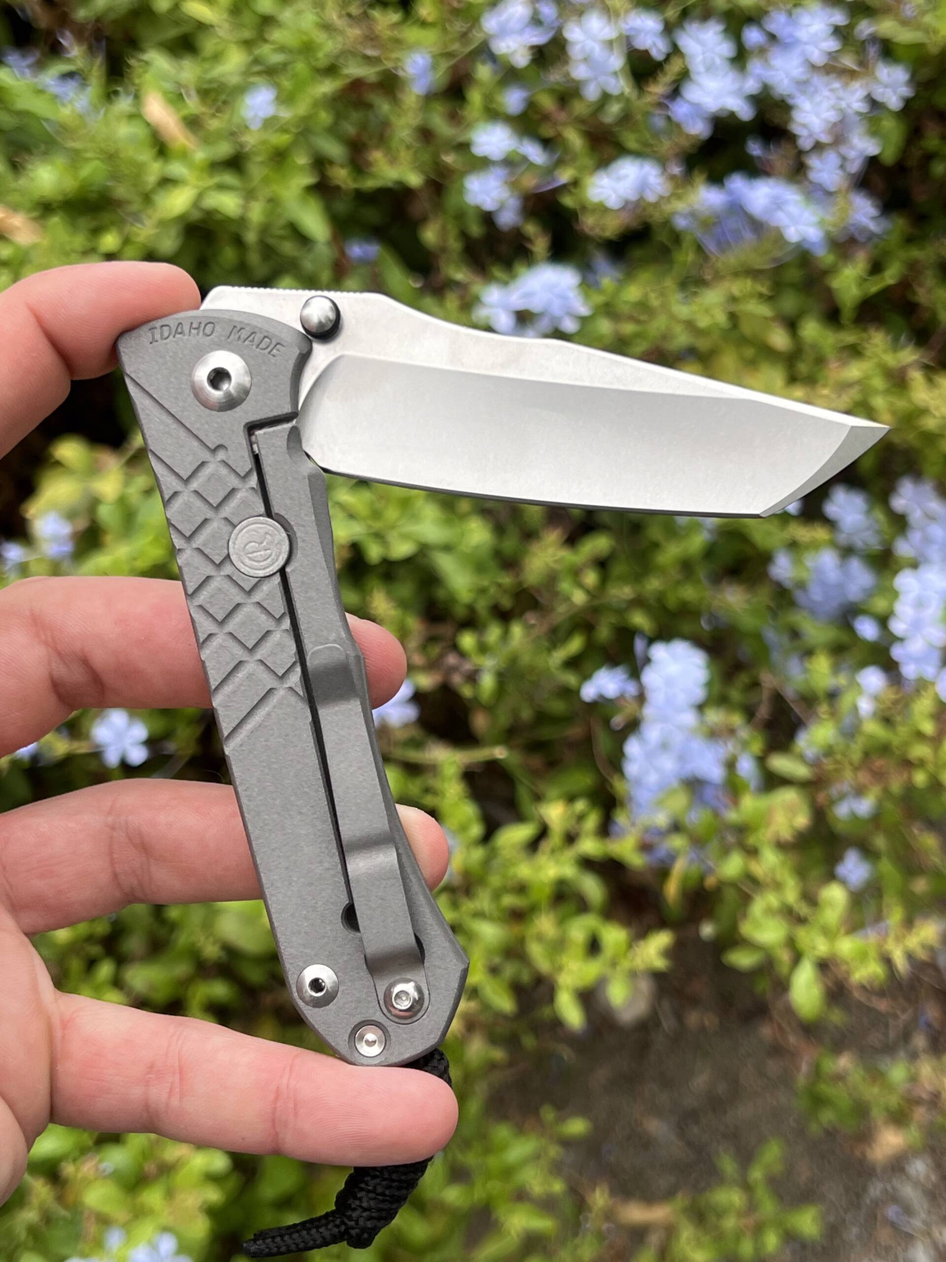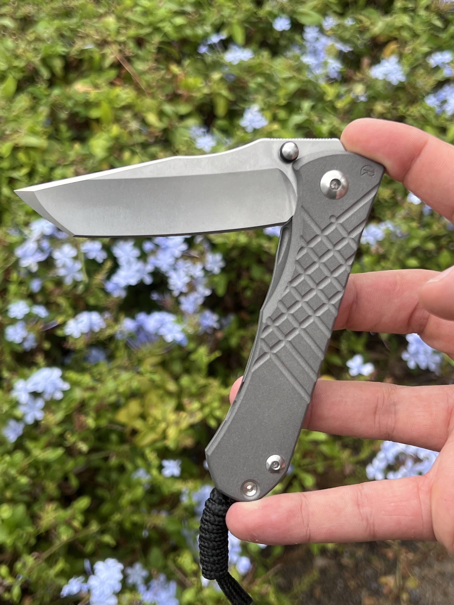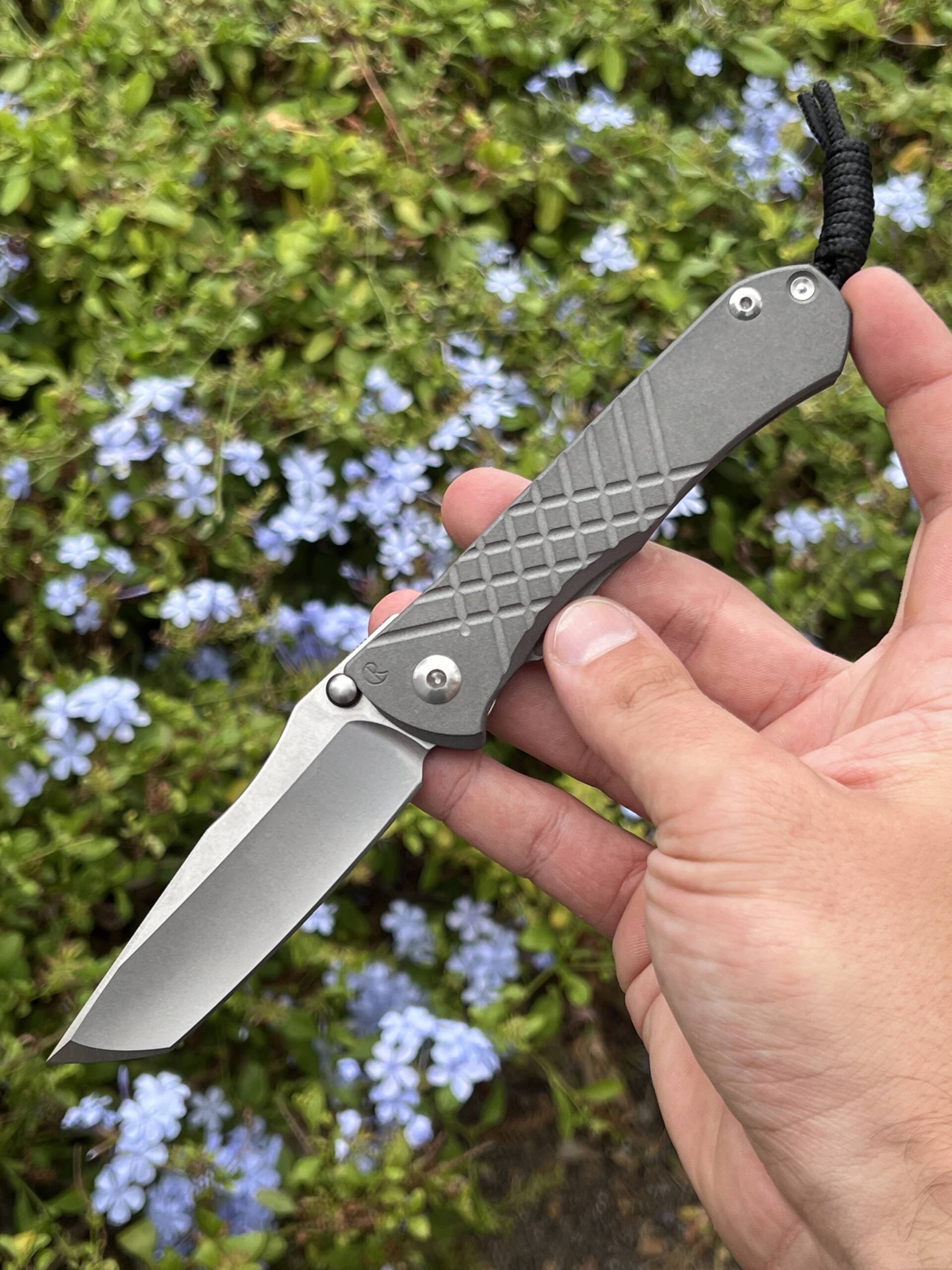 Ergonomic 6Al4V titanium handles (closed length ~121 mm / 4.77″) showcase a distinctive crosshatch texture for confident grip in any condition, sandblasted for subtle sophistication, at a balanced 142 g (5 oz) overall weight. The full kit includes the original box, Chris Reeve microfiber pouch, paracord lanyard with bead, hex wrench set, maintenance ointment, and detailed notes card—everything as delivered from the factory.