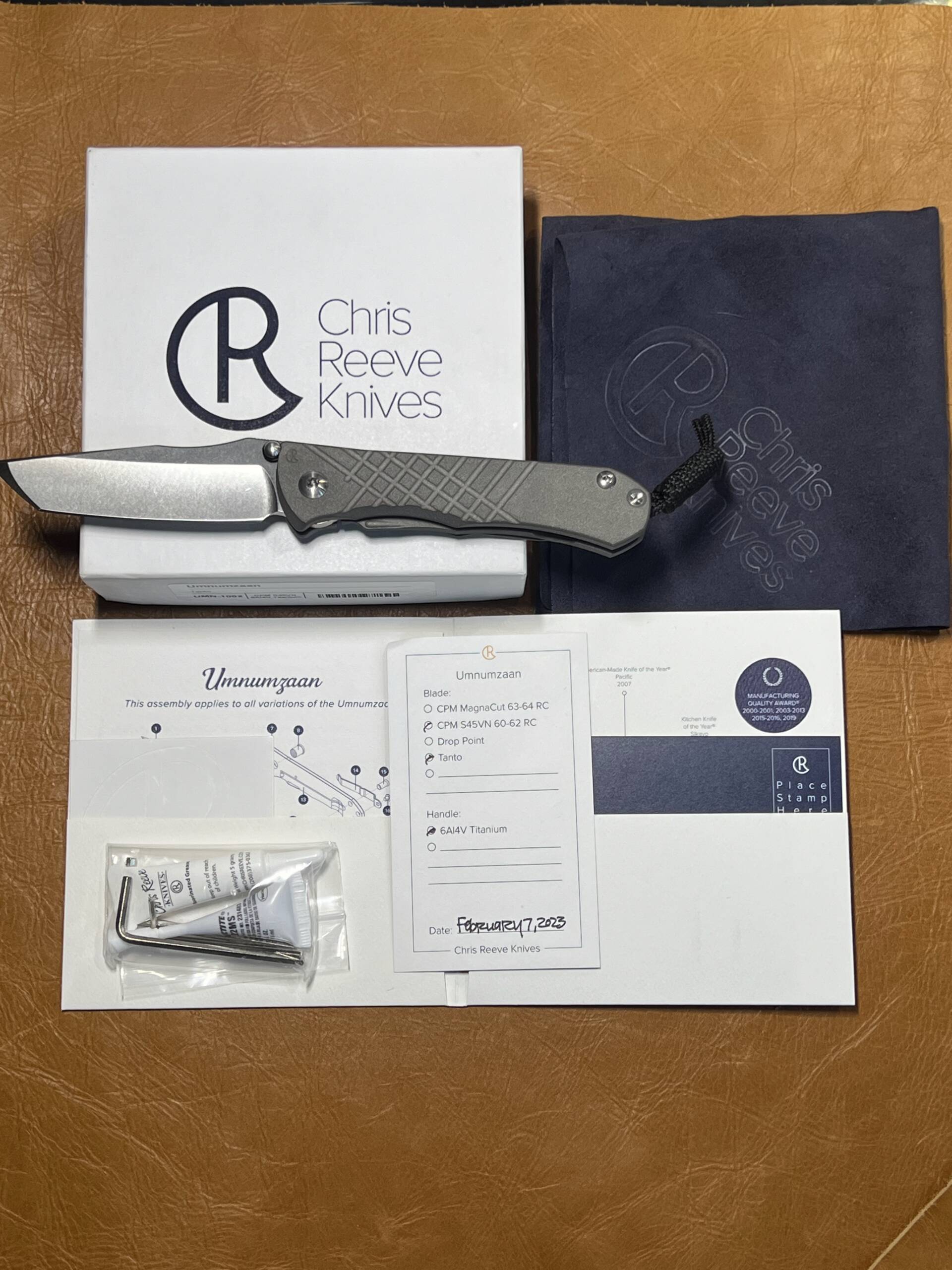 The Chris Reeve Knives Umnumzaan (“boss” in Zulu) is the pinnacle of tactical folding excellence—evolved from the legendary Sebenza with thicker stock, refined ergonomics, and battle-ready features handcrafted in Boise, Idaho. This 2023 example (dated February 7, 2023) boasts a commanding Tanto blade in CPM S45VN stainless steel, heat-treated to 60-62 HRC for elite edge retention, exceptional toughness, and superior corrosion resistance—ideal for piercing, slicing, and hard-use tasks where lesser knives falter.