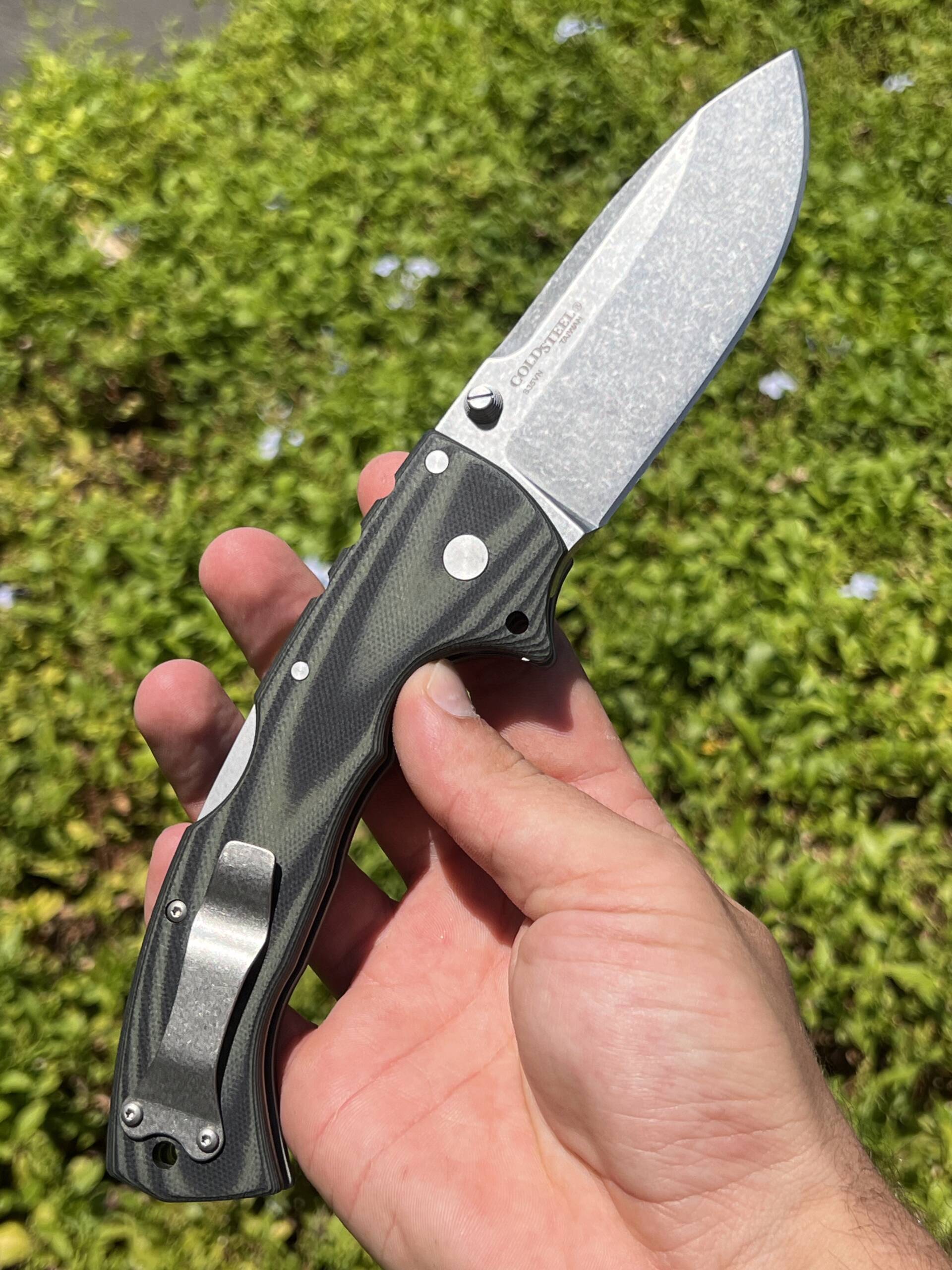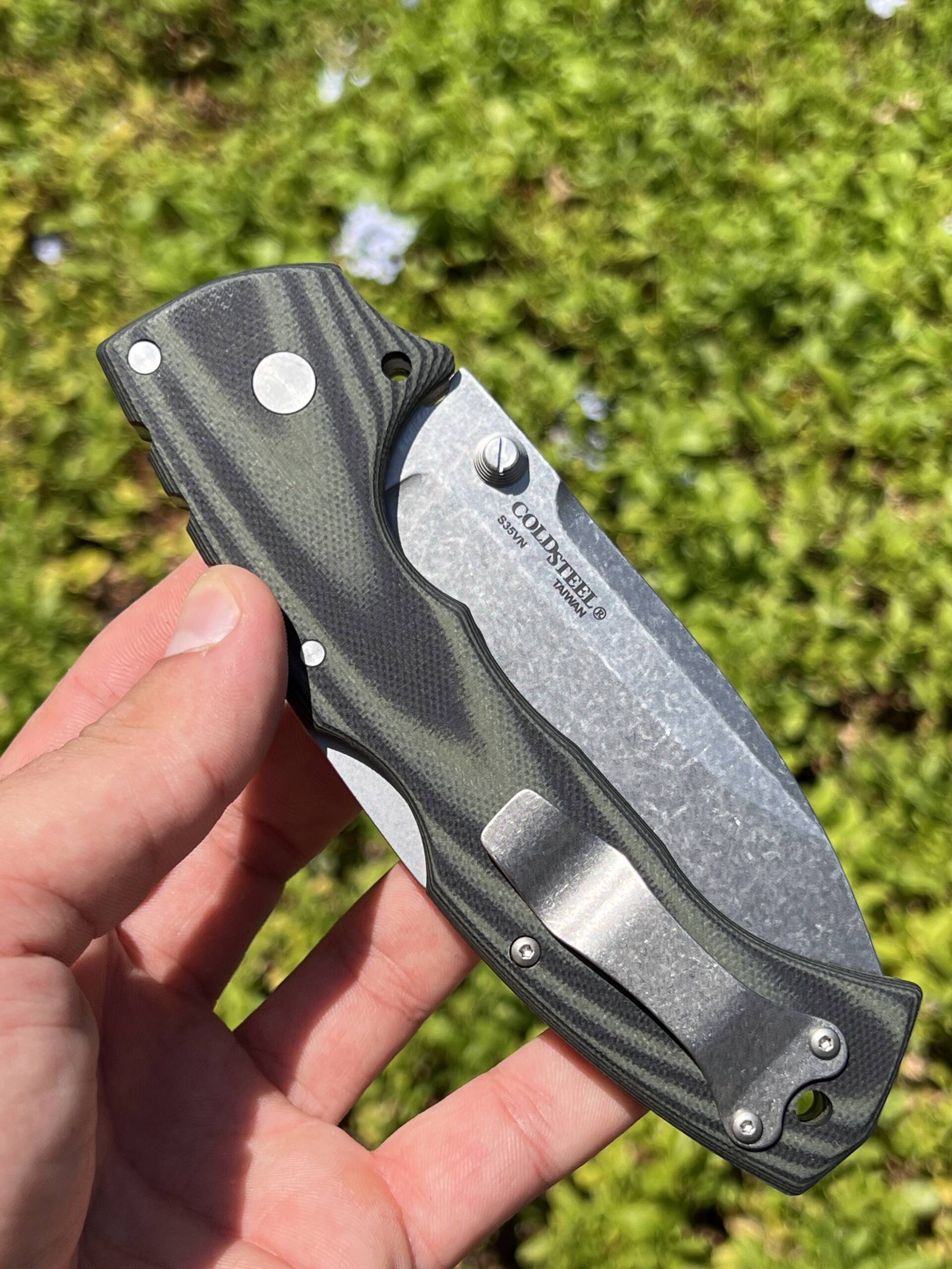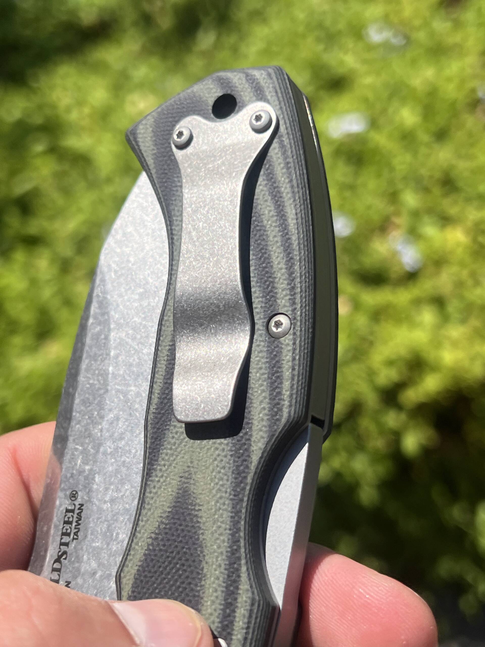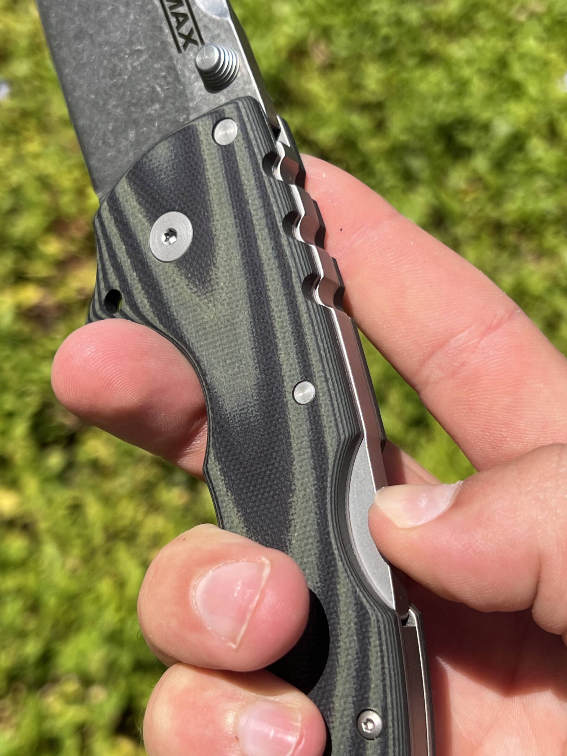 The handle is constructed with machined G-10 scales in black and green, layered over titanium liners to create a rigid, confidence-inspiring frame. Lock-up is handled by Cold Steel’s legendary Tri-Ad Lock, widely regarded as one of the strongest and most reliable locking mechanisms available on a folding knife today.