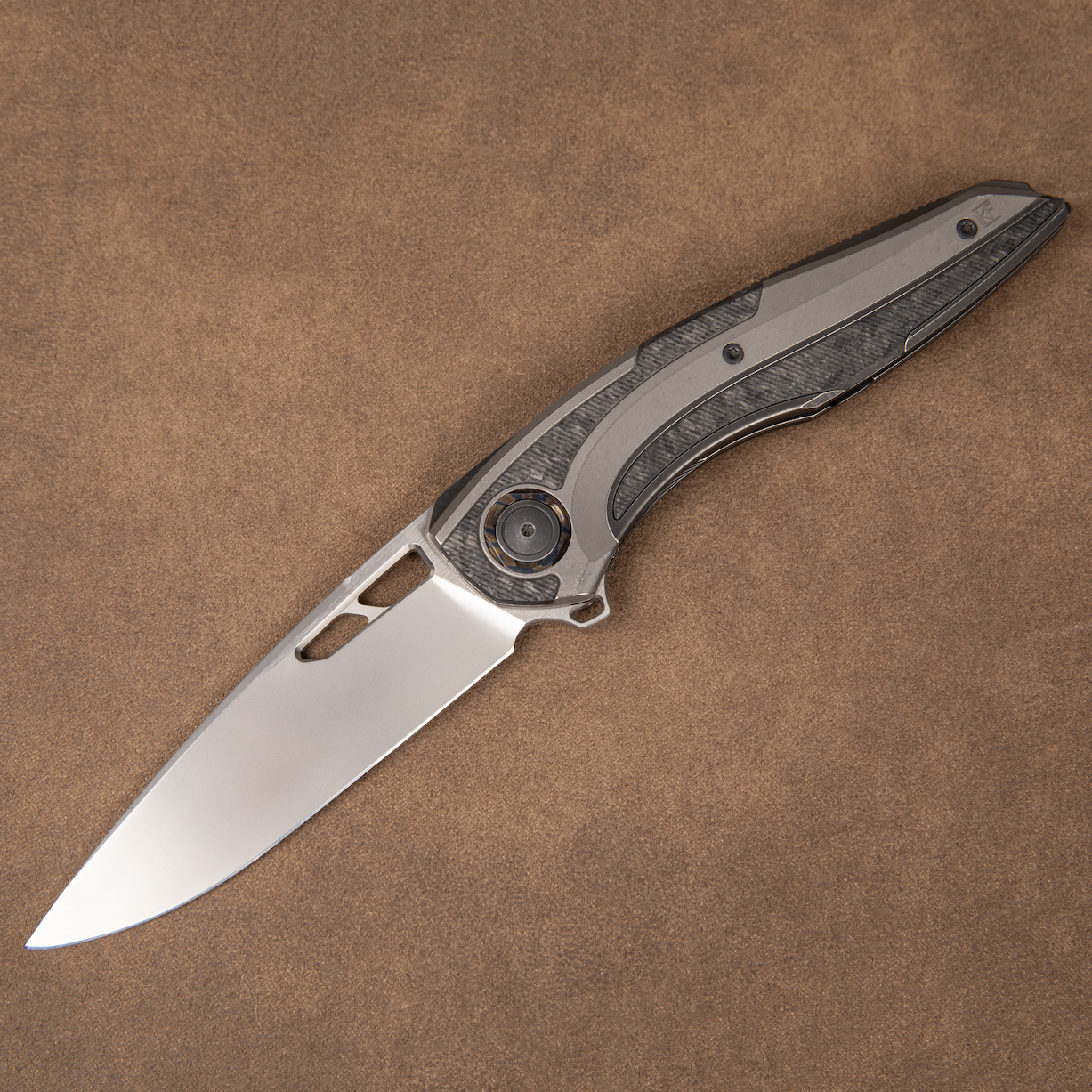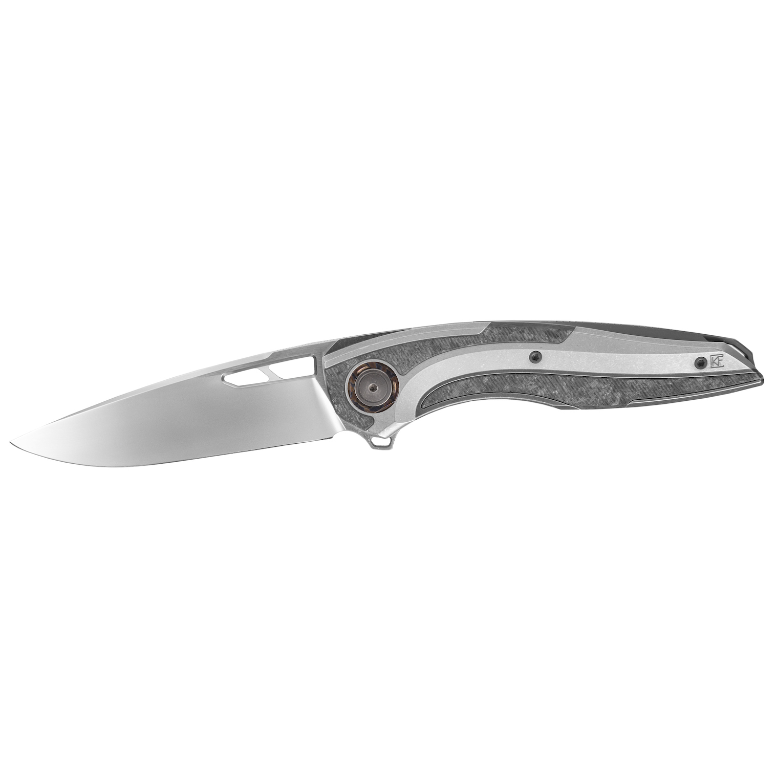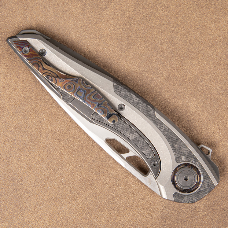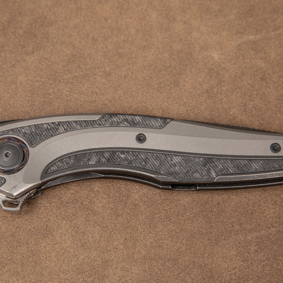 The handle combines rugged titanium with intricately milled carbon fiber inlays for a lightweight yet robust grip. Luxurious finishing touches include a zirconium backspacer and ZirCuTi pivot collars and pocket clip—adding contrast, character, and collectibility.