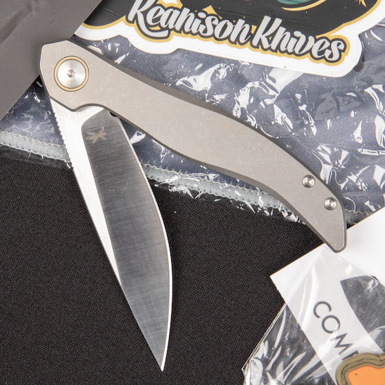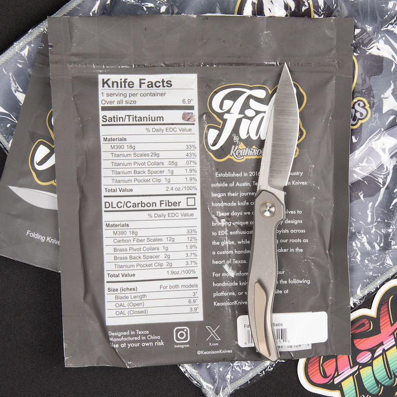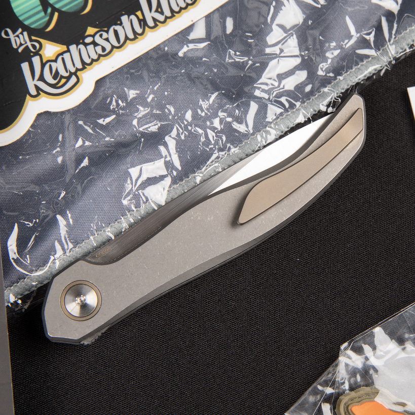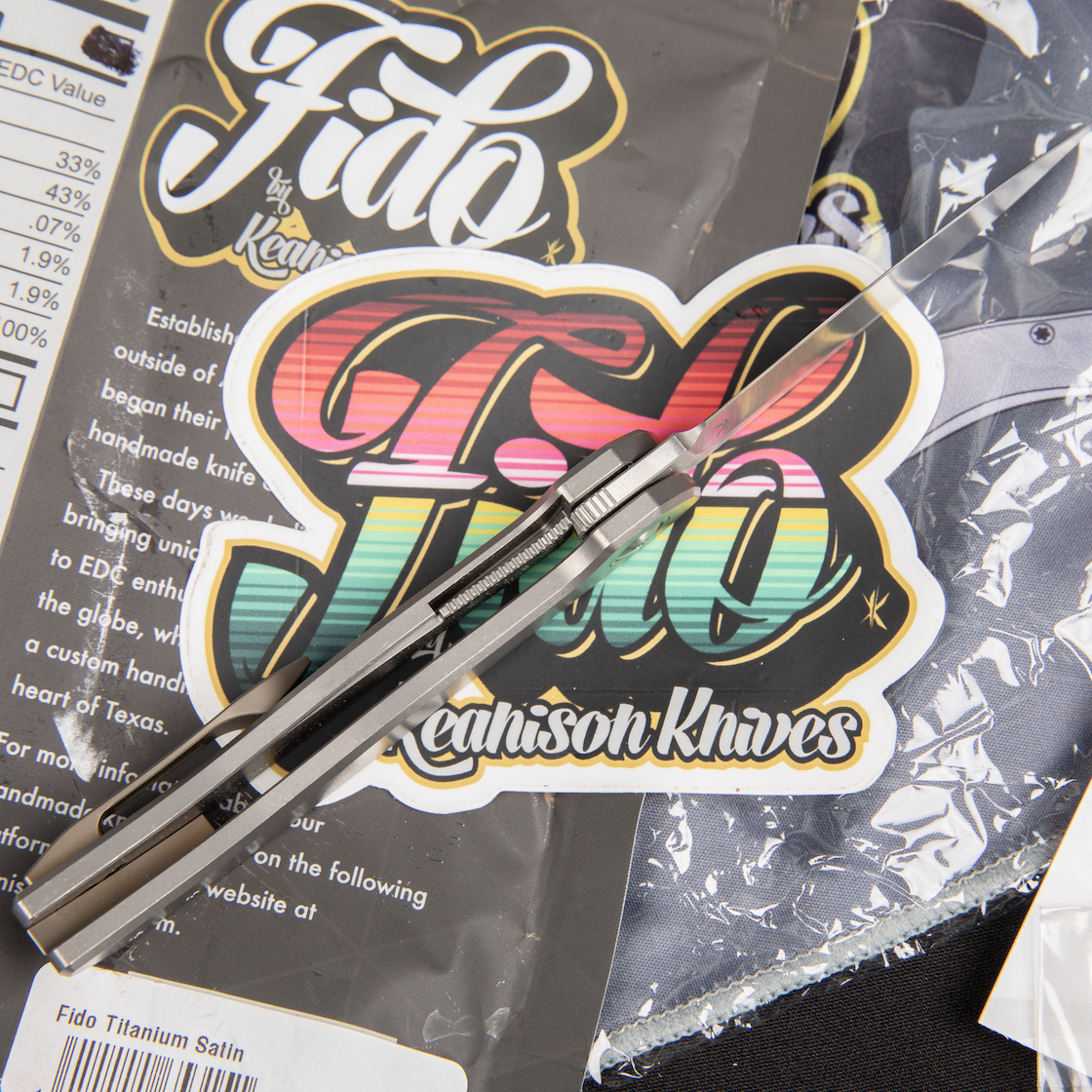 Slim, sharp, and ready to work—the Fido by Keanison is a precision-built EDCThe Fido by Keanison is a sleek 6.9″ EDC knife featuring a 3″ M390 drop point blade and lightweight titanium handle. Weighing just 2.4 oz, it’s built for everyday performance with premium materials and clean design. designed for performance. It features a 3″ drop point blade made from premium M390 steel, delivering top-tier edge retention and cutting power.