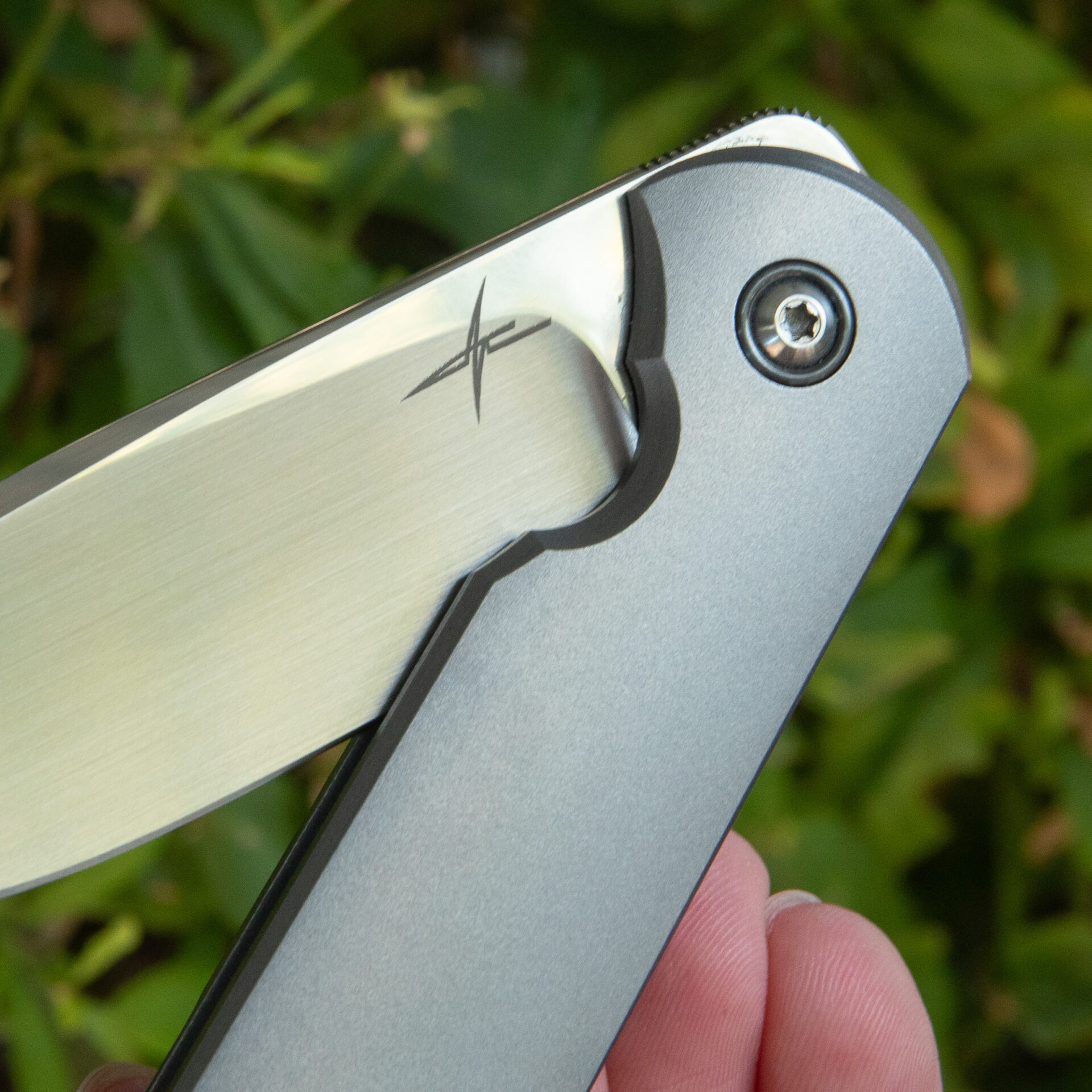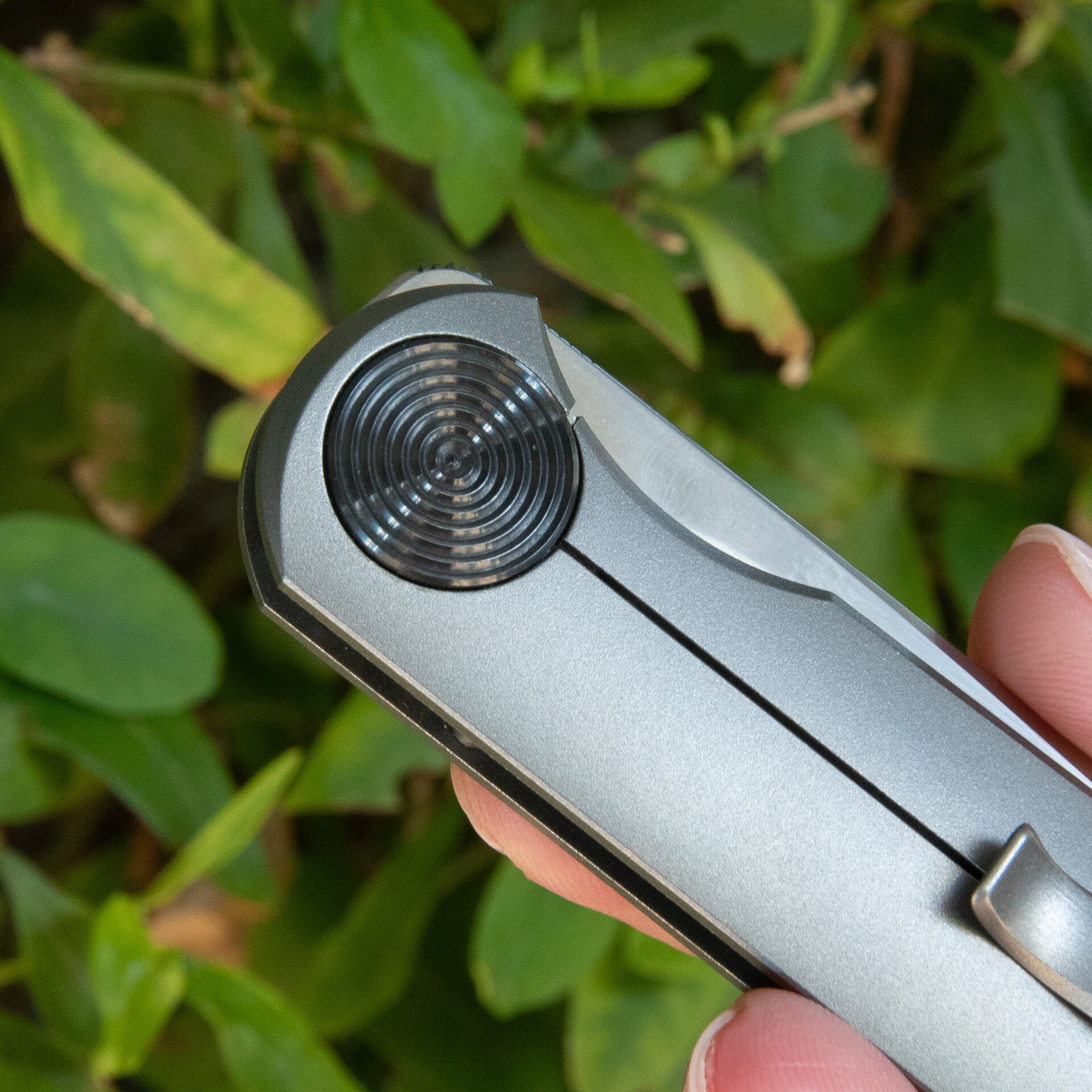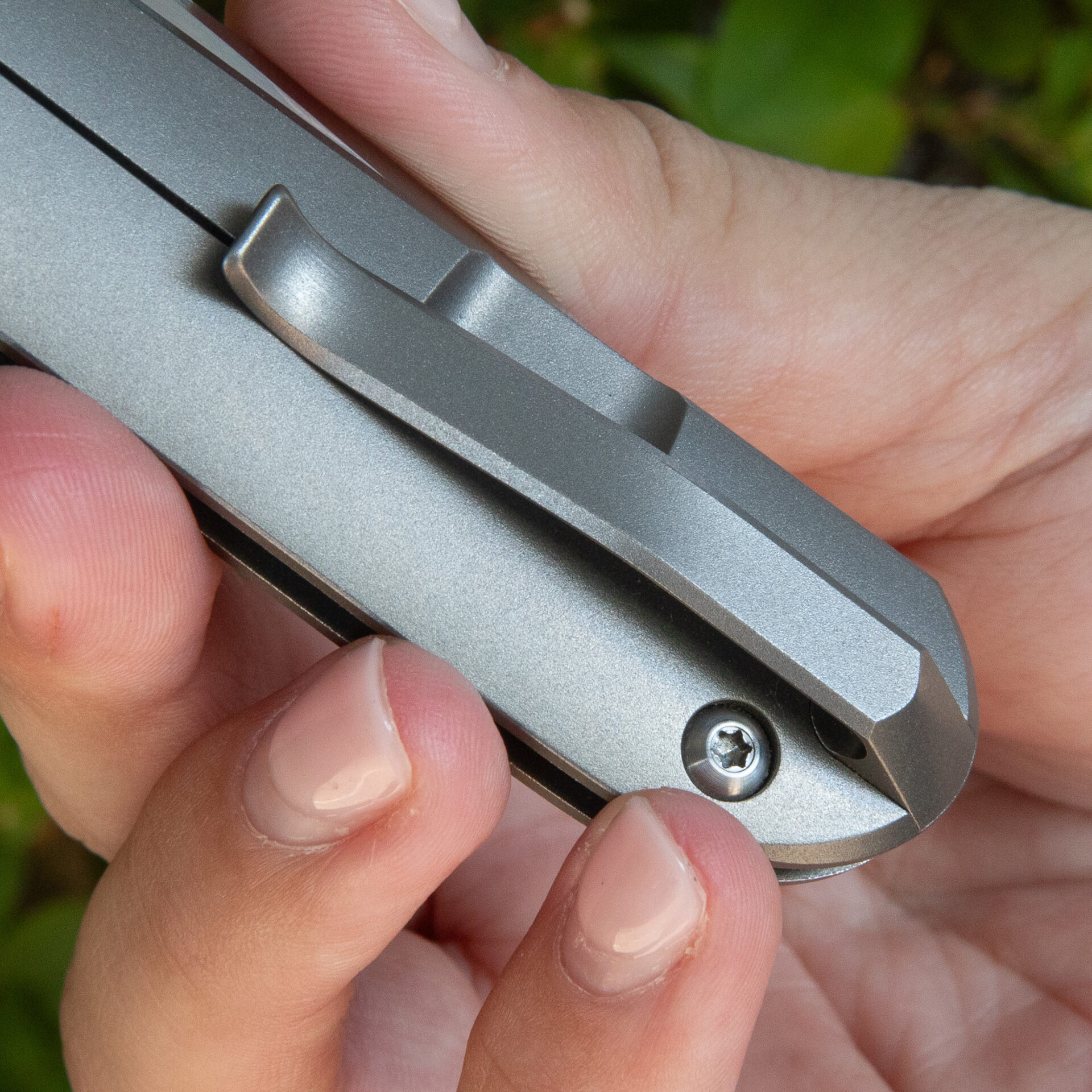 The handle is machined from Ti-6Al-4V Grade 5 titanium with a dark blasted finish, offering strength, low weight, and a comfortable, slim profile. A stainless steel lockbar insert ensures secure lockup and long-term durability, preserving consistent performance over years of use.