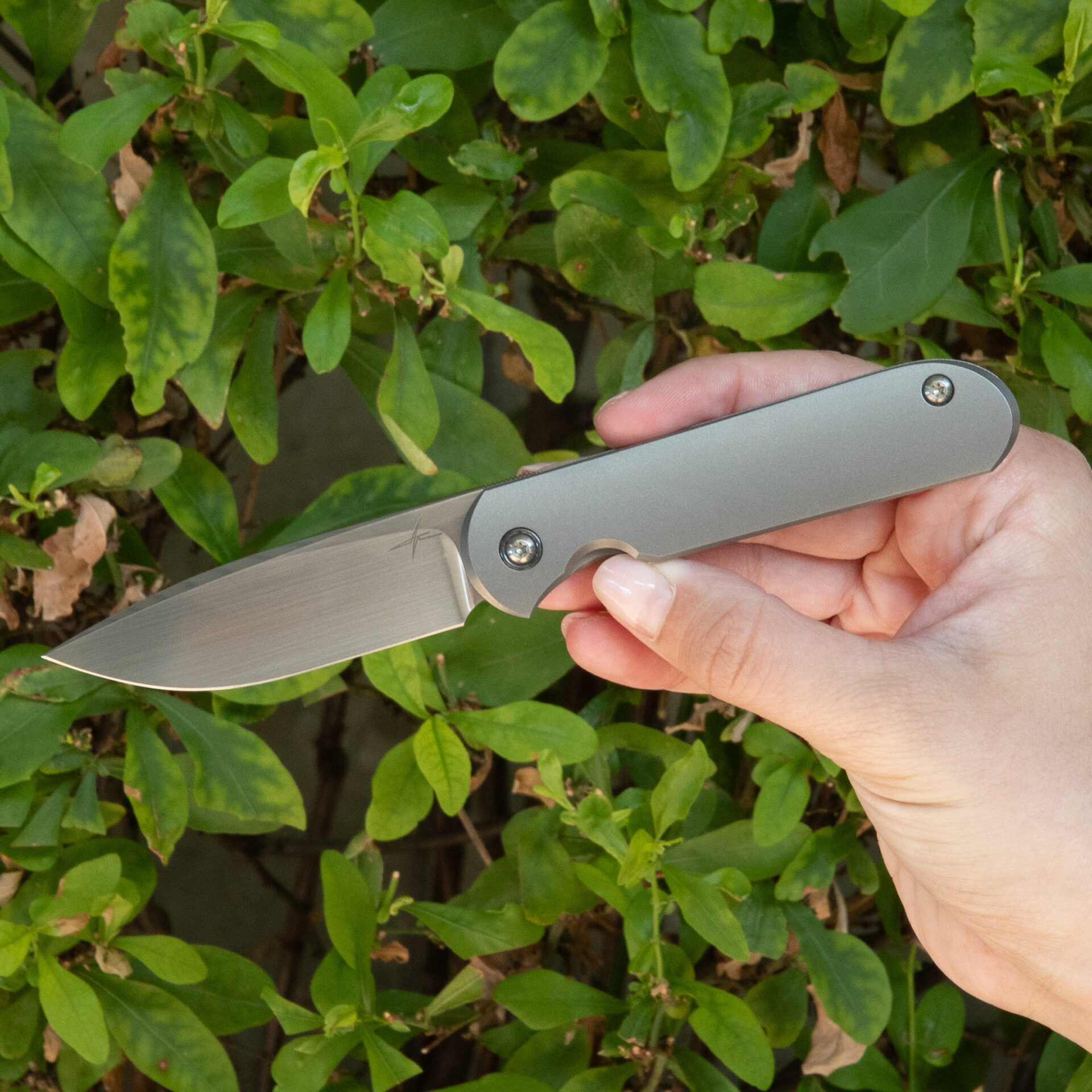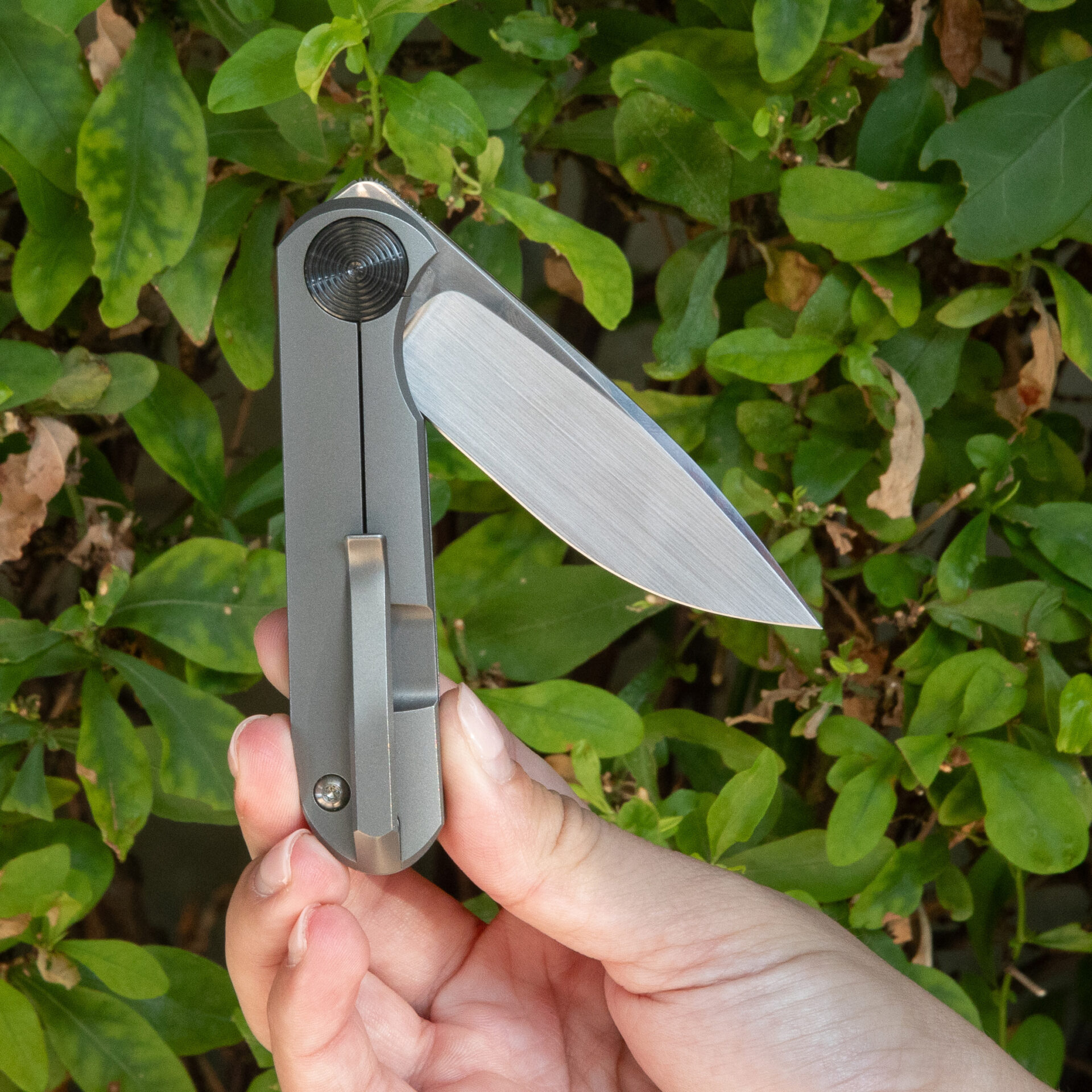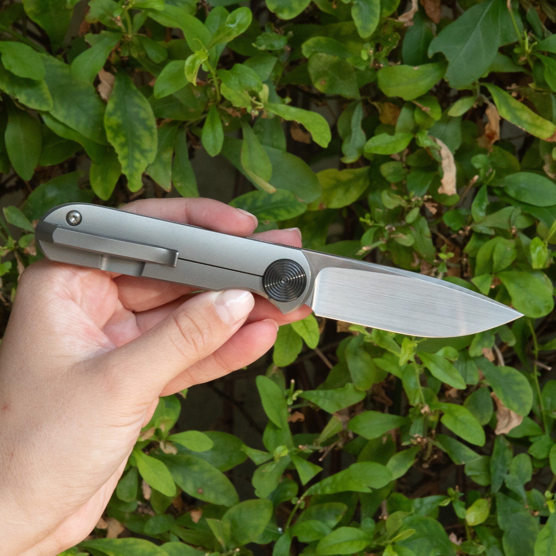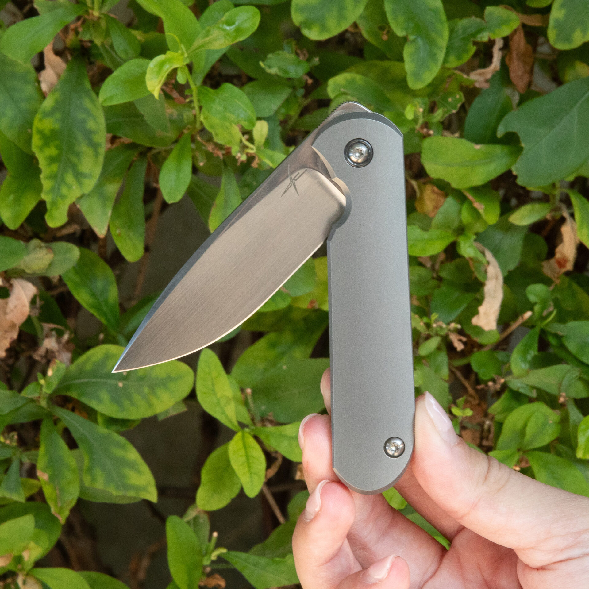 The handle is machined from Ti-6Al-4V Grade 5 titanium with a dark blasted finish, offering strength, low weight, and a comfortable, slim profile. A stainless steel lockbar insert ensures secure lockup and long-term durability, preserving consistent performance over years of use.
