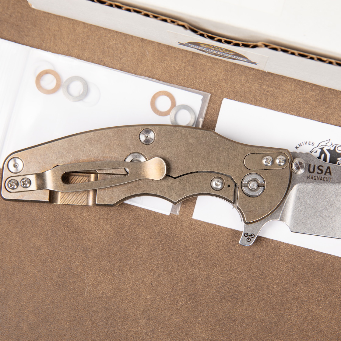 | Handle: | Black G10 scale with bronze-anodized titanium frame |