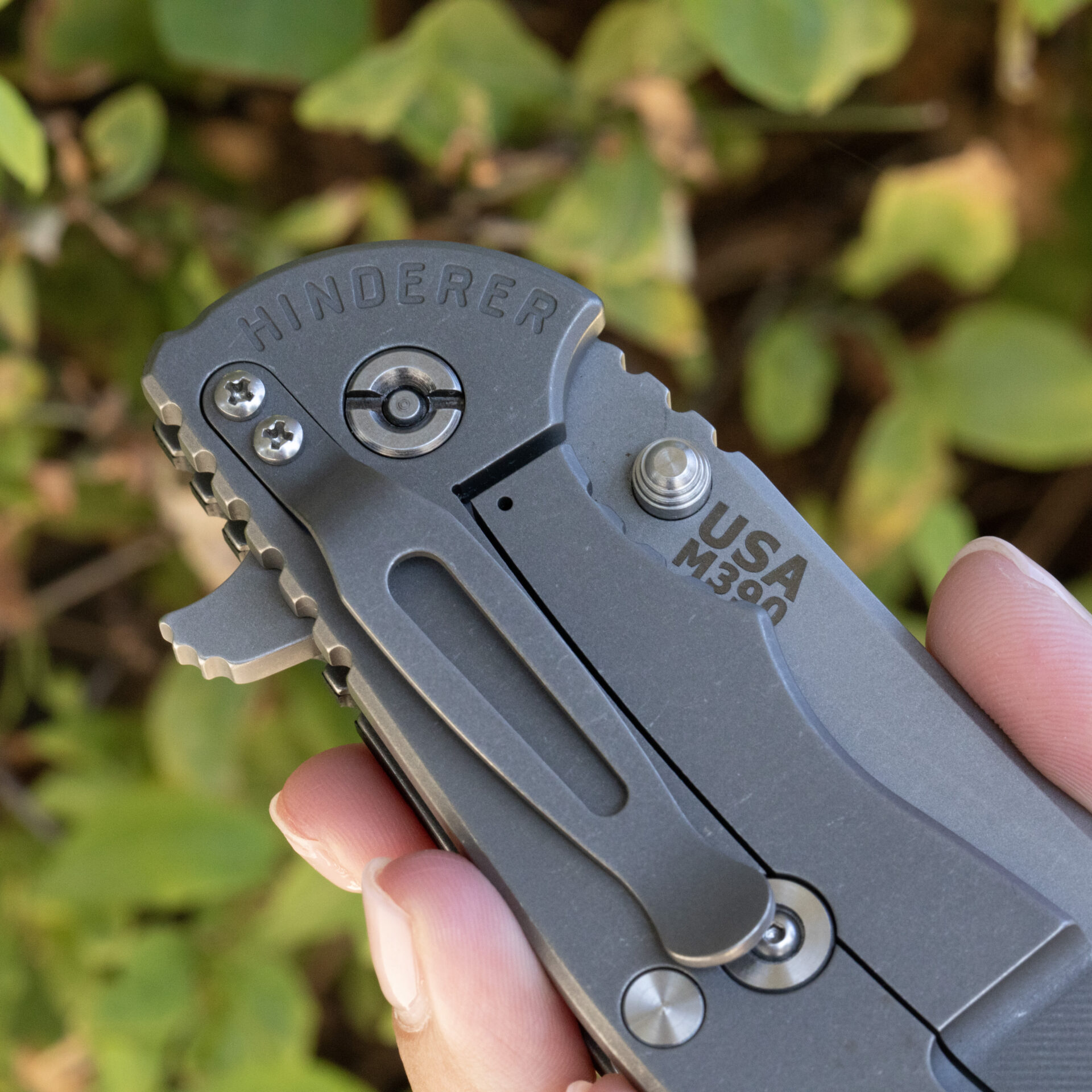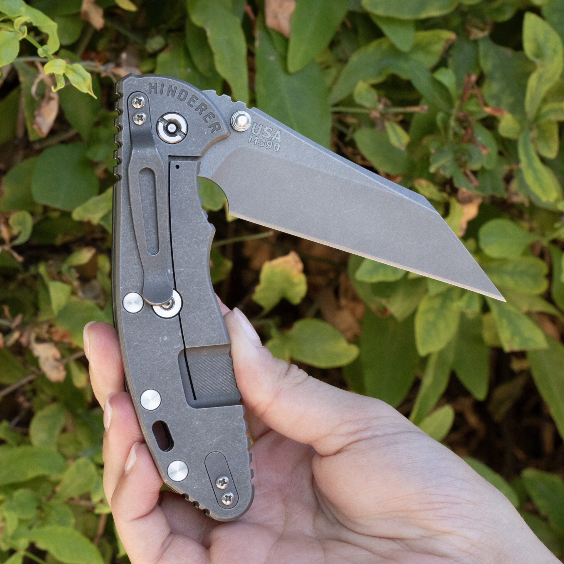 The lockside is precision CNC manufactured from 6AL4V titanium featuring the patented Hinderer Lockbar Stabilizer. The knife can be set up for either tip up or tip down carry. The non-lock side has a .050″ titanium liner with a G10 handle scale. These high strength materials combined with the full titanium liner add strength and rigidity. The handle scales can be easily changed by the end user if another color is desired. The standard finish on all XM folders is a highly durable tumbled/stonewash that will stand up to hard use in all environments. The handle construction is an open back design utilizing huge standoffs. The standoffs are designed to add superior strength for lateral crushing of the handle case while still allowing the blade to nestle into the handle without touching the standoffs. This gives the knife the same strength as a solid back folder while offering the ease of cleaning due to the open design.