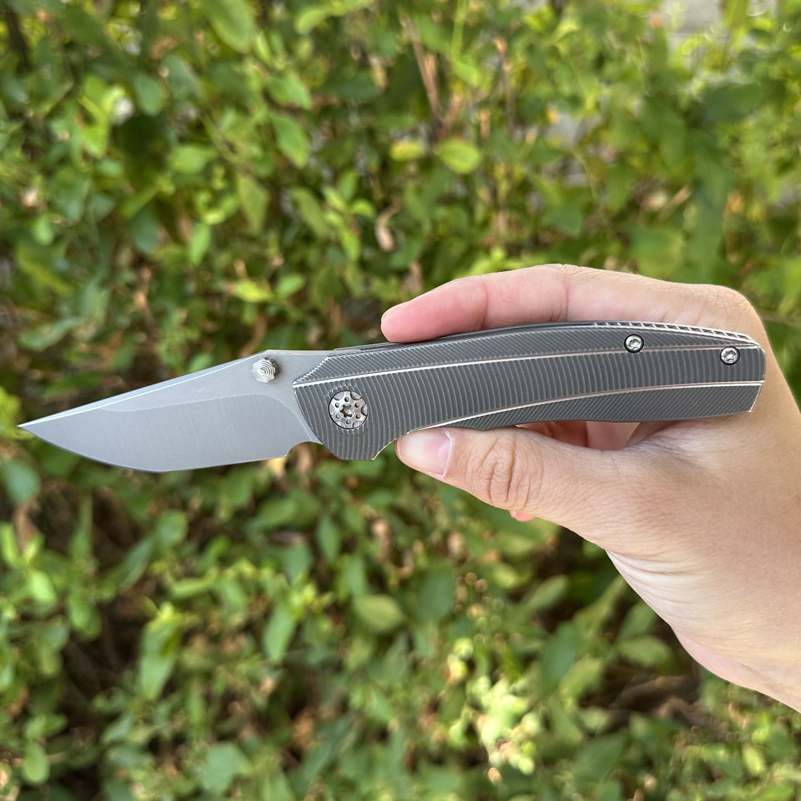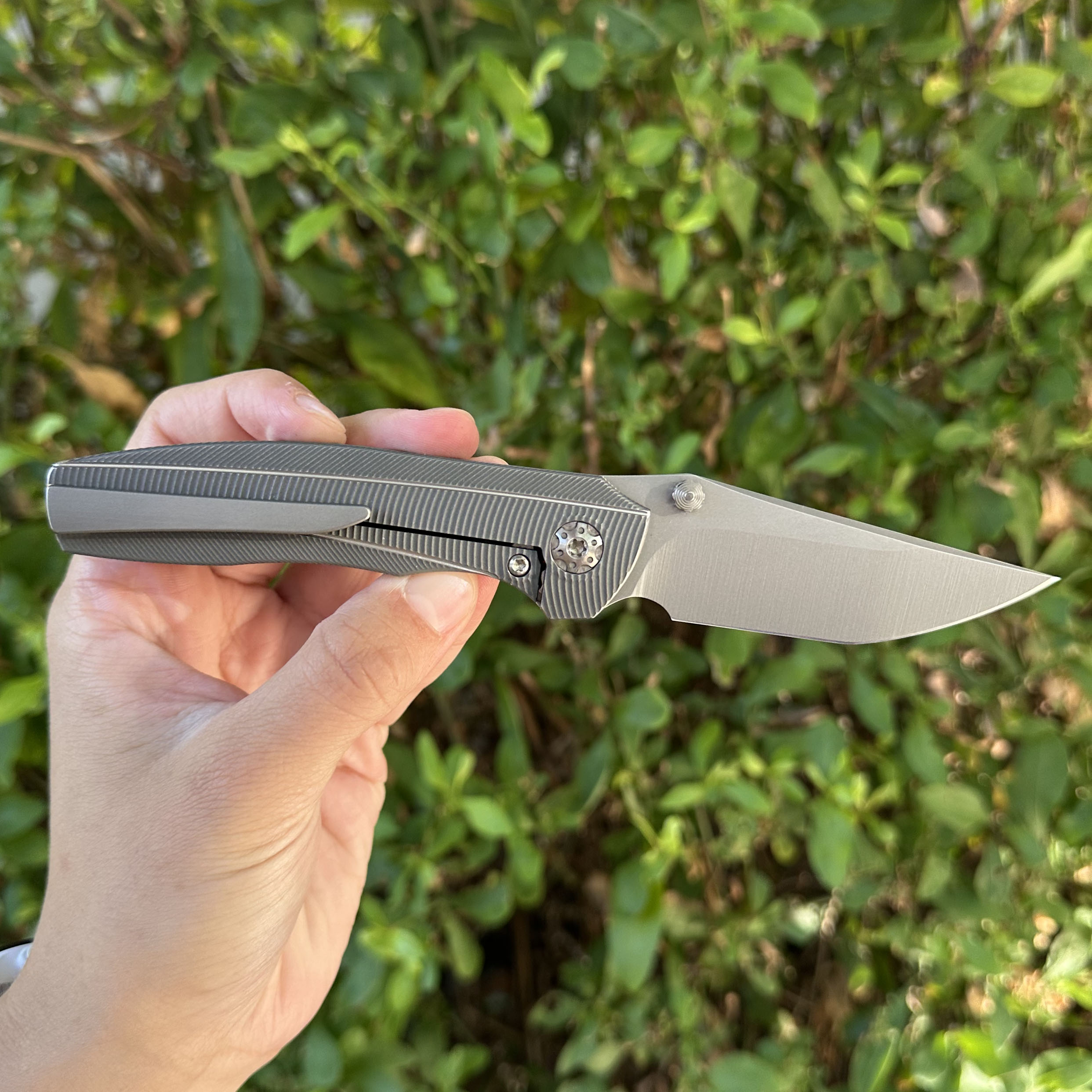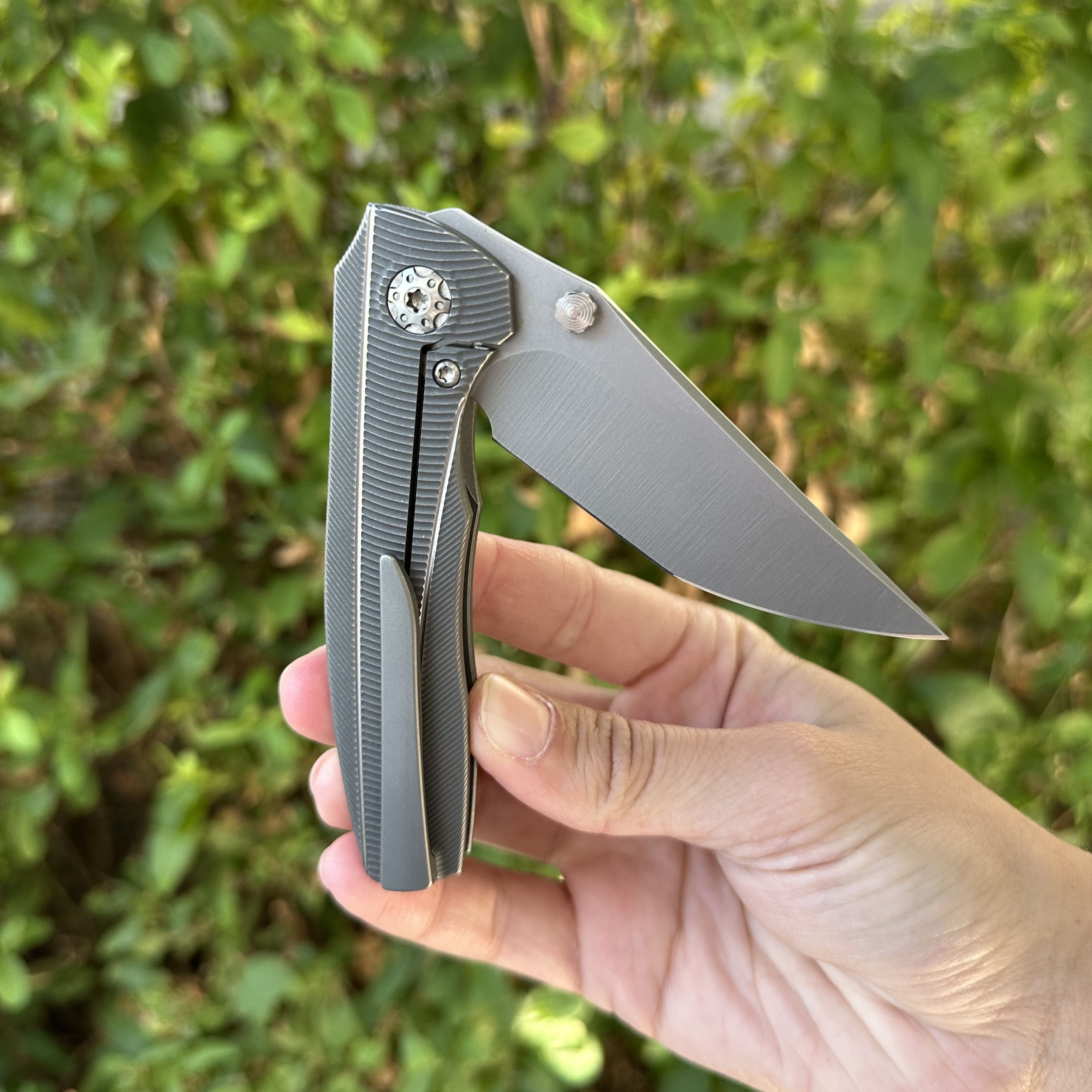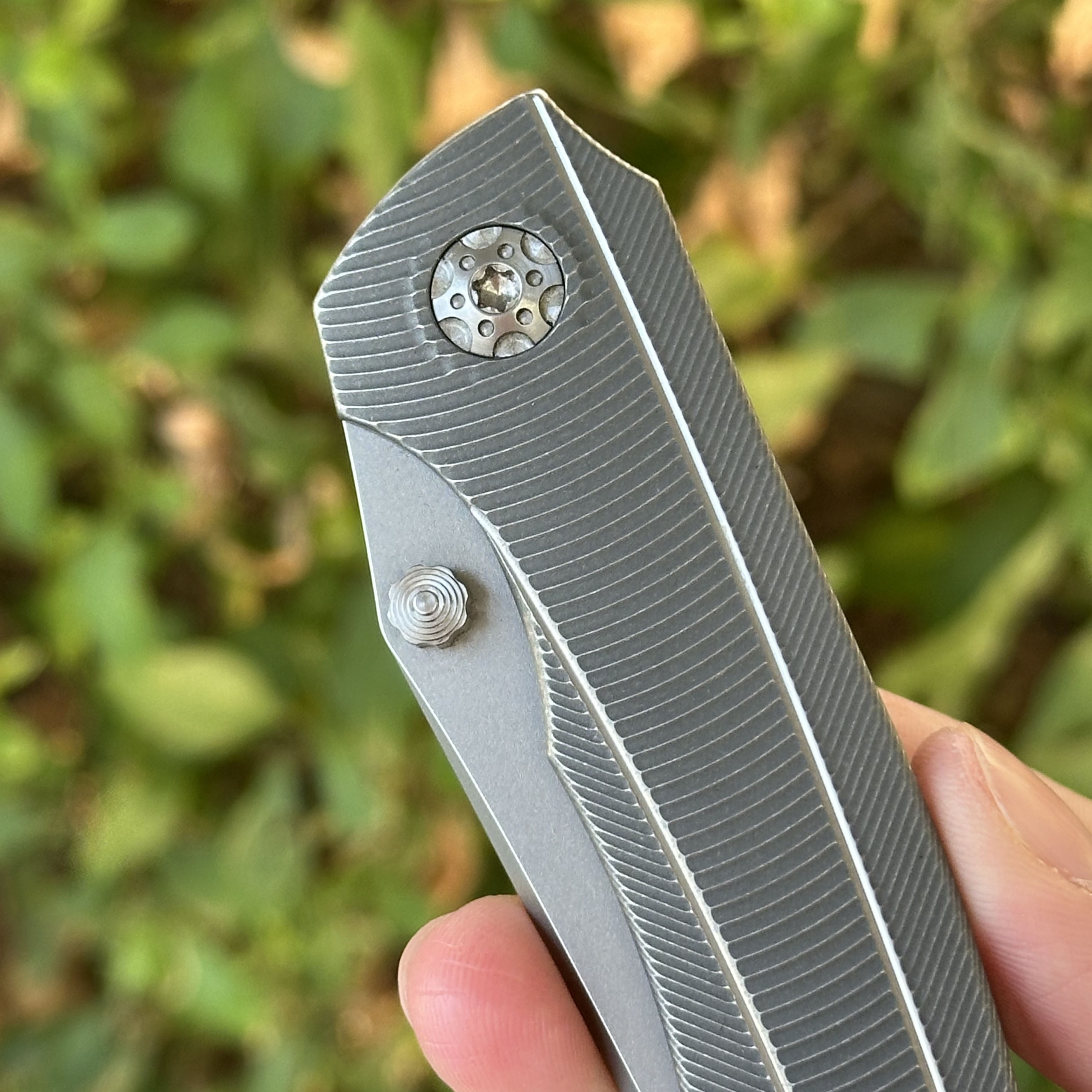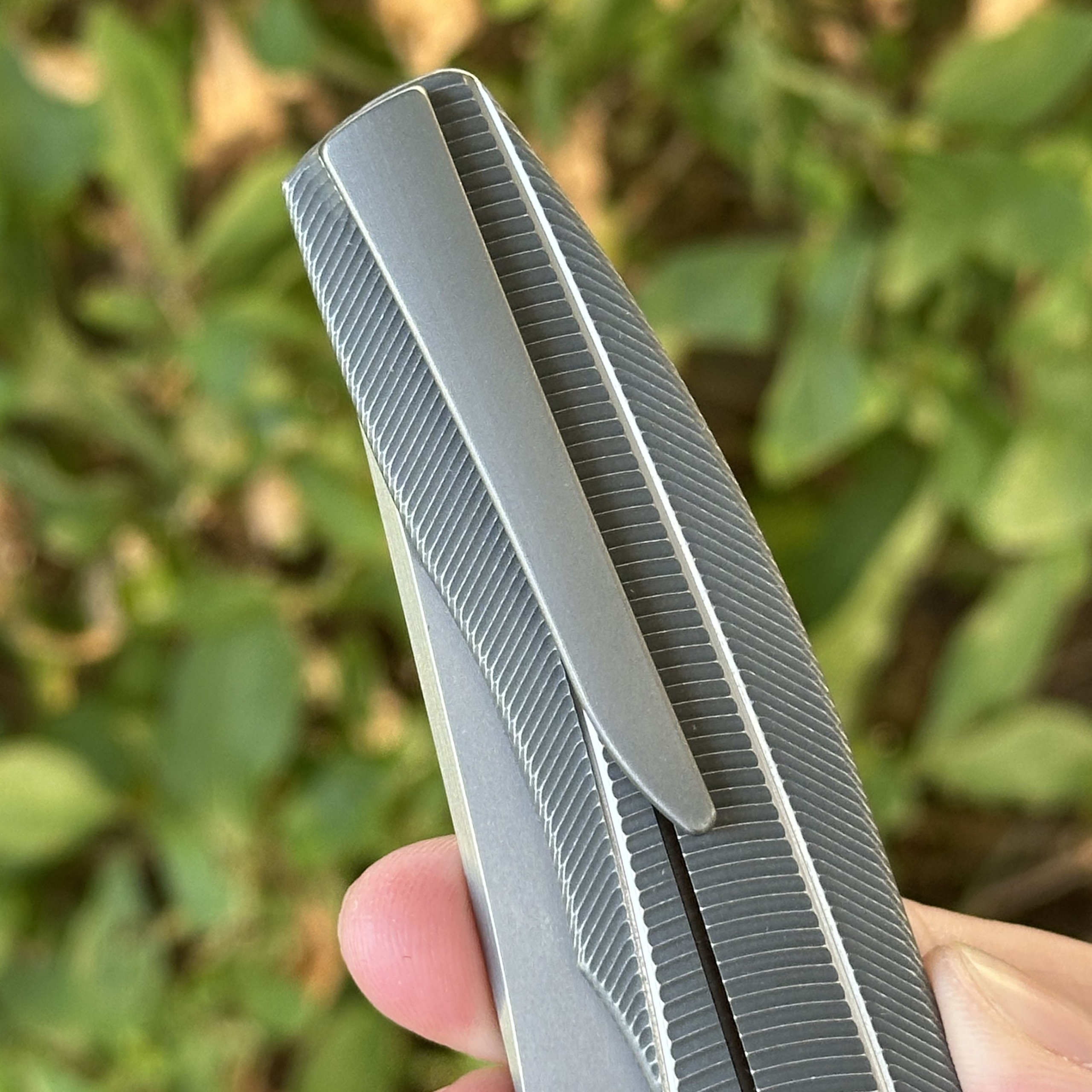 This Dukling by Kody Eutsler features an acid tumbled blade with dual thumbstuds. The handle has a stonewashed titanium frame with milled ribbingscales, tumbled titanium backspacer and tip up clip with hidden screws. Rides on bearings, nice detent, lockup and blade seating.