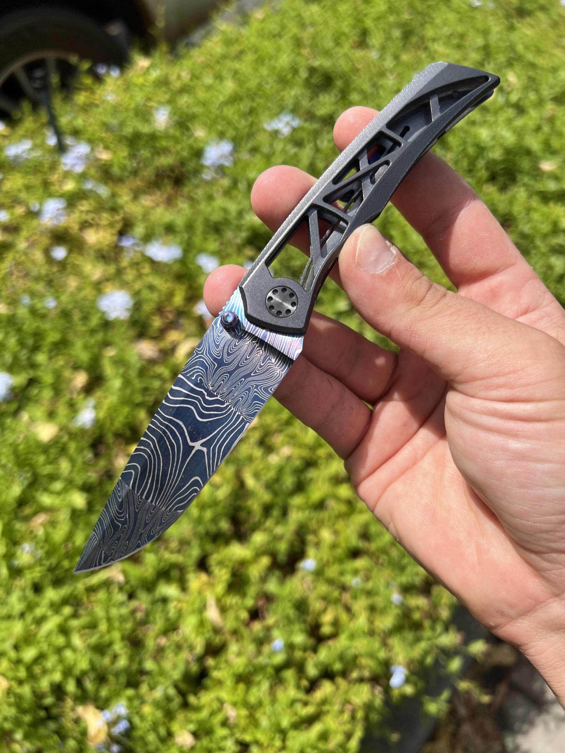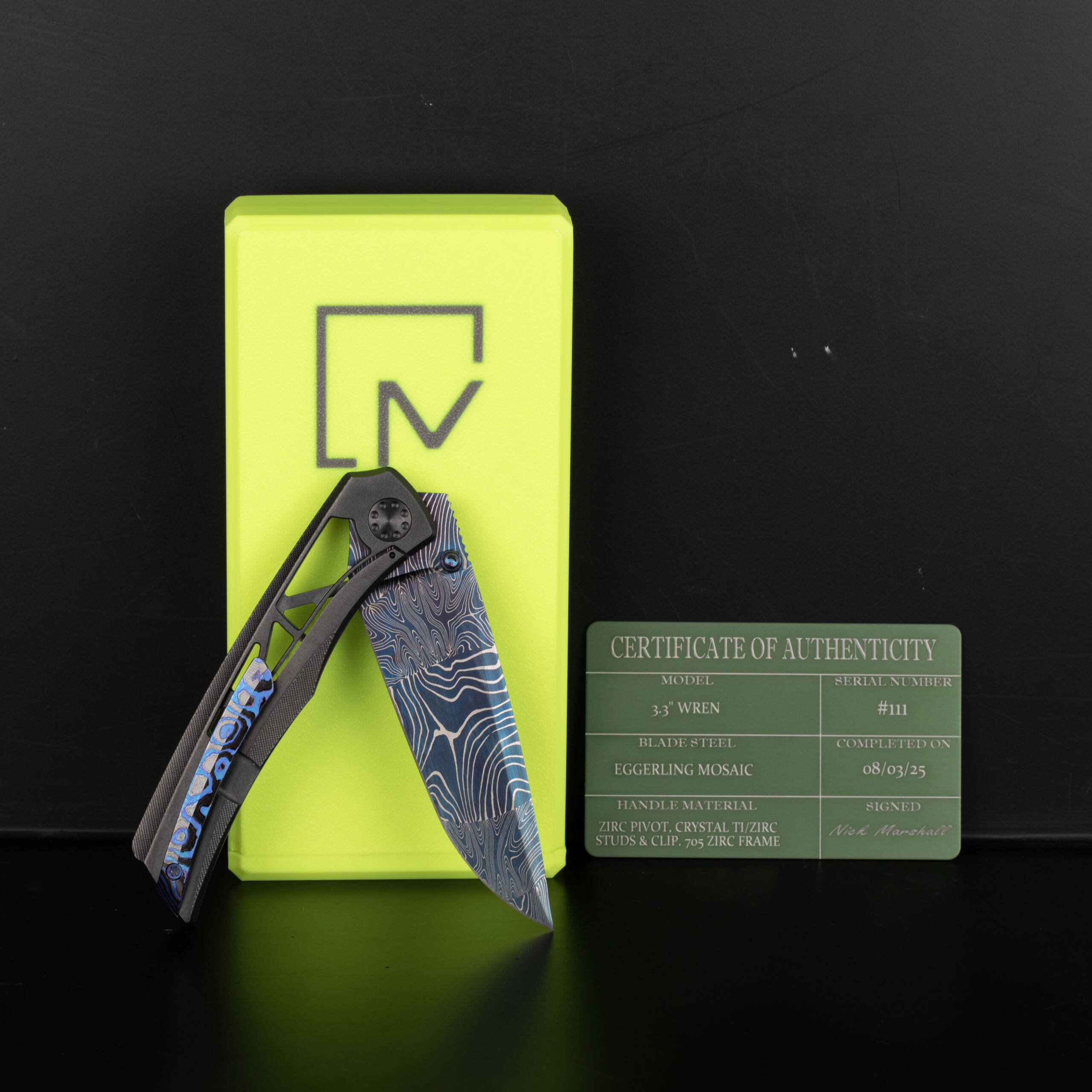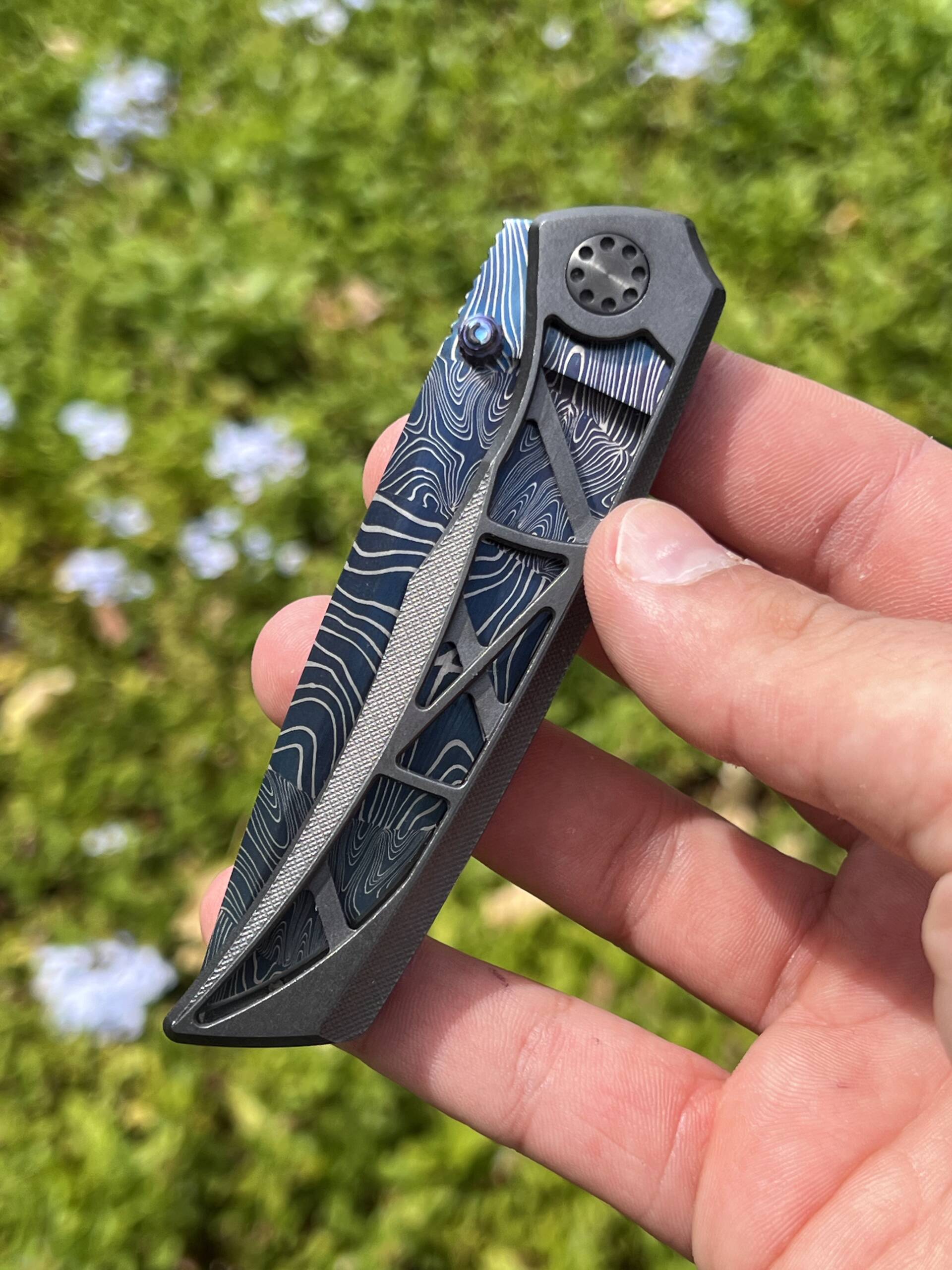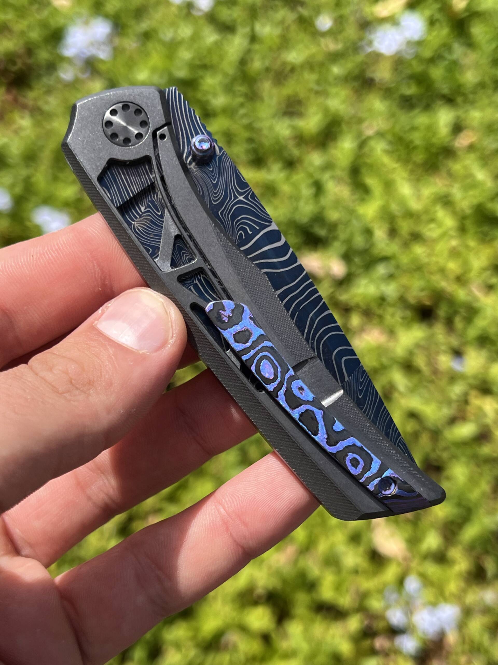Or as low as R20,000.00 / month interest-free, using your existing credit card. For orders over R100.00.How it worksA premium Maverick Concepts 3.3 Wren custom folder featuring a blue Eggerling Mosaic Damascus blade with a zirconium frame and zirc pivot hardware — built for serious collectors.