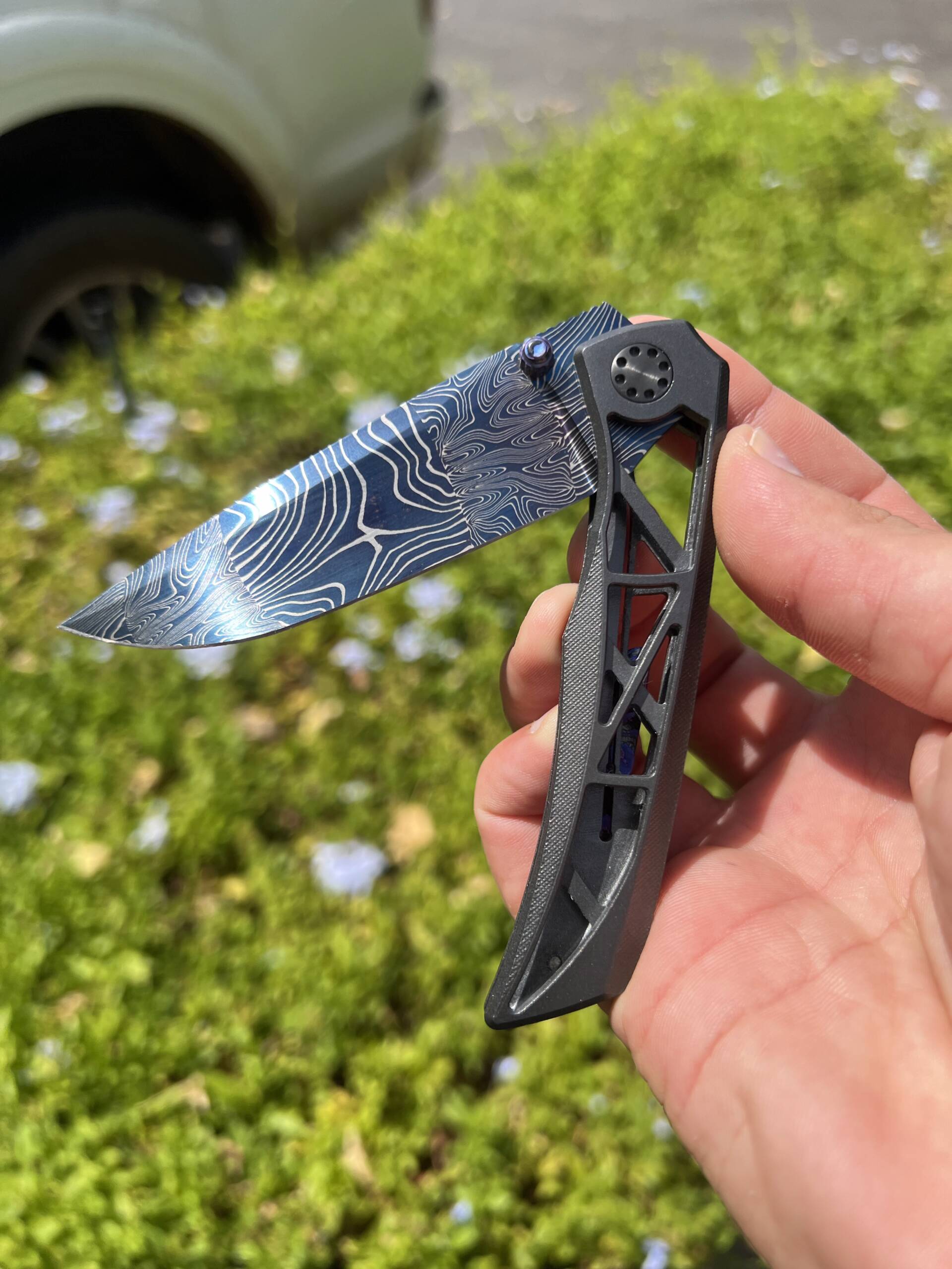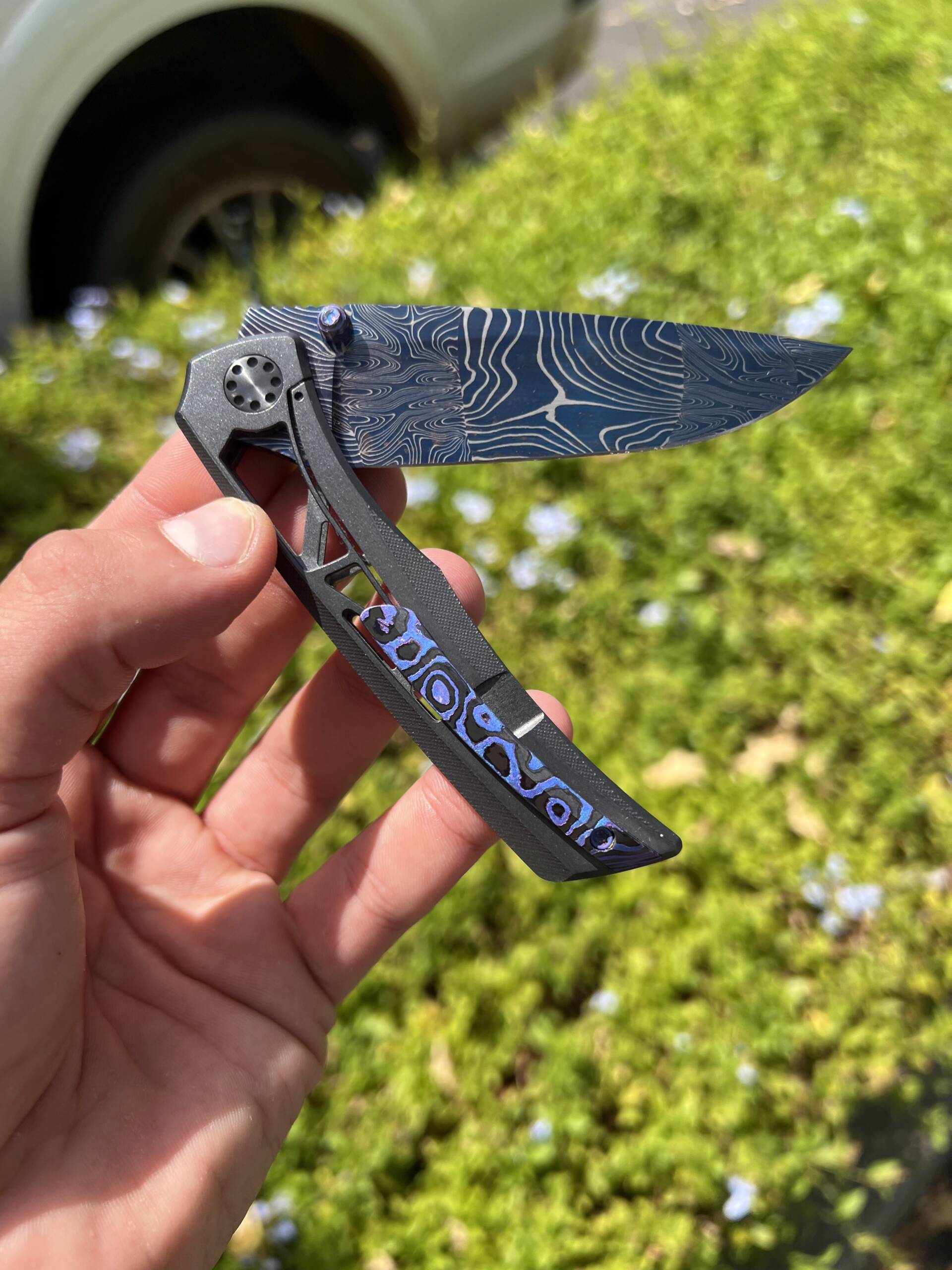 This example is fitted with an Eggerling Mosaic Damascus blade, delivering a striking, high-contrast pattern that instantly sets it apart from standard Damascus. The blade is finished in a blue tone, giving the knife an unmistakable visual identity while still keeping the overall look clean and premium.