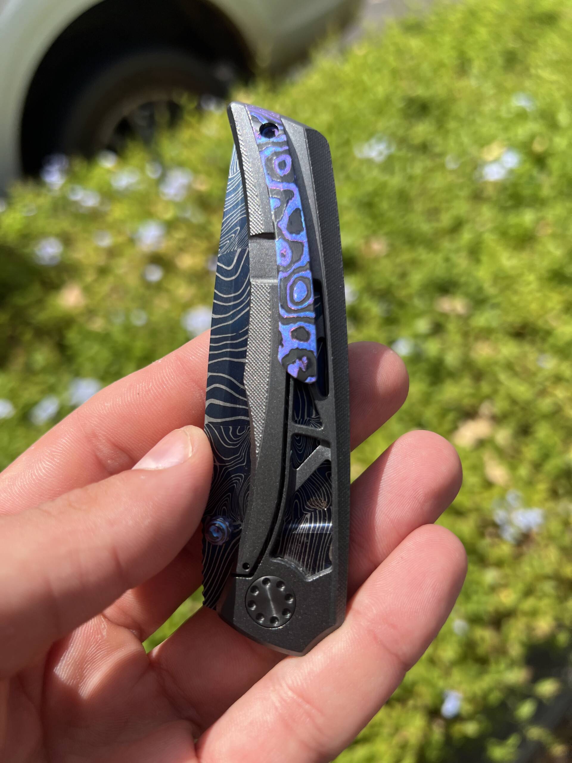 The handle features a zirconium frame and zirconium pivot hardware, adding both weighty presence and a deep, dark metallic character that collectors love. Zirconium is prized in the custom world for its durability, corrosion resistance, and the way it develops subtle depth under different lighting.