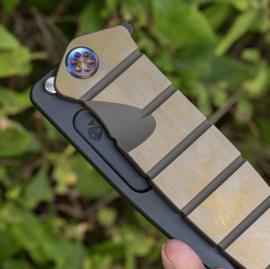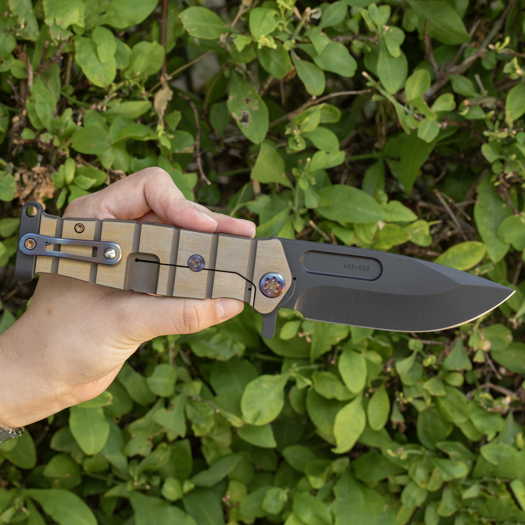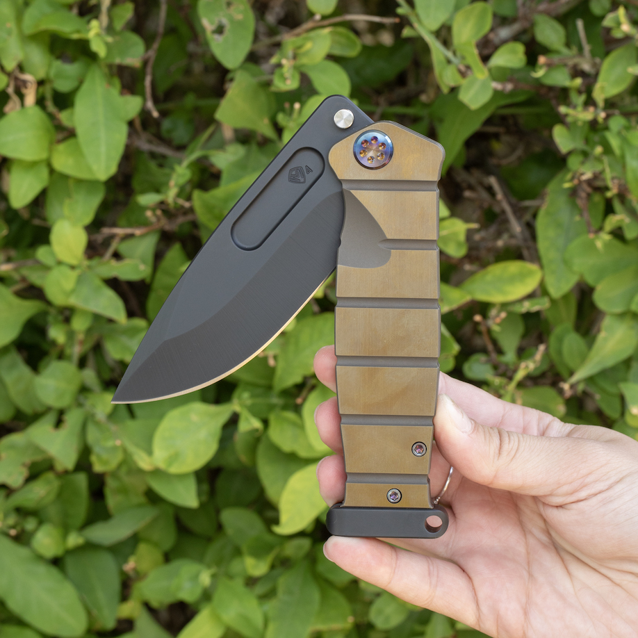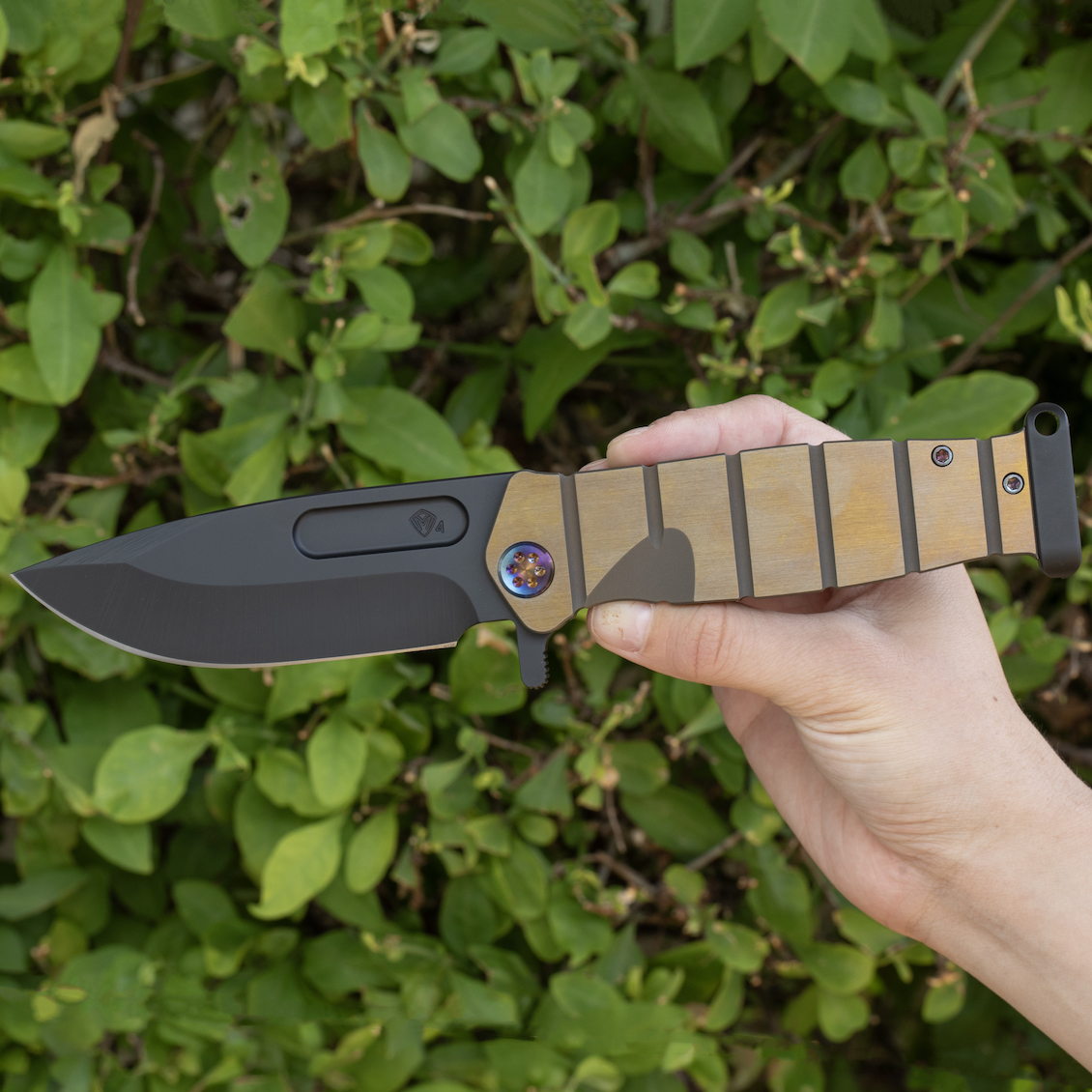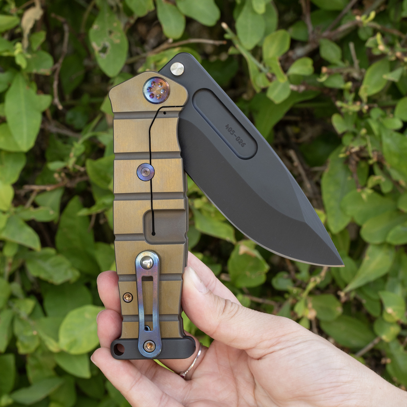 The handle combines black and brushed bronze with flame anodized hardware, delivering both style and a secure grip. The DLC-coated pommel and pocket clip ensure enhanced utility for demanding tasks.
