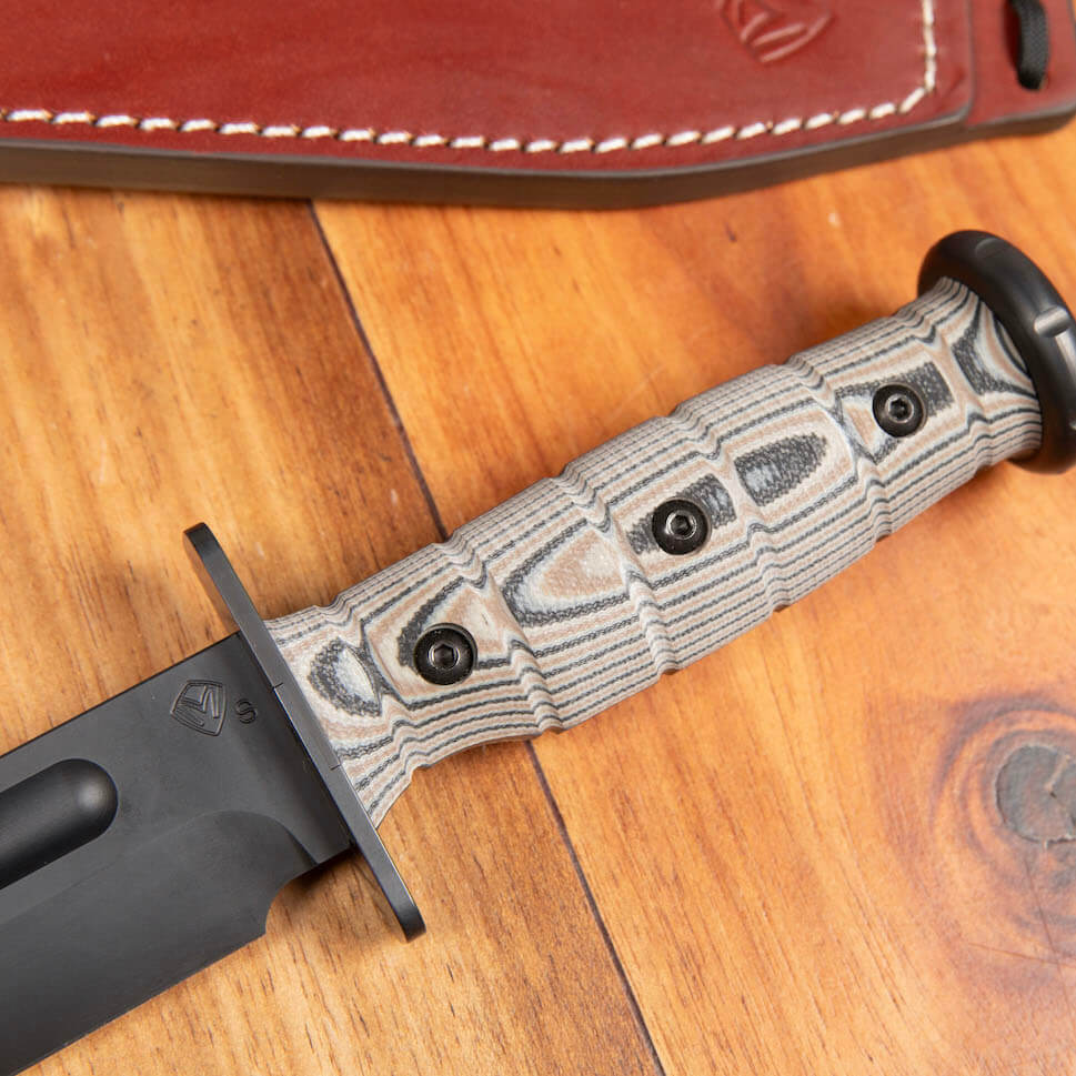 The multi-layered G-10 handle offers a secure, confidence-inspiring grip with striking visual depth, combining modern durability with classic field aesthetics. It’s paired with a premium leather sheath, giving you secure carry and a timeless finish that suits both the field and the collection.