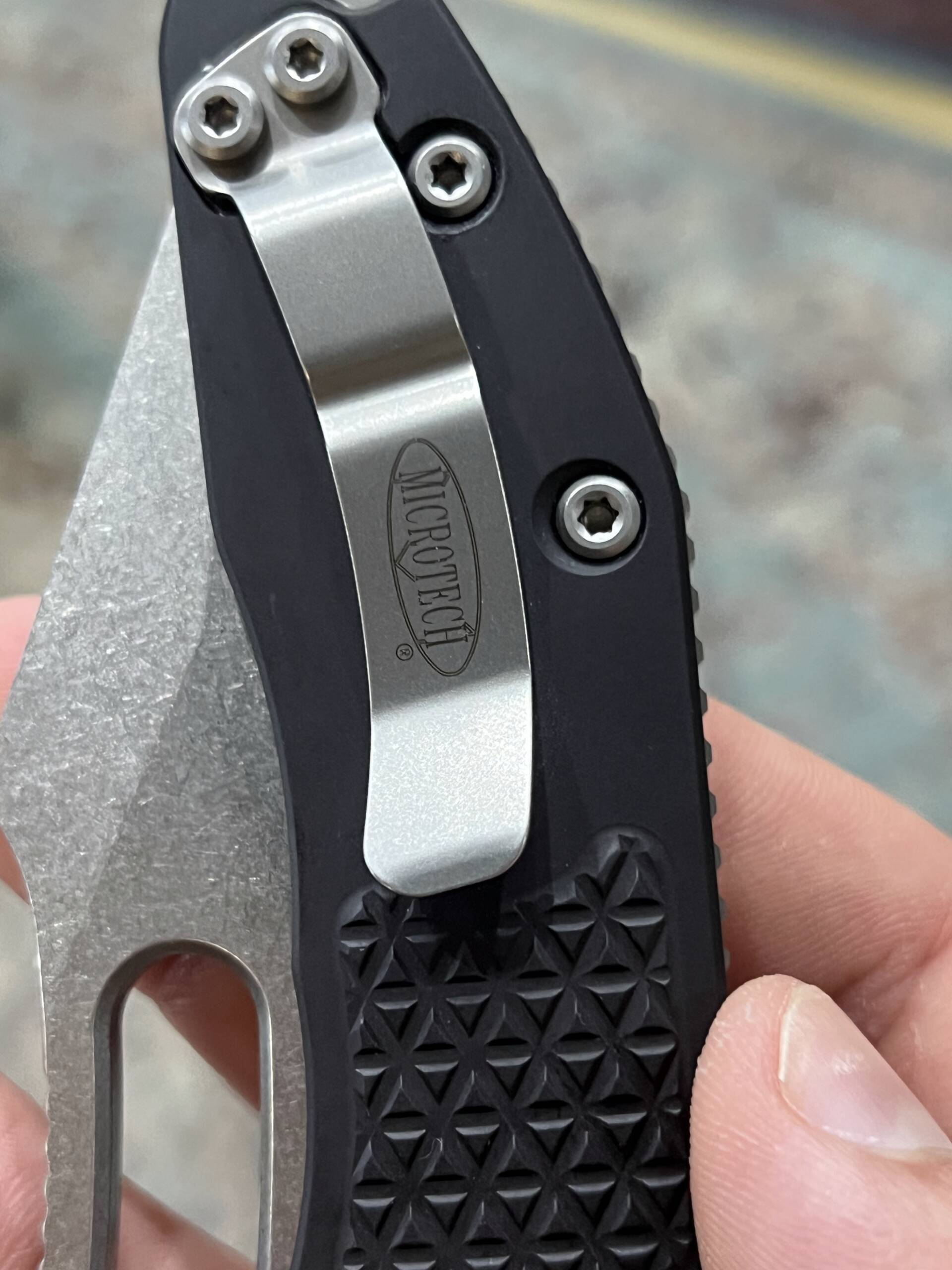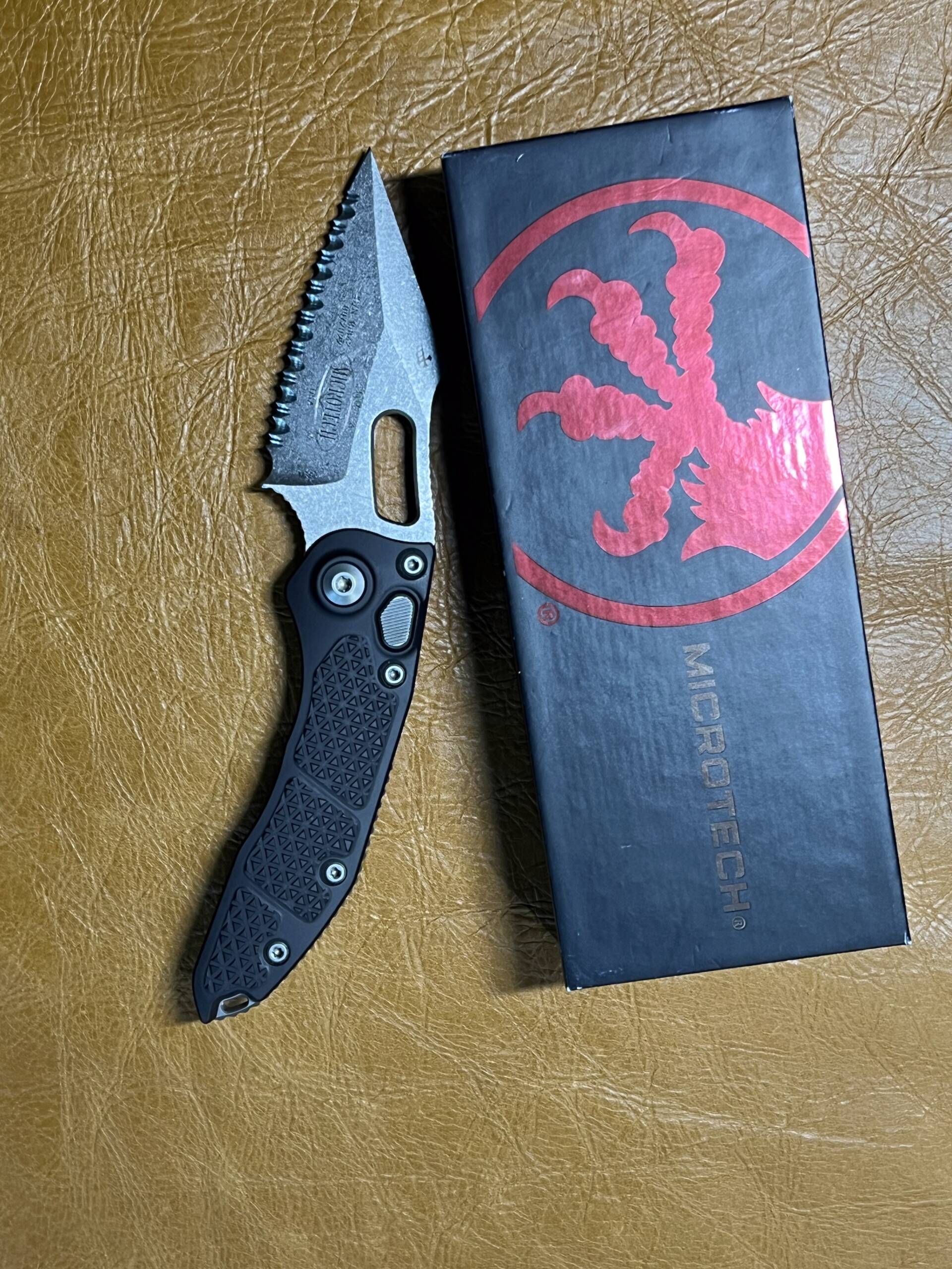 This model features a stonewashed spear point blade paired with a pronounced thumb ramp and deep finger choil, giving you excellent control for hard-use cutting. The black knurled alloy handle adds a confident grip and a rugged tactical look, while Microtech’s crisp automatic action makes deployment fast, smooth, and addictive.