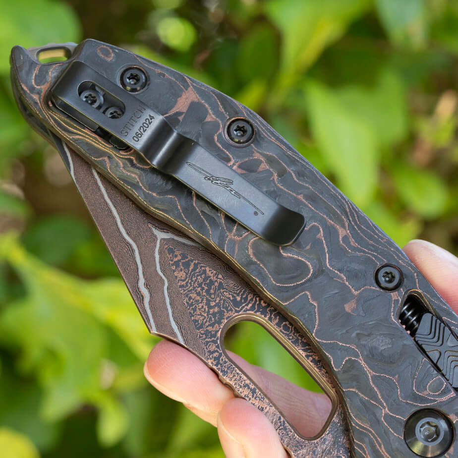 The Microtech Damascus Stitch RAM LOK is a true masterpiece in the Signature Series, combining performance with an eye for detail. This special edition features a Baker Forge Damascus blade, a Protech Composites Live Wire Carbon Fiber handle, and a bronze titanium backspacer, creating a striking aesthetic. Each knife is unique, with slight variations in the Damascus blade and carbon fiber handle, ensuring no two are exactly alike. Accented with two-tone DLC hardware, this 3.6″ M390MK blade offers exceptional cutting power, making it a standout piece for any collector or everyday carry enthusiast. At 8.5″ overall length and weighing 6.6 oz, the Microtech Damascus Stitch RAM LOK Stitch is as functional as it is beautiful.