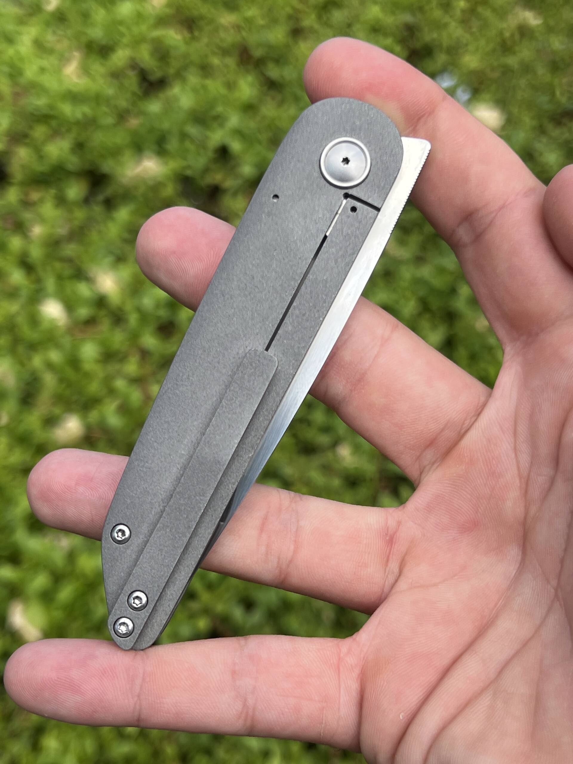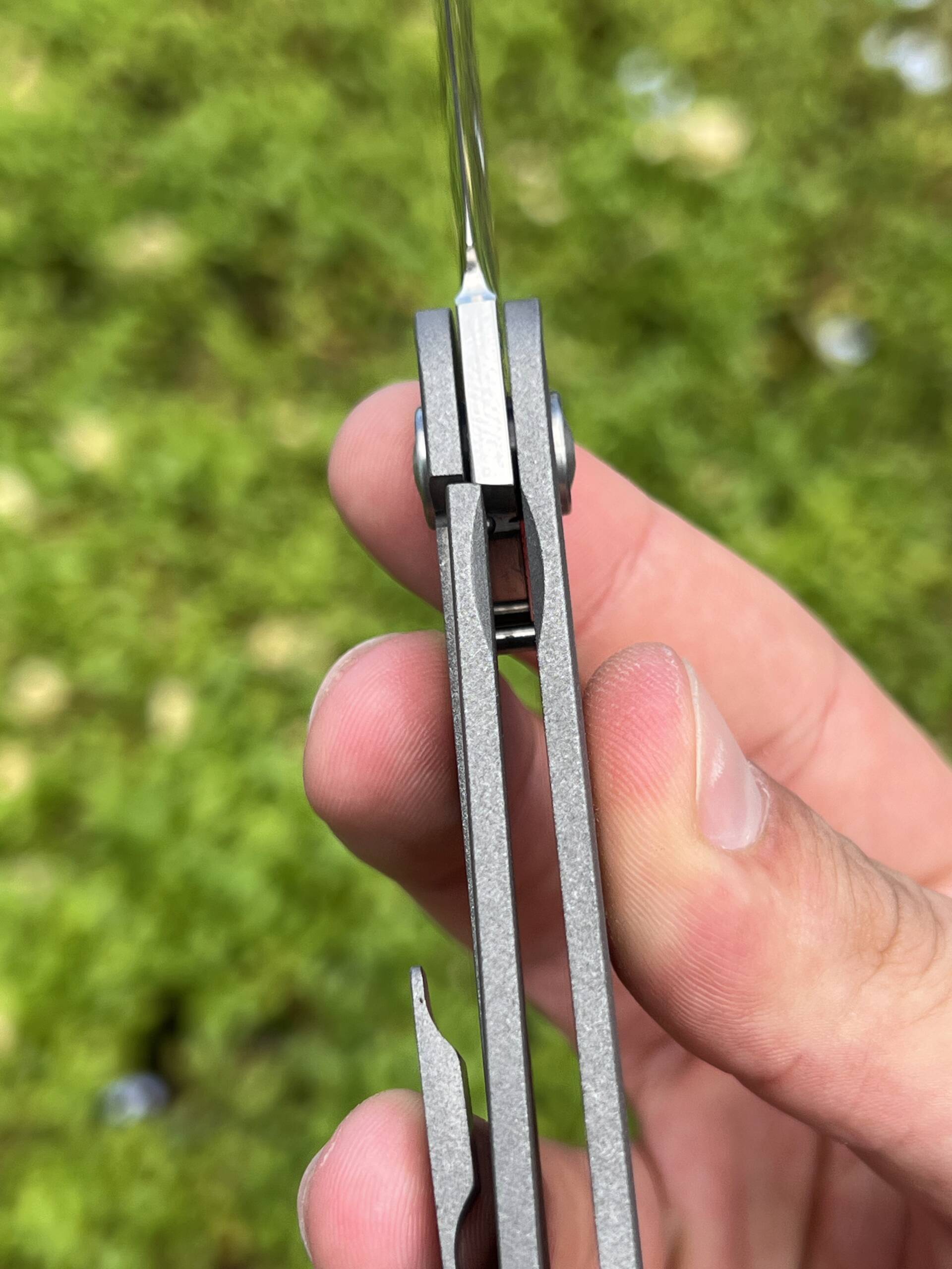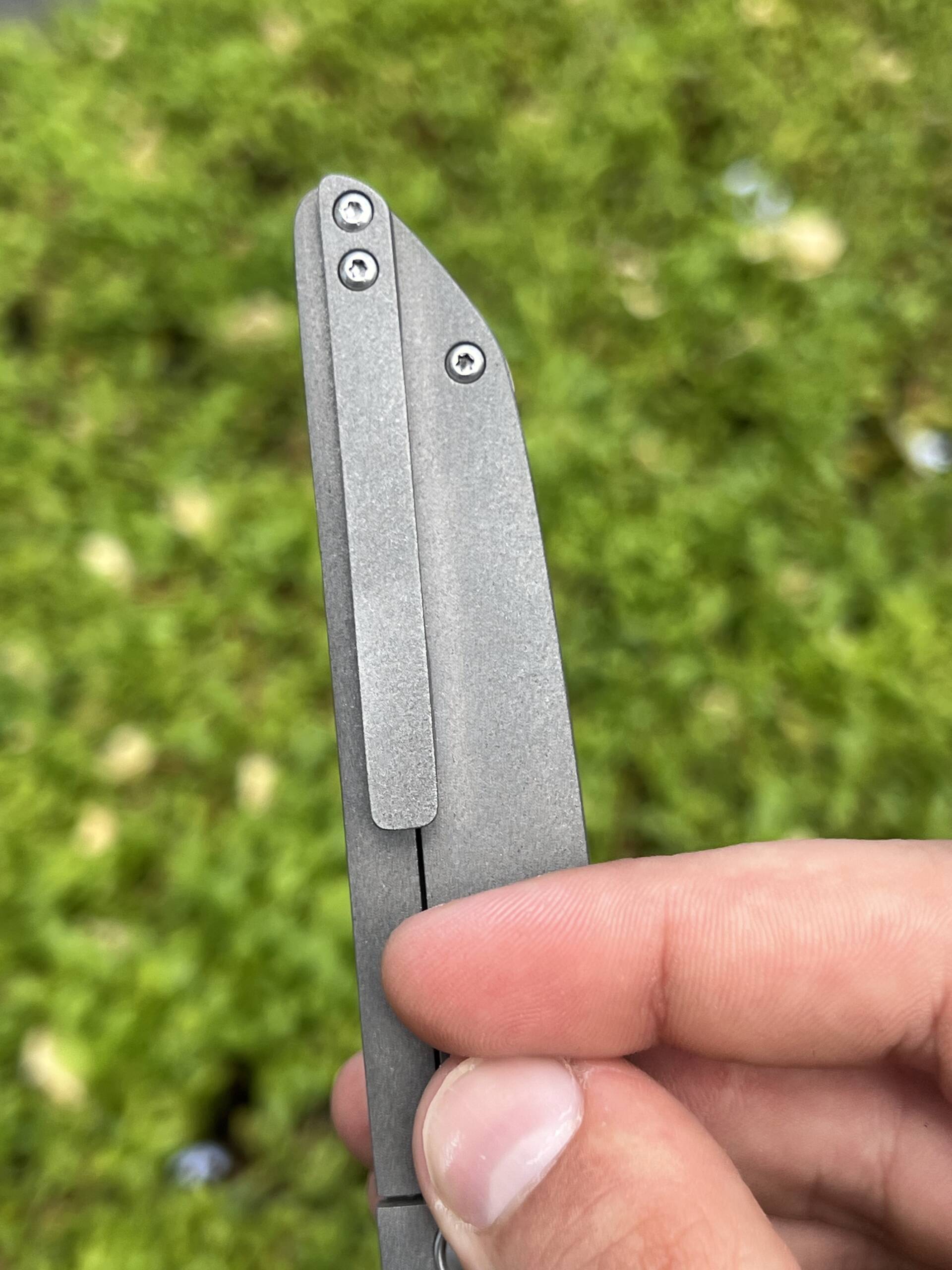 The frame and pocket clip are crafted from titanium and finished in a sandblasted texture, giving the knife a purposeful, low-glare look while improving grip and hiding everyday wear. A matching titanium backstrap completes the build, adding rigidity and a premium, cohesive finish.