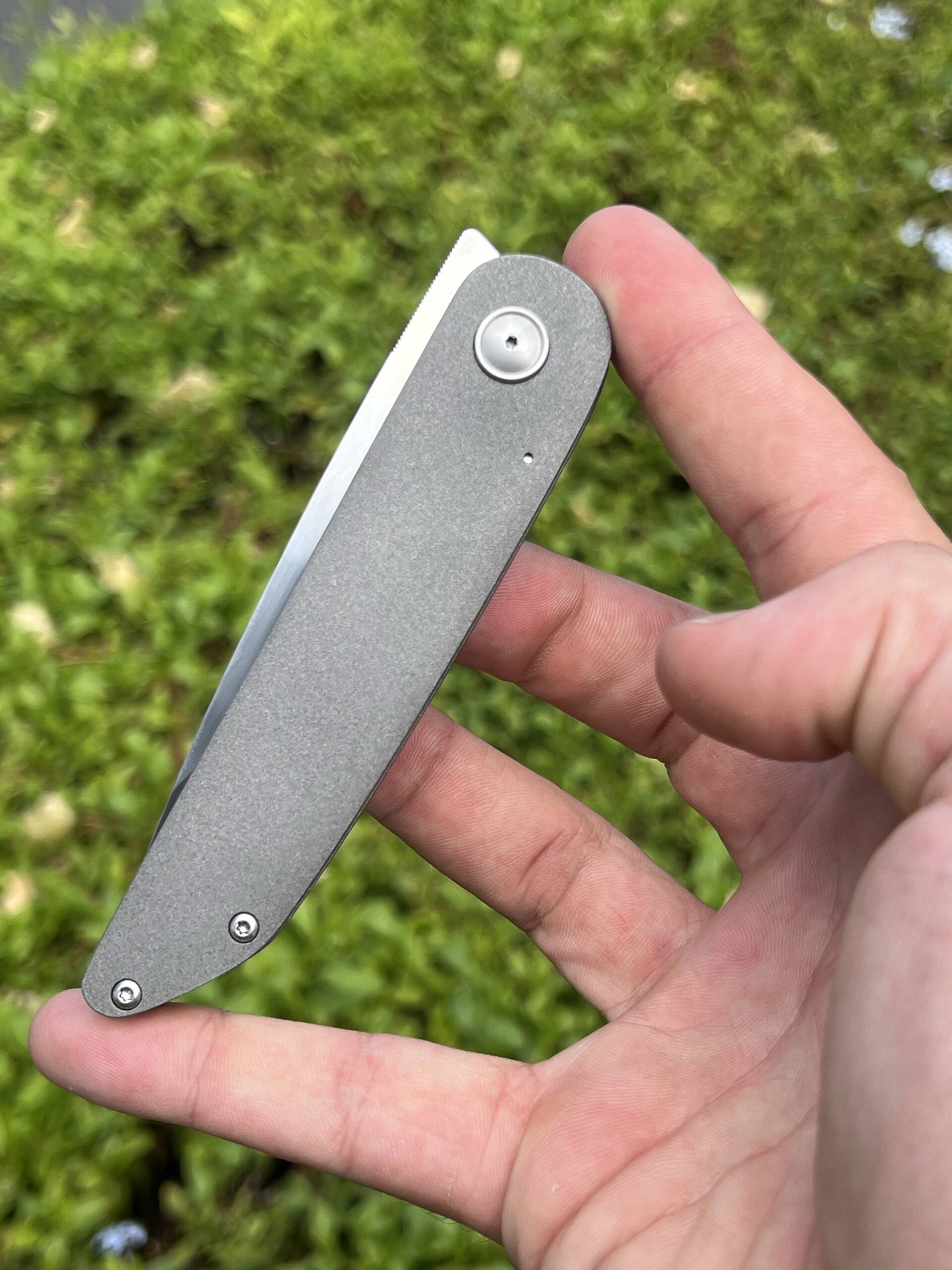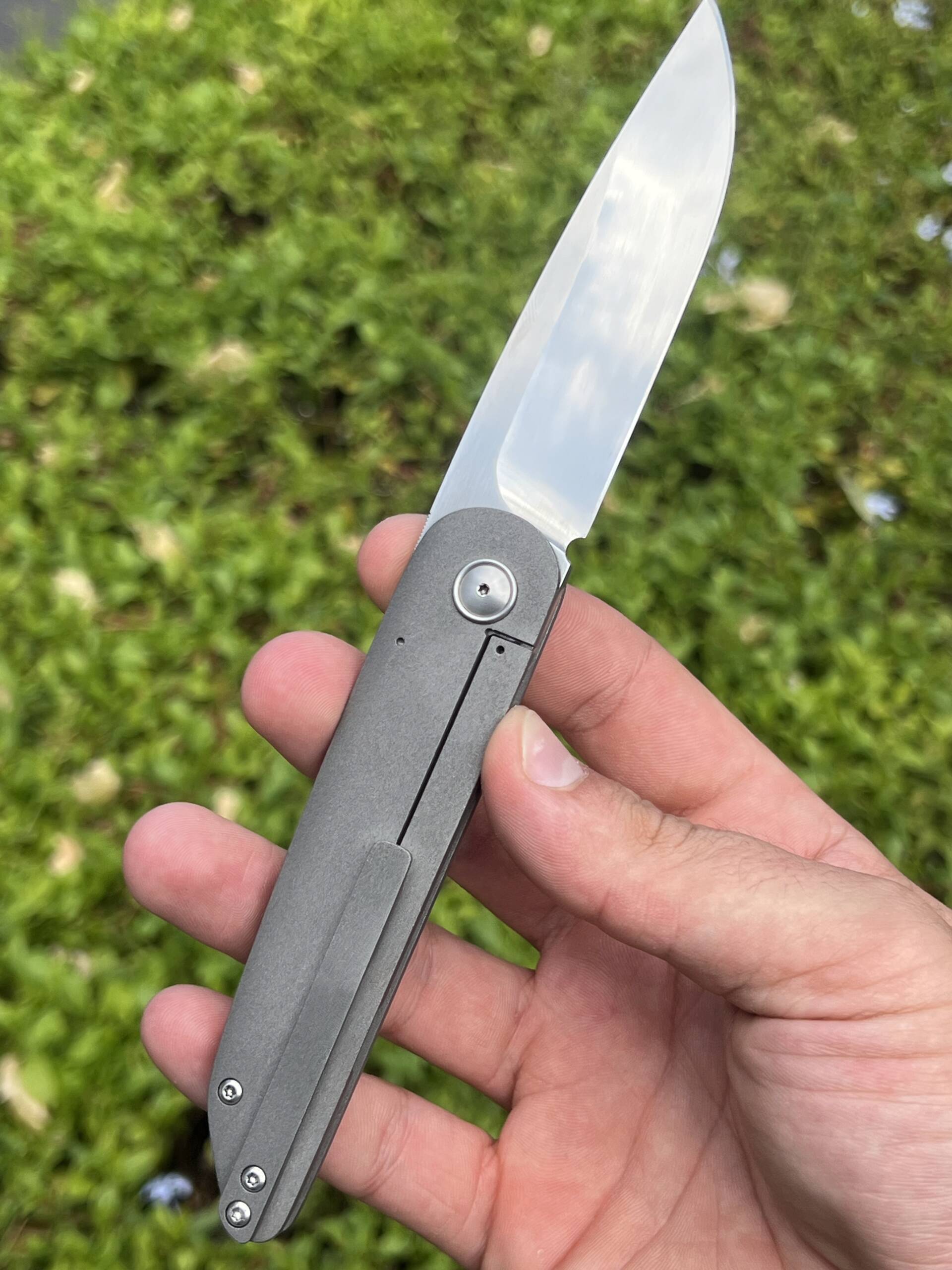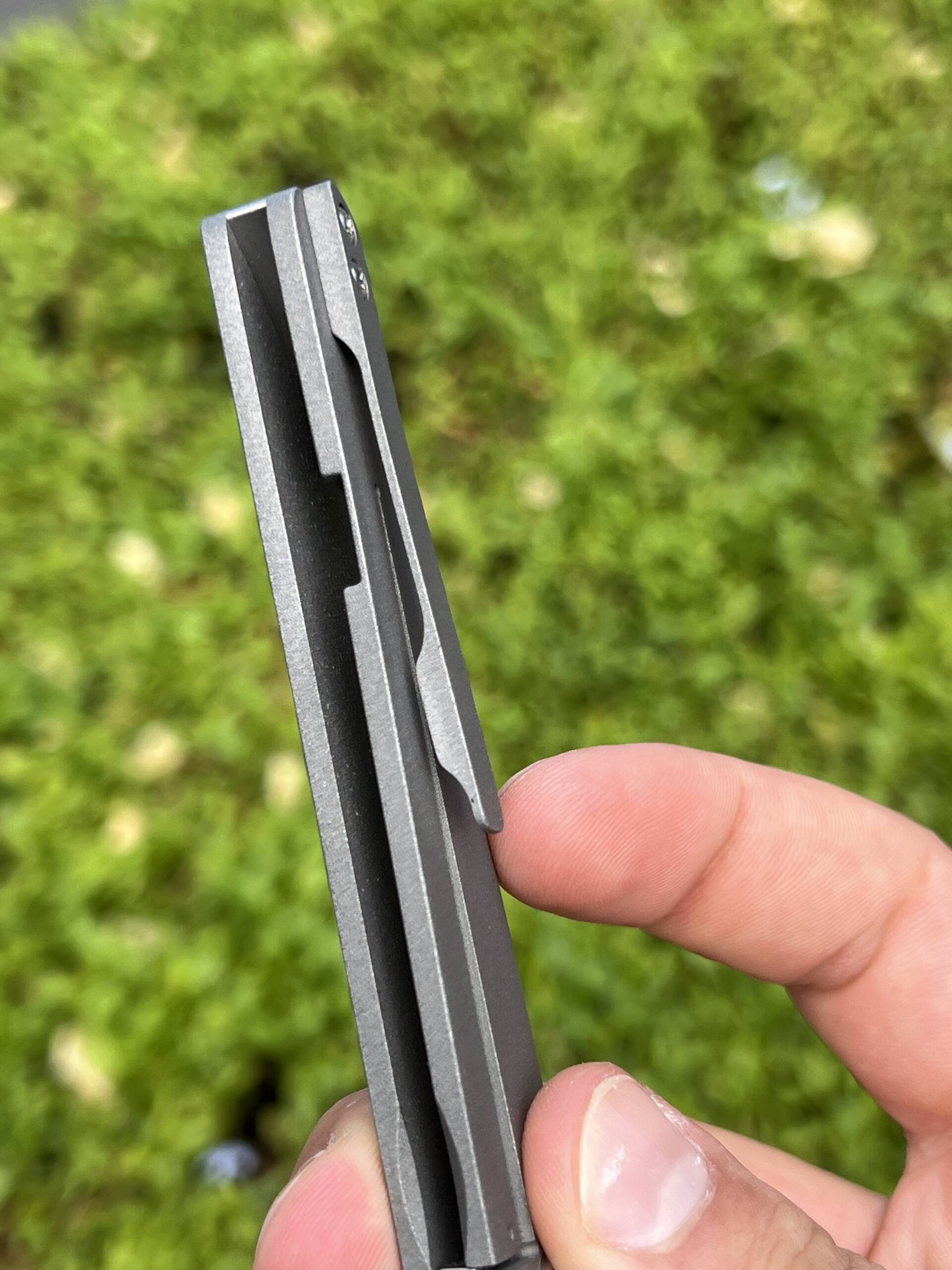 The frame and pocket clip are crafted from titanium and finished in a sandblasted texture, giving the knife a purposeful, low-glare look while improving grip and hiding everyday wear. A matching titanium backstrap completes the build, adding rigidity and a premium, cohesive finish.
