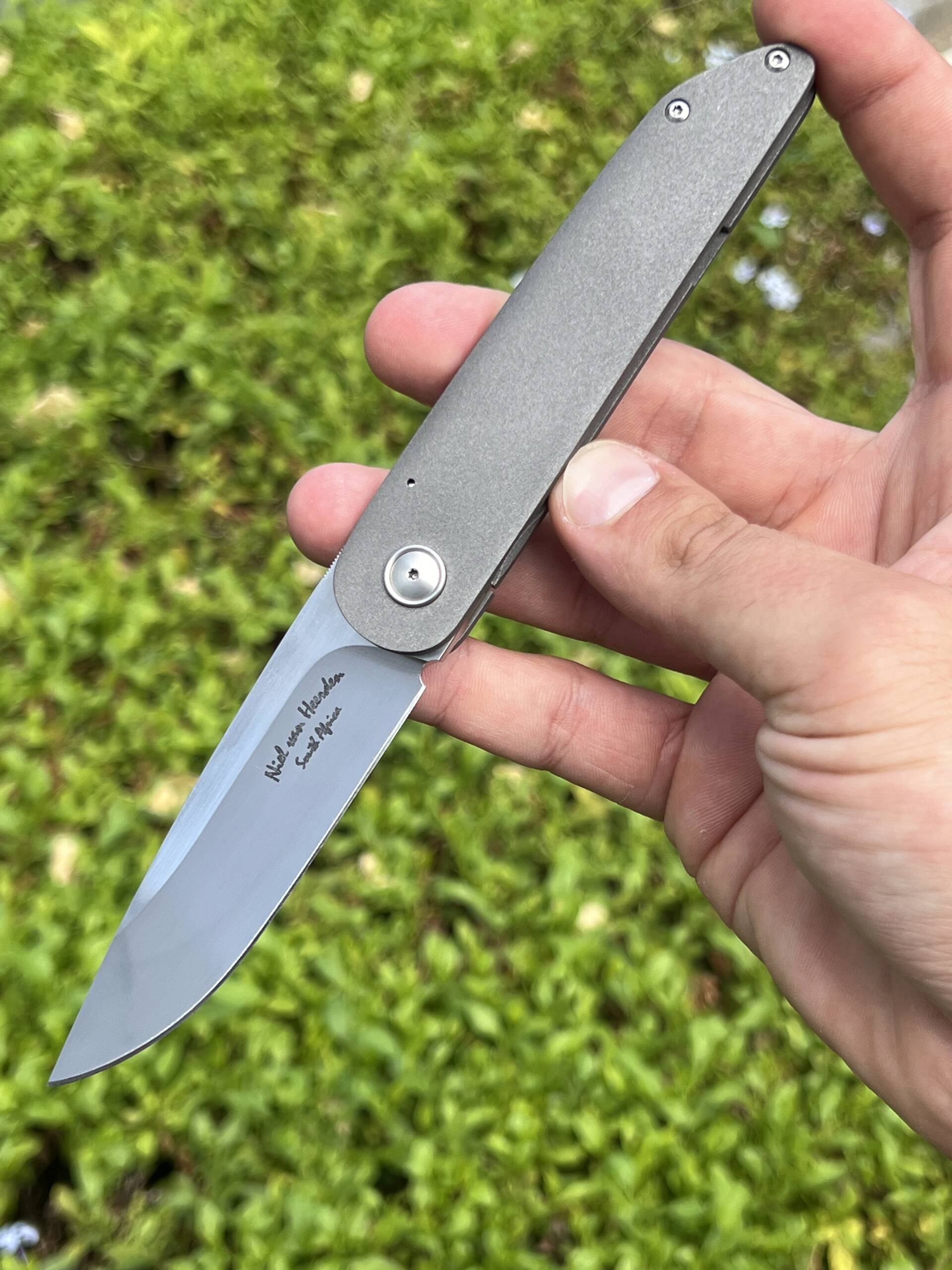 Or as low as R1,200.00 / month interest-free, using your existing credit card. For orders over R100.00.How it worksCustom folder by Niel van Heerden featuring a front frame lock, Becut stainless blade, and a sandblasted titanium frame, clip, and backstrap. Clean, functional, and built for premium EDC.