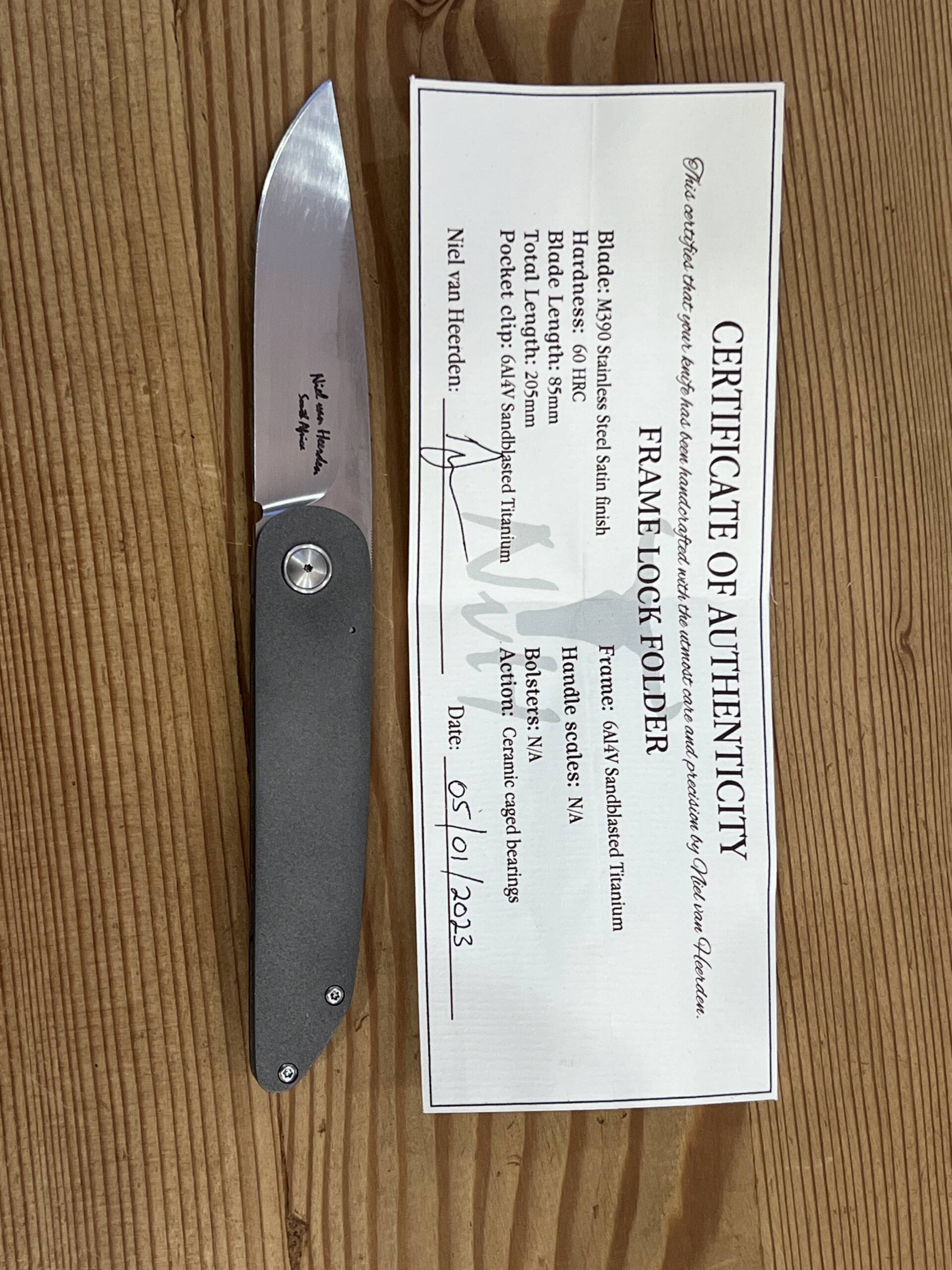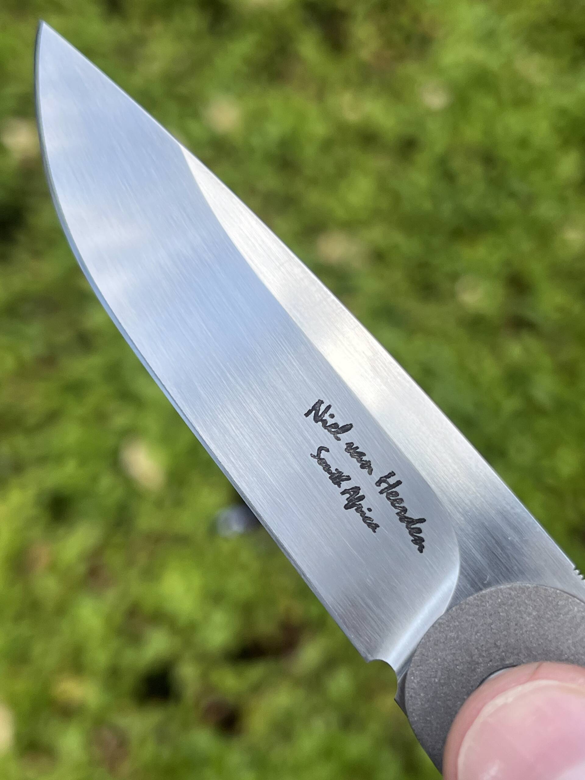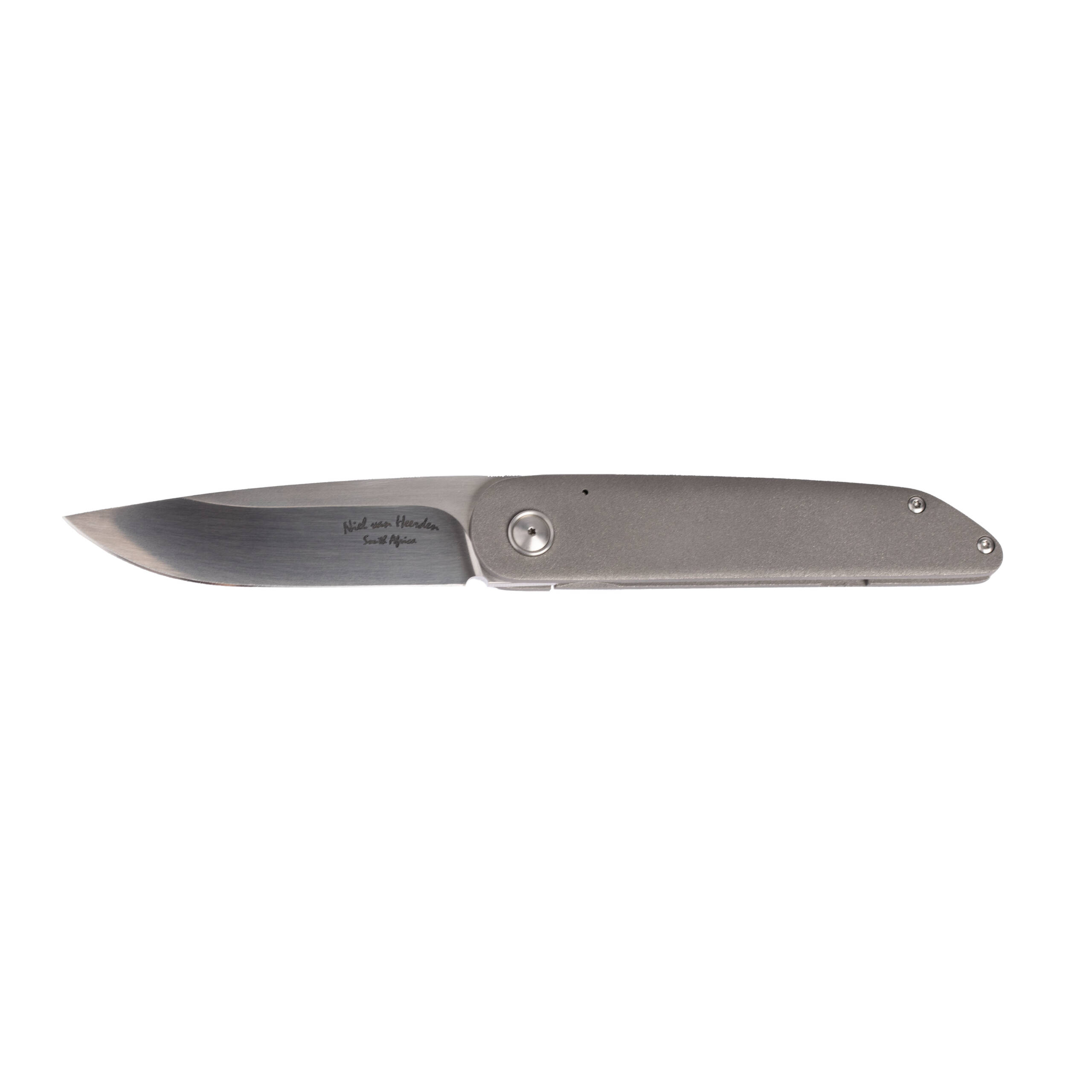 Niel van Heerden Custom Knives – Front Frame Lock, Becut Stainless, Sandblasted Titanium