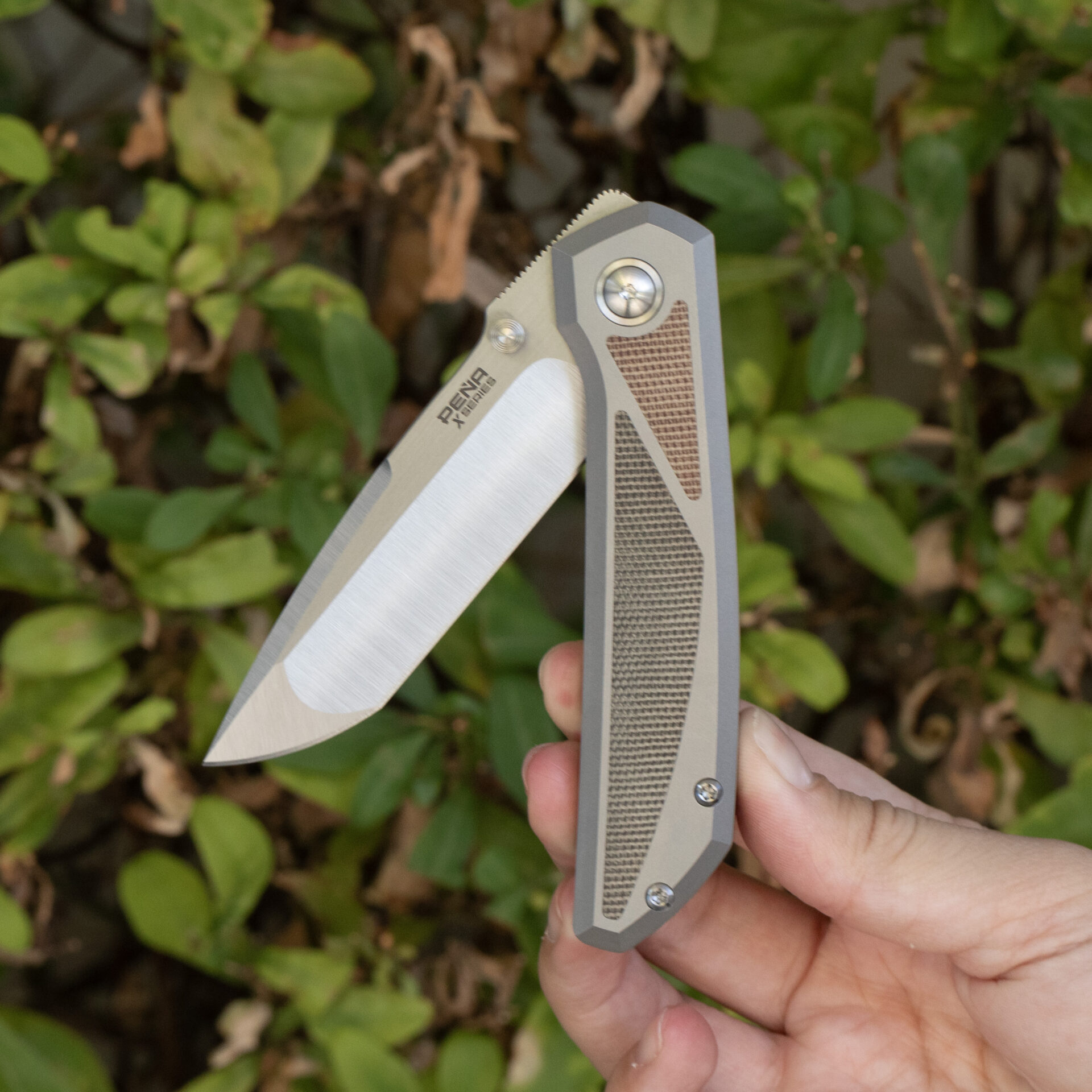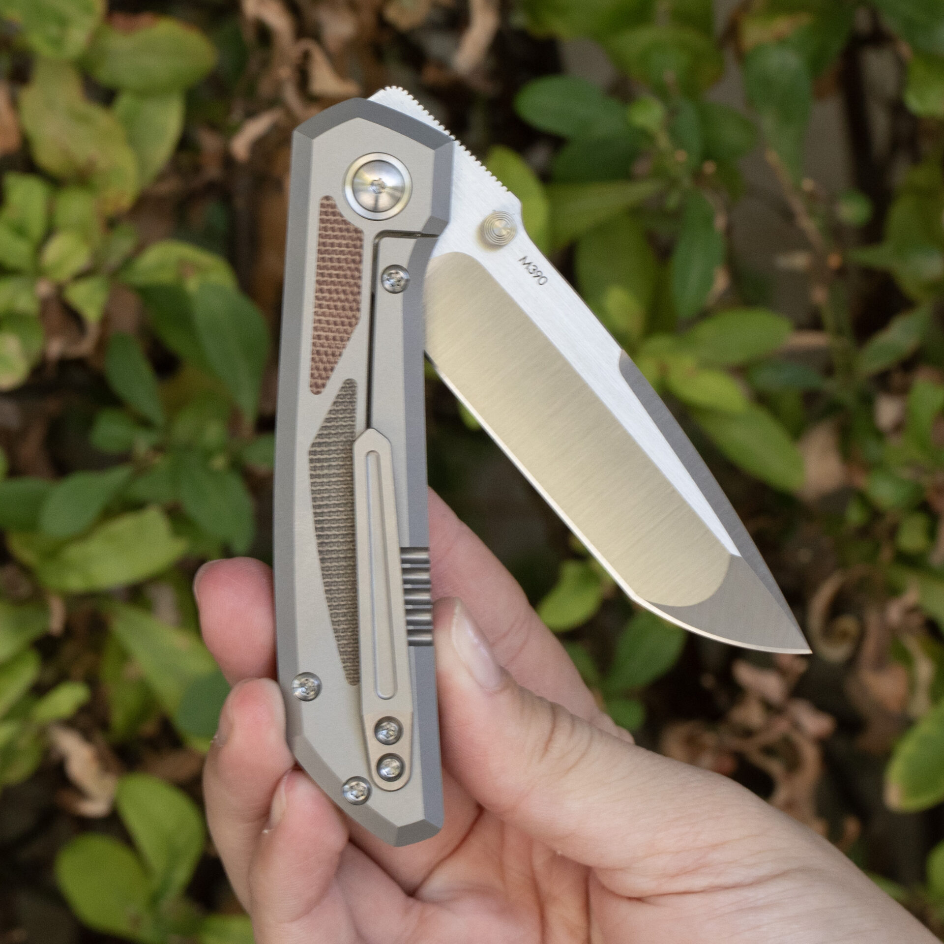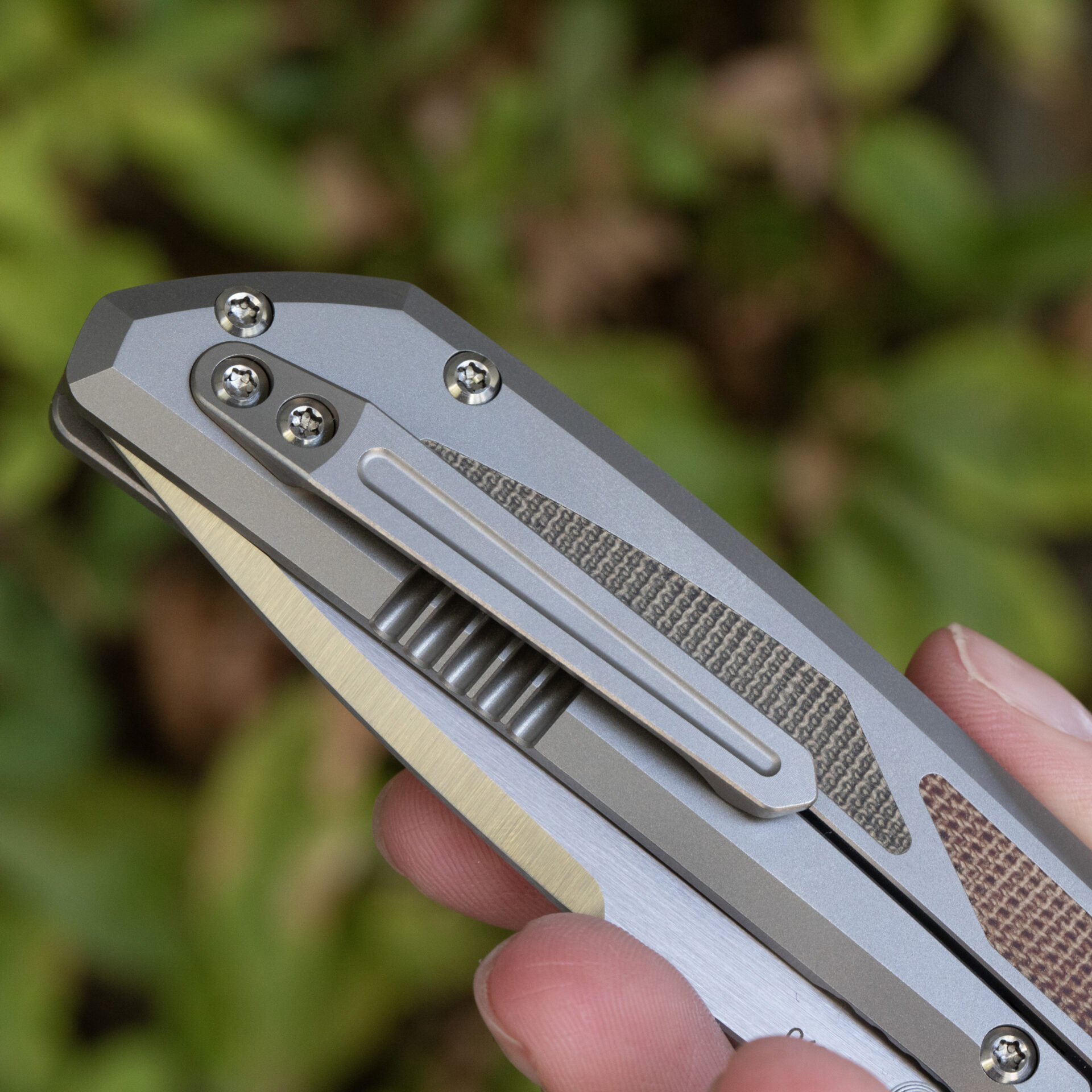 The handle of the New Mula is crafted from a blend of Brown & Green Micarta, providing a unique and visually striking appearance. The anodized titanium pivot collar further enhances the knife’s visual appeal, making it a standout addition to any collection.