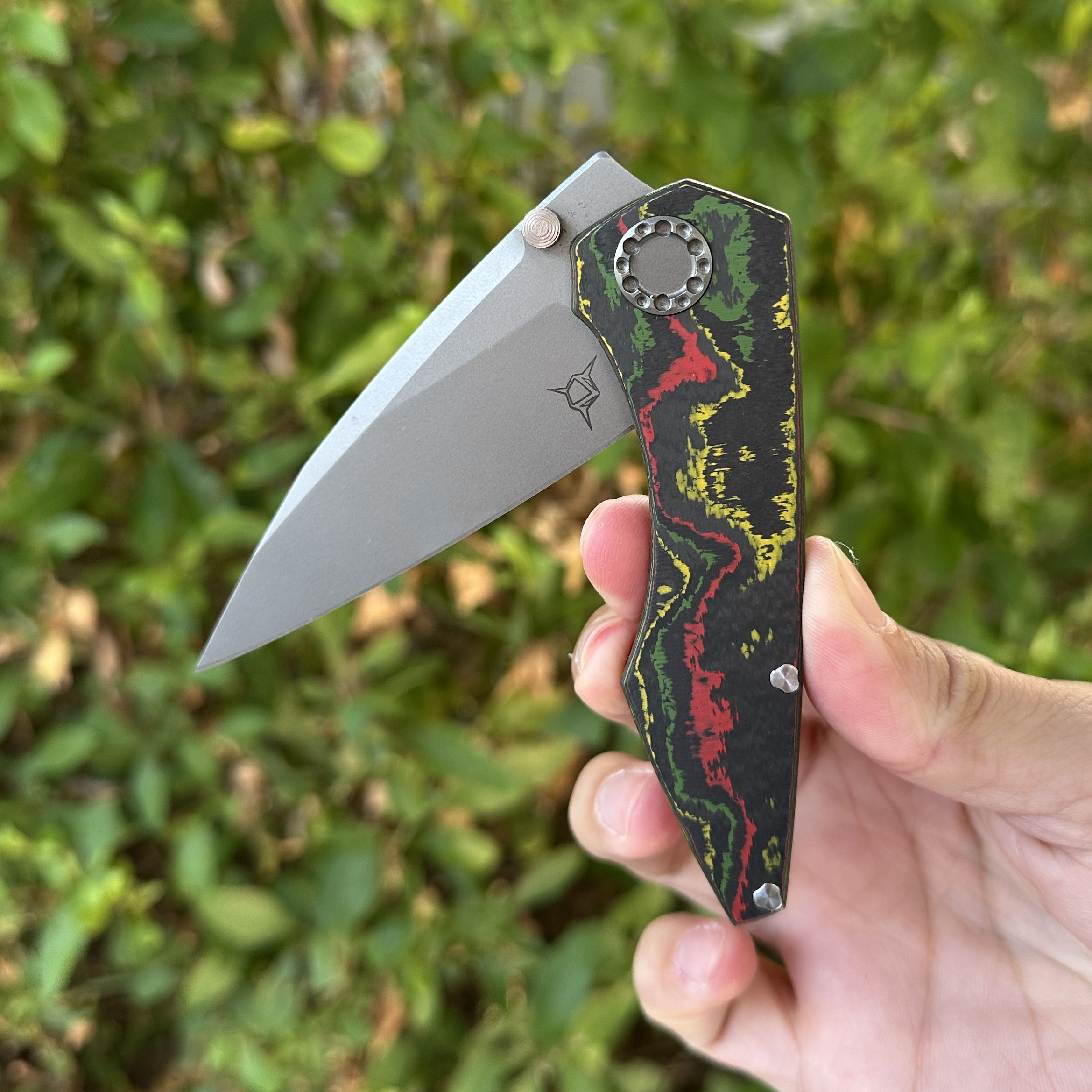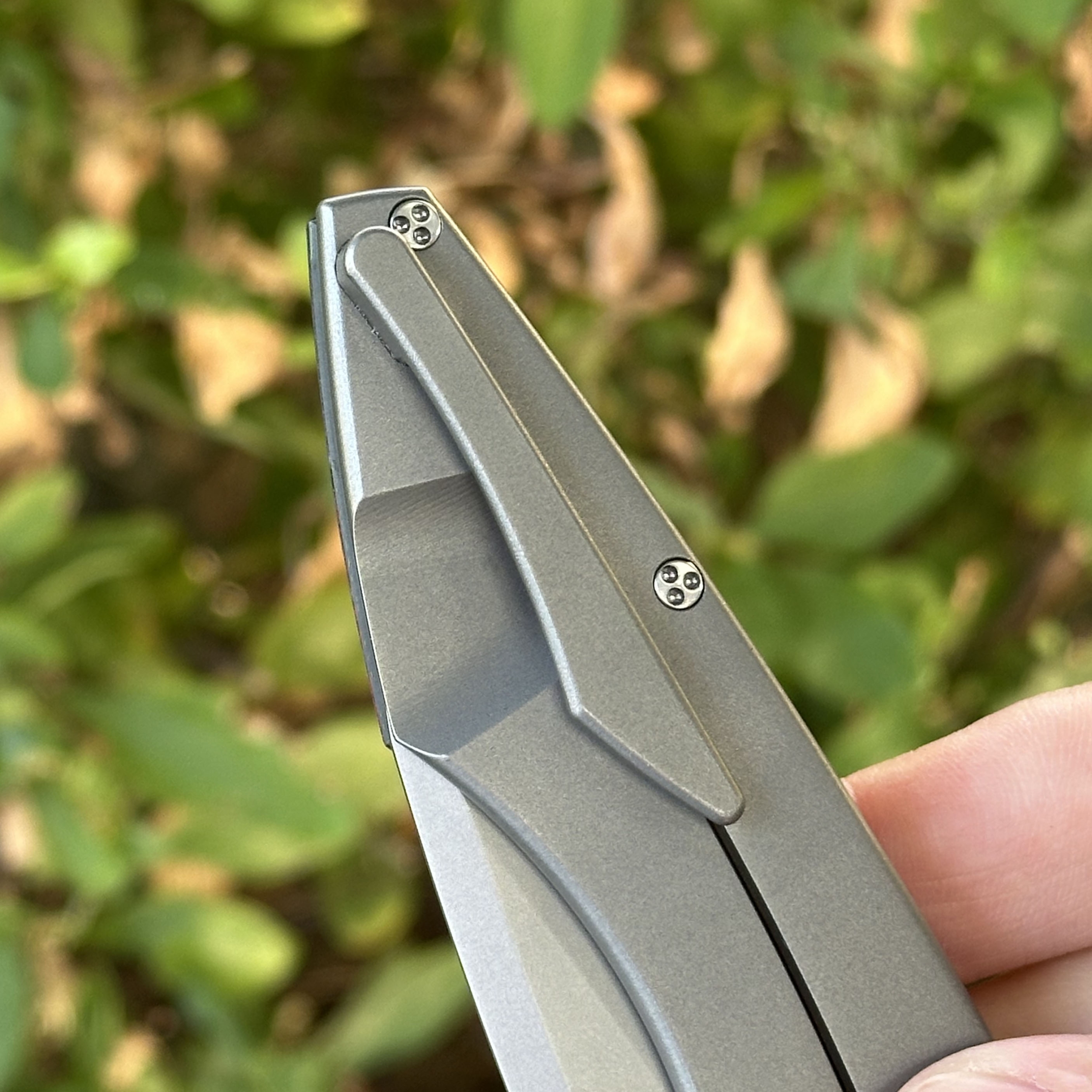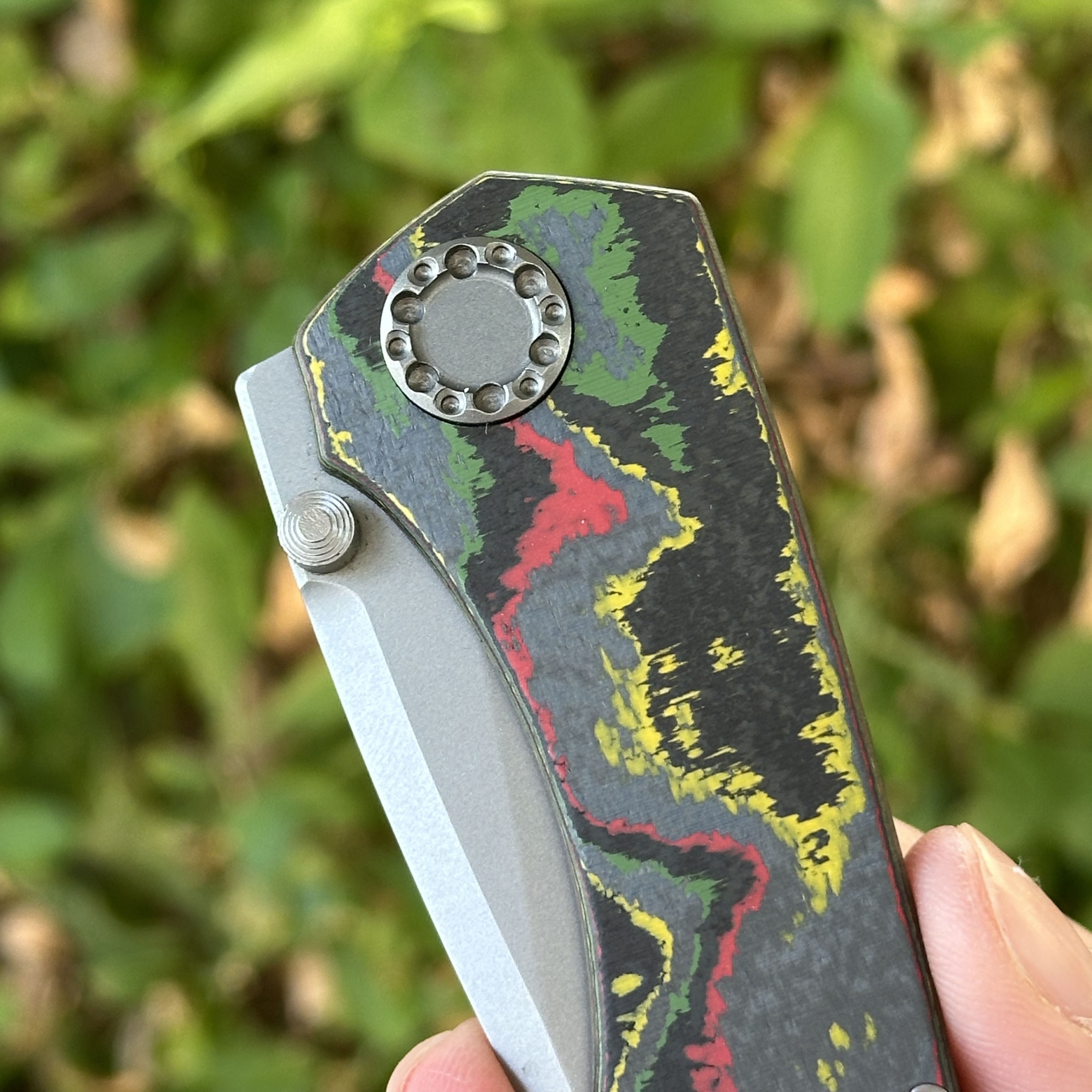 The handle is where this knife separates itself. Built from milled titanium with a blasted finish, it features contoured edges for comfort, a matching milled titanium pocket clip, and a machined titanium backspacer. The show side is finished with Rasta Camo, giving it a custom personality without turning it into a novelty piece.