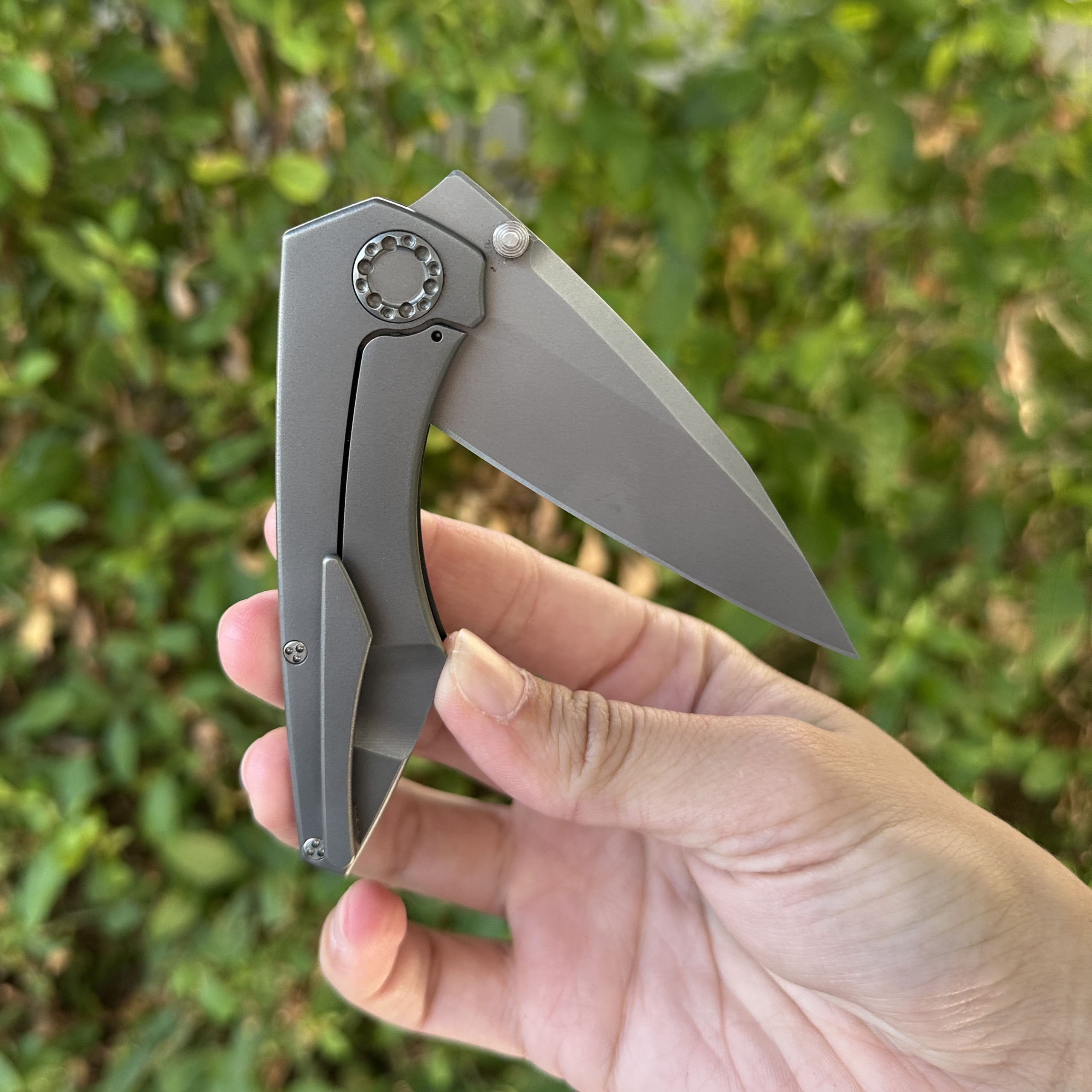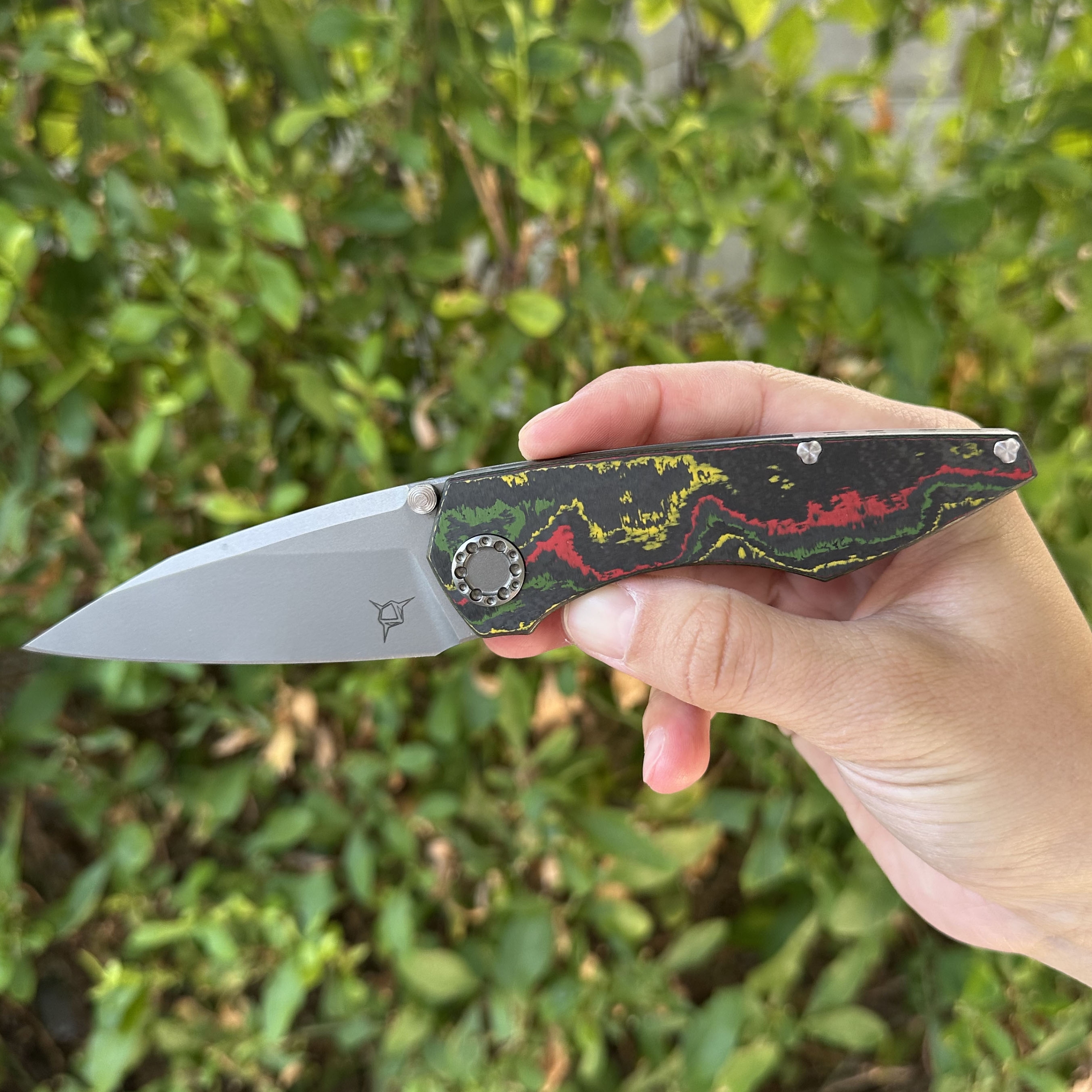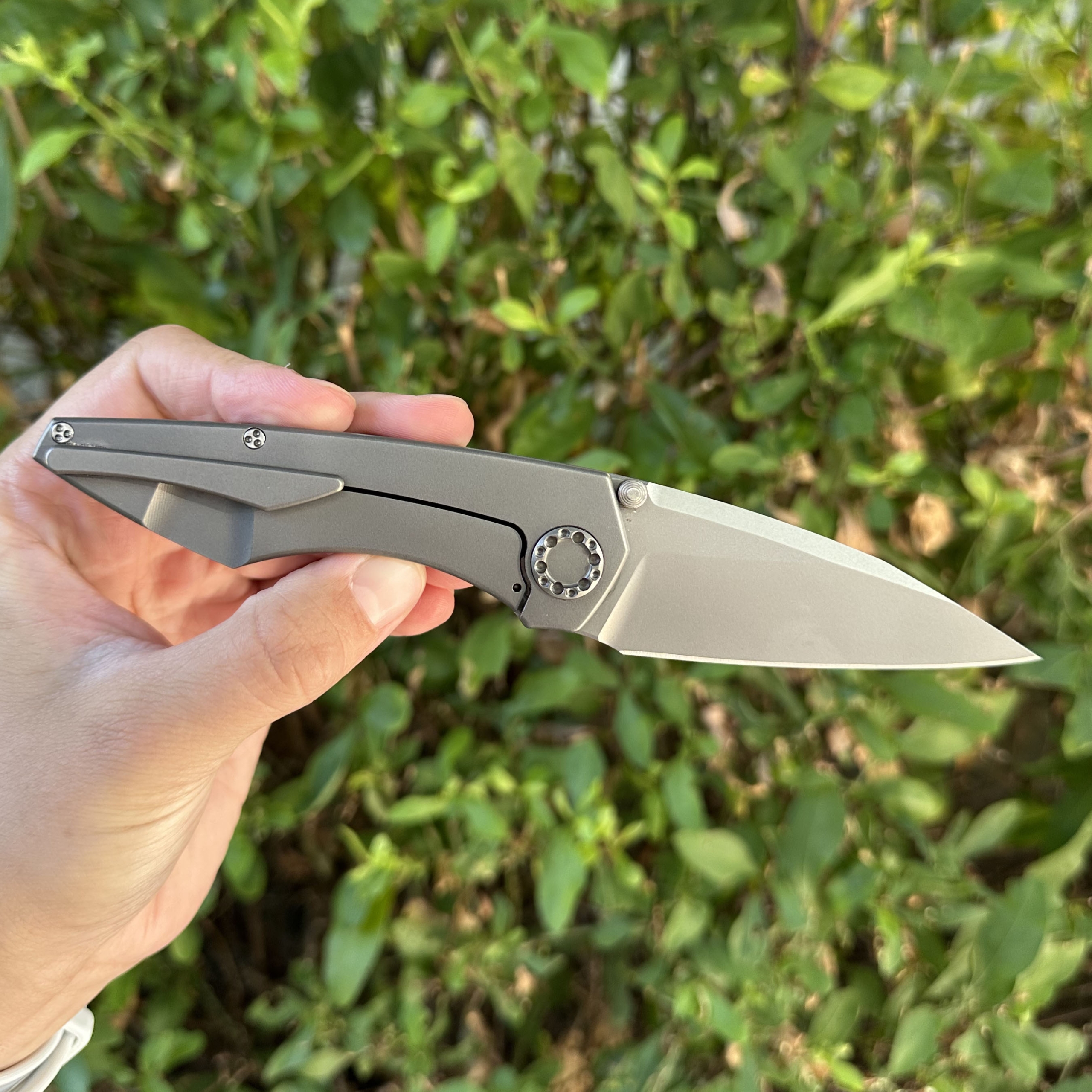 The handle is where this knife separates itself. Built from milled titanium with a blasted finish, it features contoured edges for comfort, a matching milled titanium pocket clip, and a machined titanium backspacer. The show side is finished with Rasta Camo, giving it a custom personality without turning it into a novelty piece.