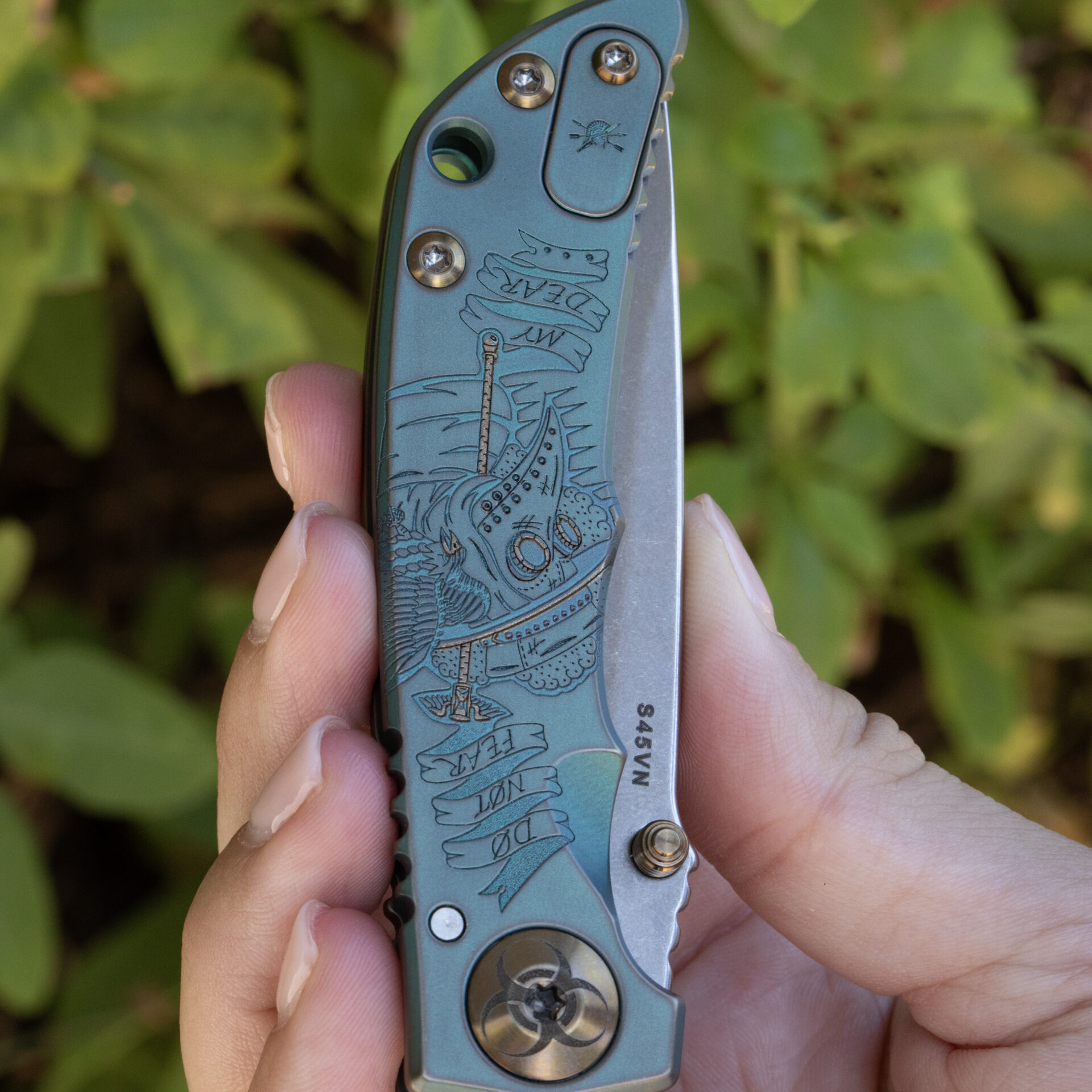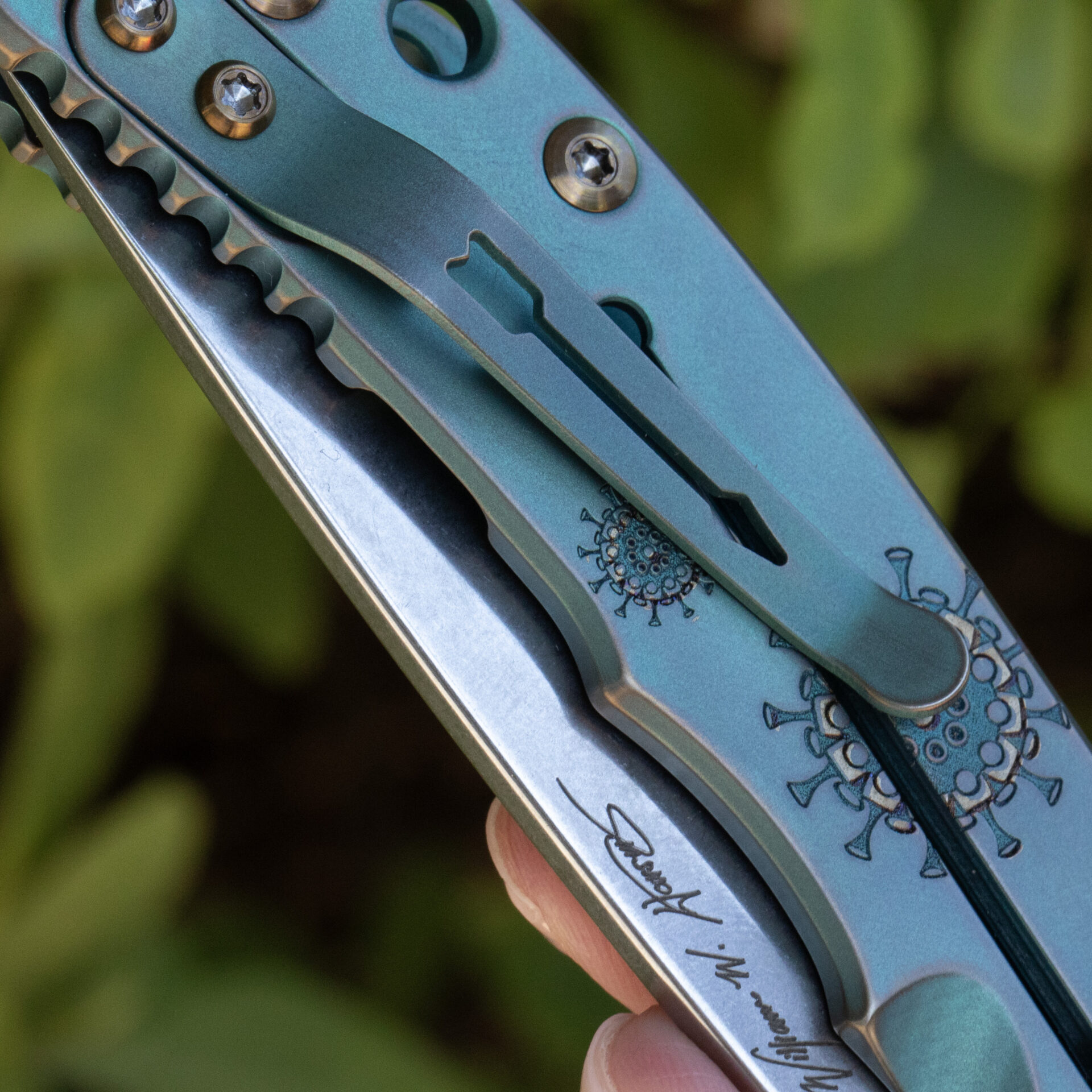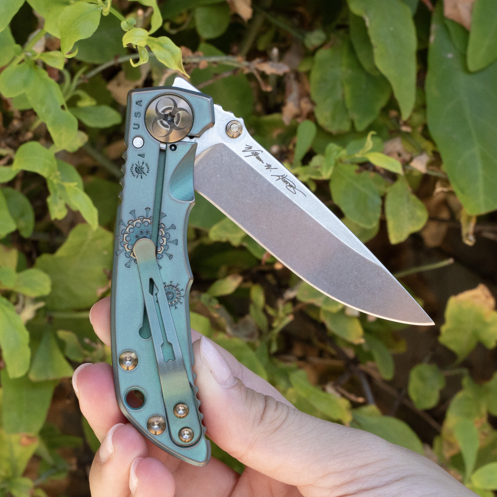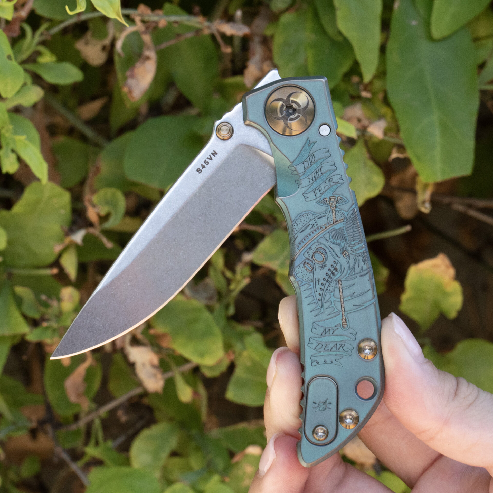 | Handle Material | Anodized Titanium, Plague Doctor Engravin |