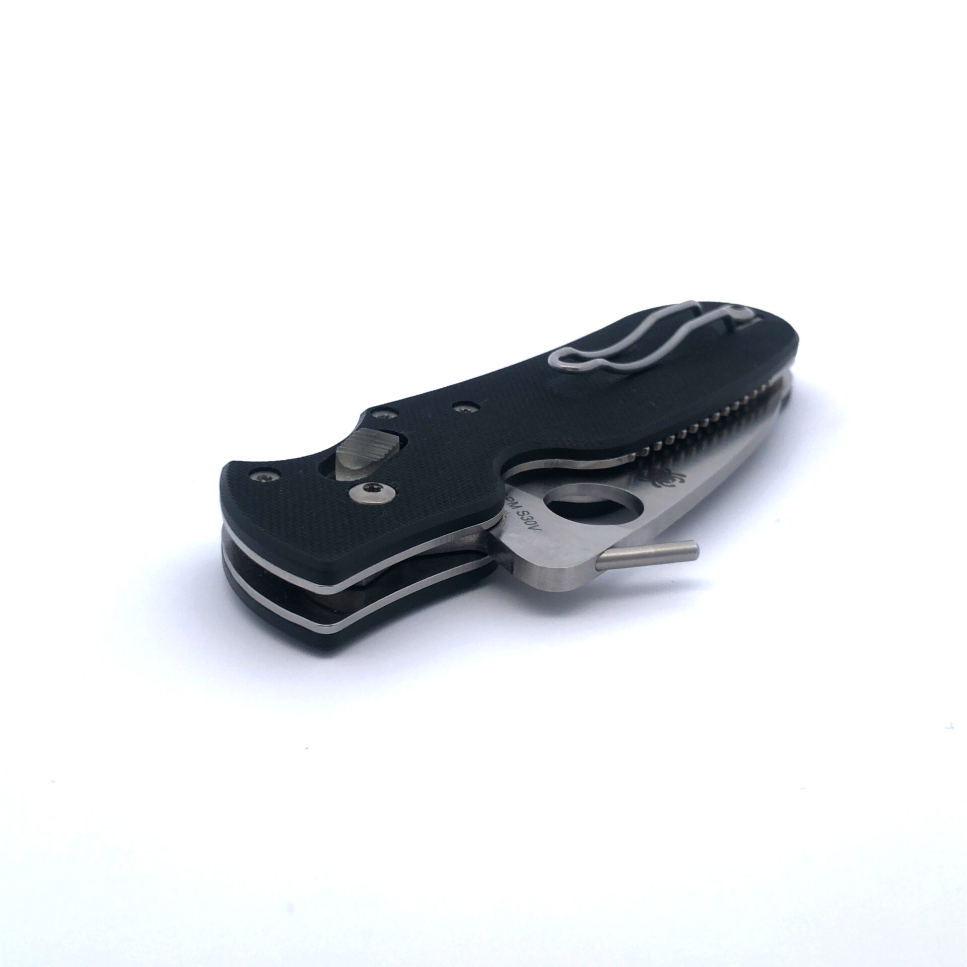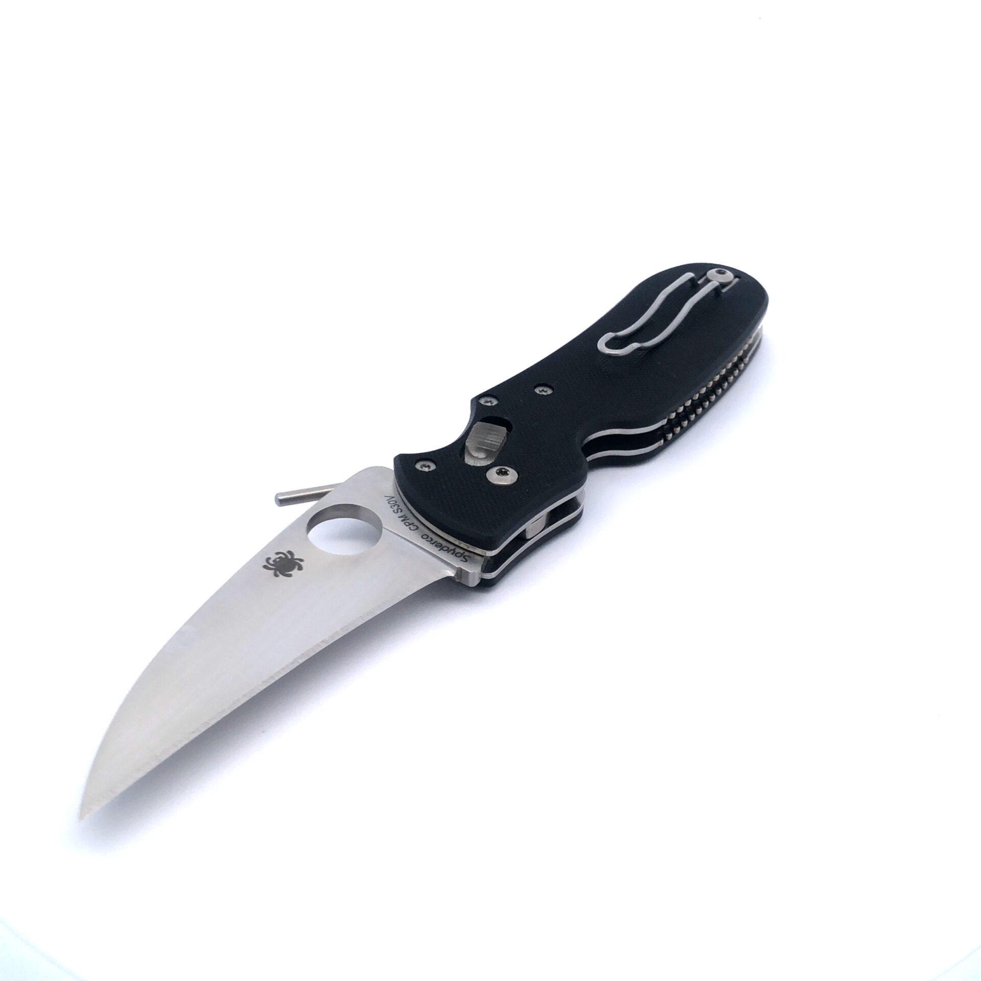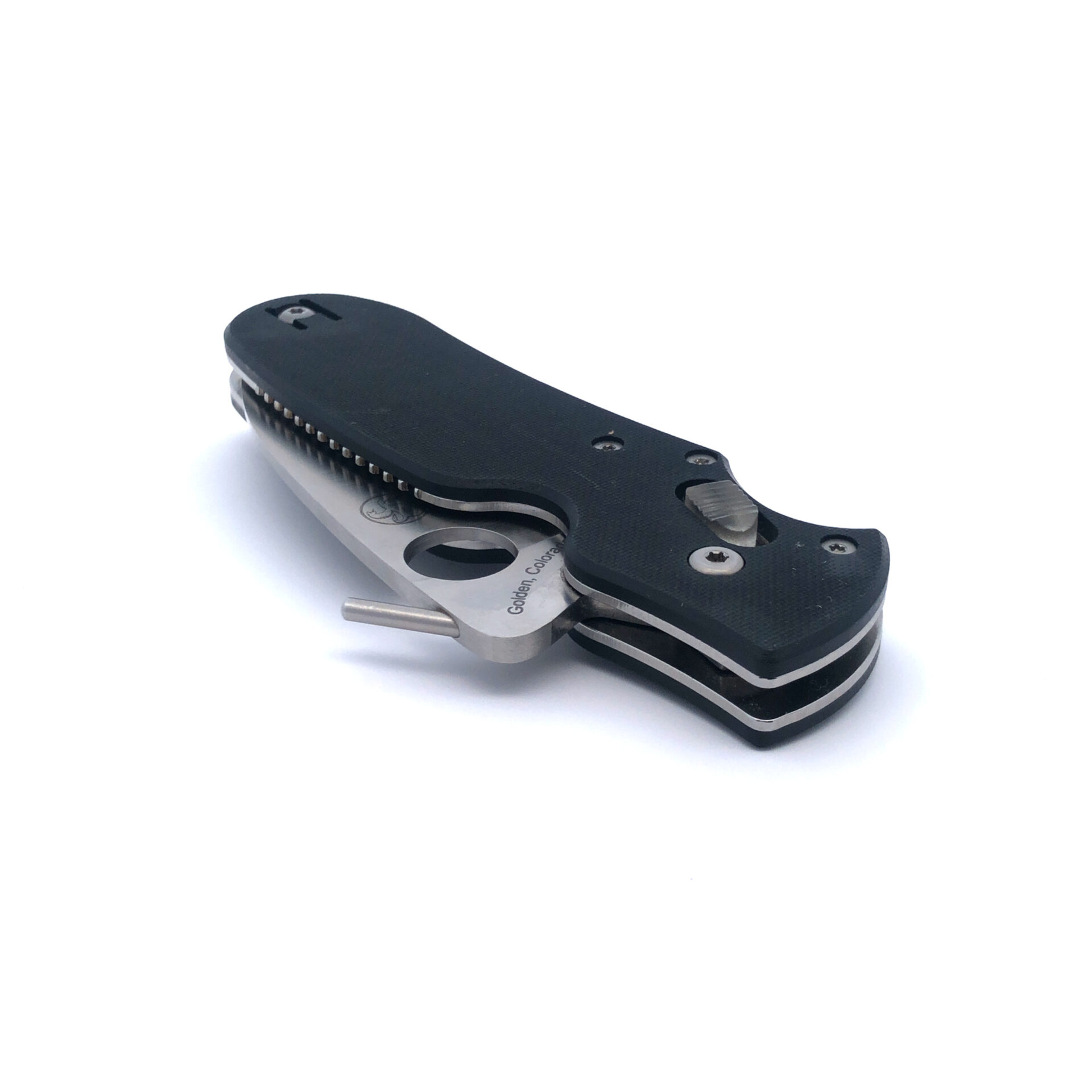 As a “reverse-edge” tool, the P’Kal’s handle is ergonomically designed to be held with the sharpened edge facing inward toward the user to facilitate powerful pulling cuts. The handle’s skeletonized full stainless steel liners are capped by textured black G-10 laminate scales and house Spyderco’s patented Ball Bearing Lock™—an extremely strong lock mechanism that is also completely ambidextrous. To support all appropriate carry and deployment methods, the P’Kal also features a reversible steel wire clip that provides tip-up, edge-forward and edge-back carry on both the left and right sides.