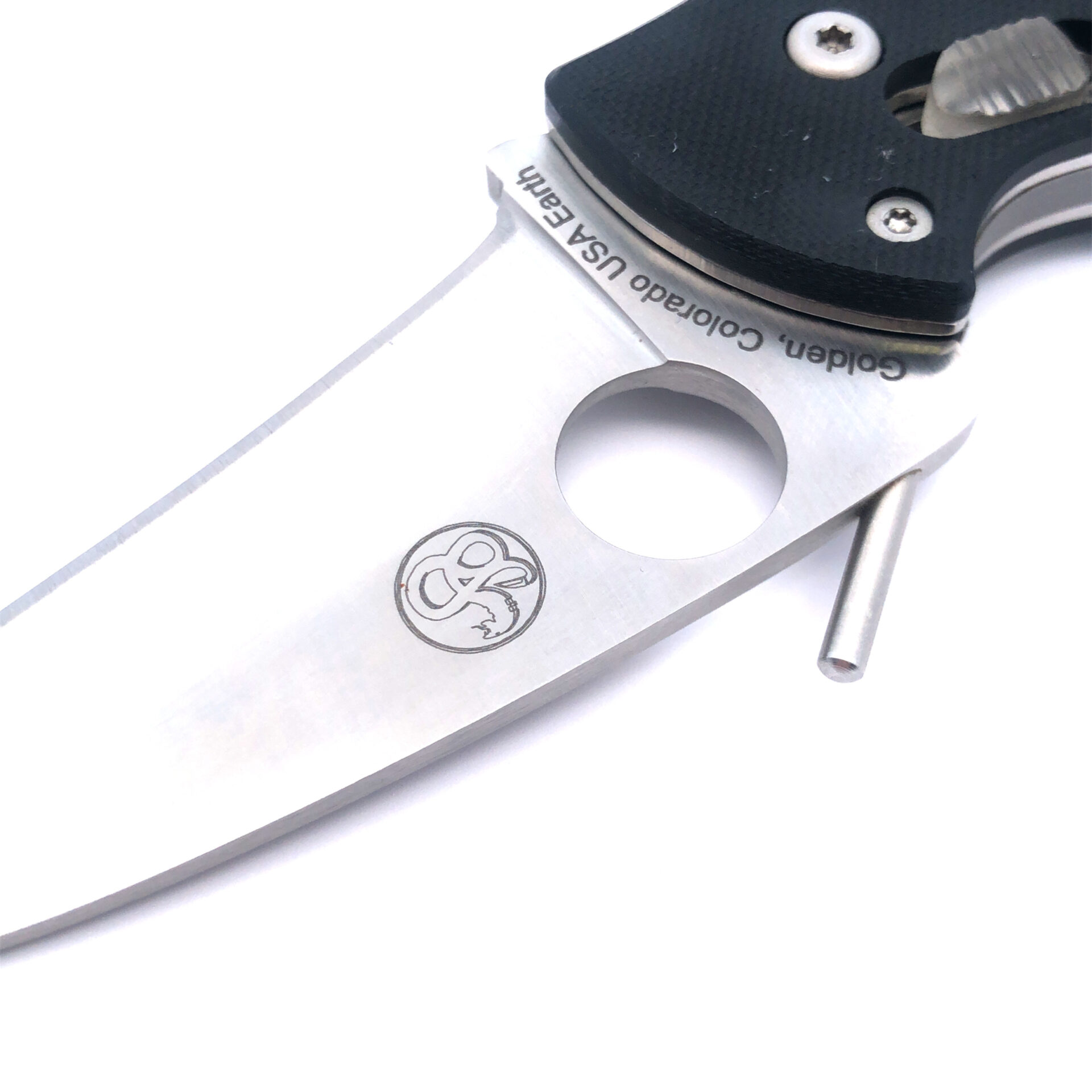 The P’Kal’s PlainEdge™ blade is full-flat ground from CPM® S30V® stainless steel and features a slightly curved edge for impressive cutting power. A removable post-style Emerson Opening feature provides amazingly fast one-handed blade opening by hooking on the pocket during the draw. It can also be opened manually with the Trademark Round Hole™.