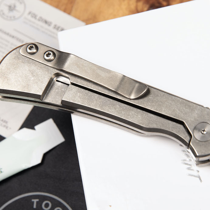 The titanium handle with a solid frame lock keeps everything rigid and dependable, while the slim profile makes it easy to carry without printing or feeling bulky. A right-hand, tip-up pocket clip keeps the Merchant ready to deploy when you need it most.